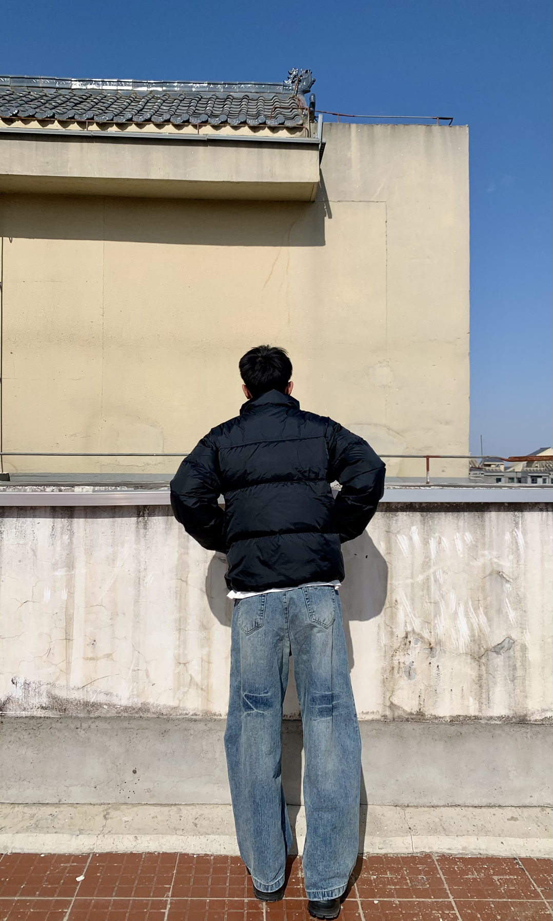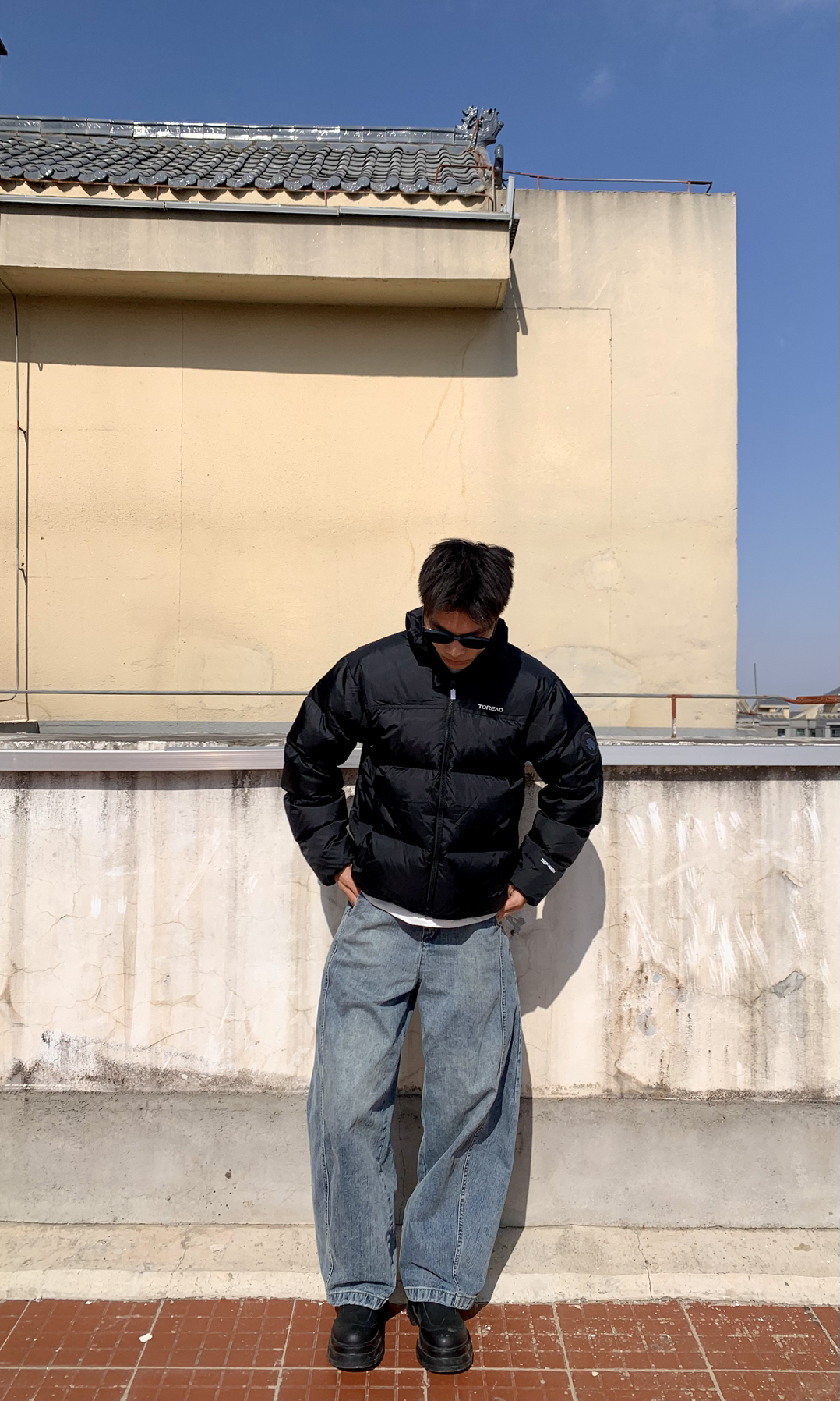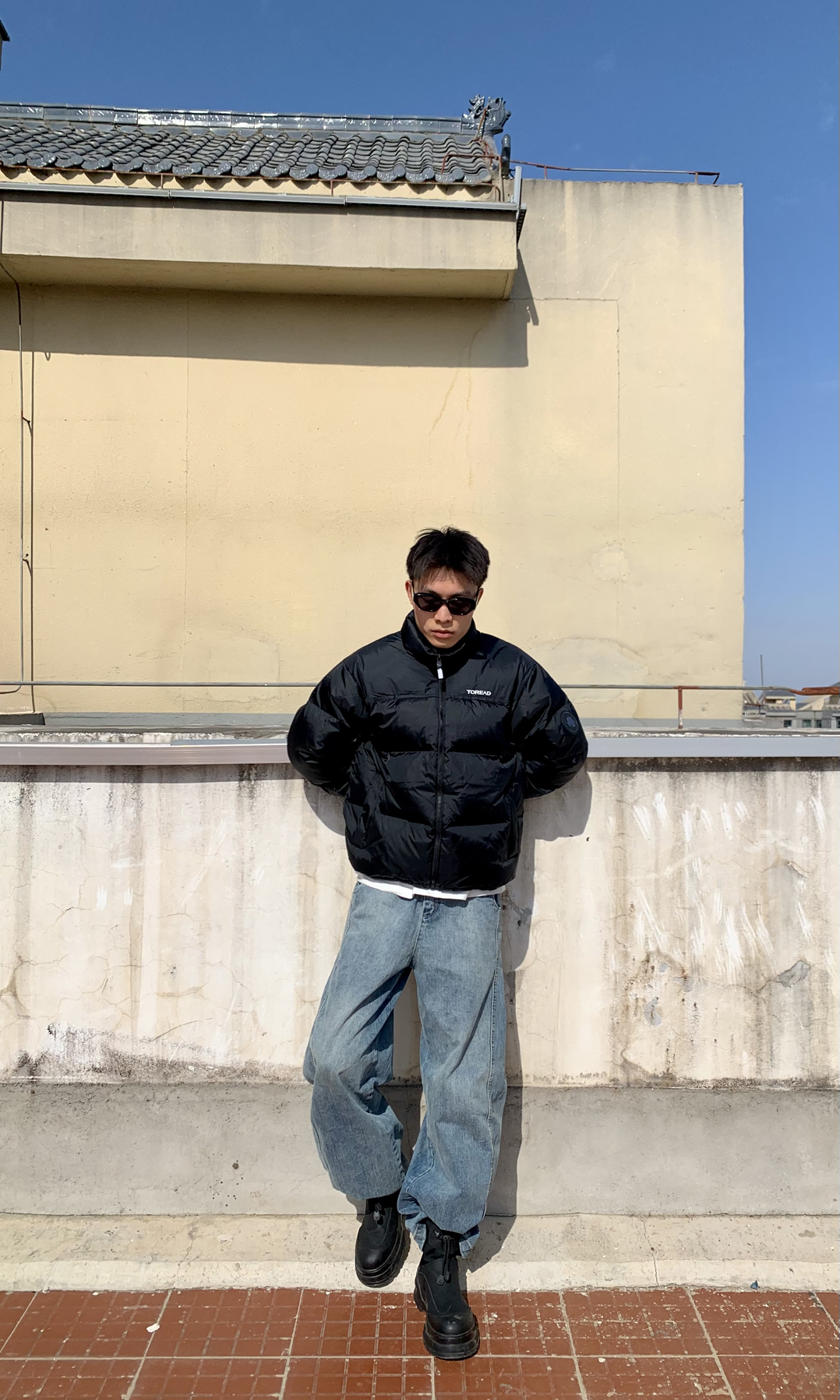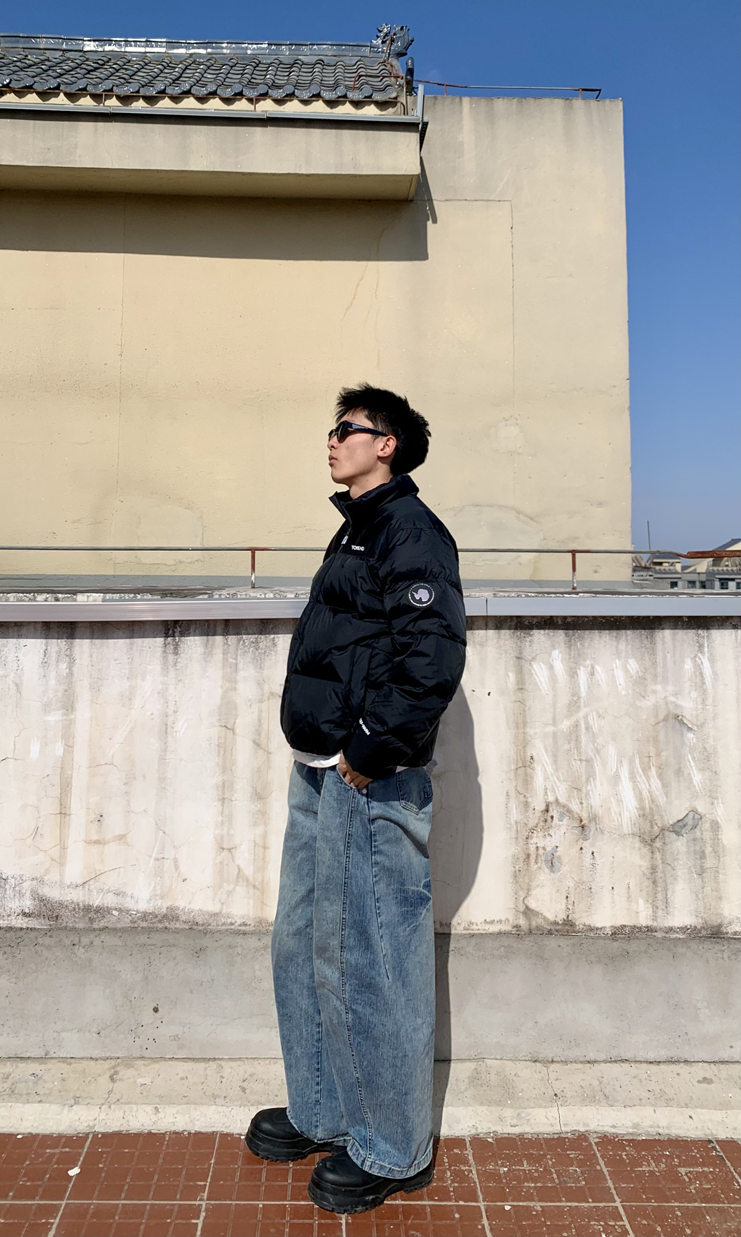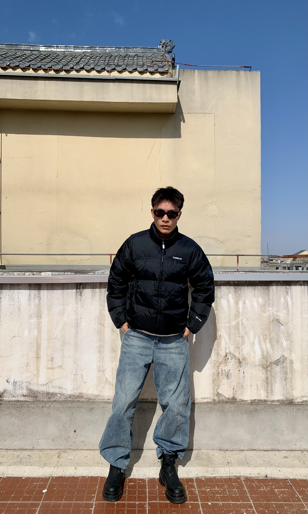 身高|体重:183/120 👔 上衣:探路者黑色短款防风保暖羽绒服 👖 下装:浅色水洗阔腿弯刀牛仔长裤 👟 鞋子:黑色高帮雪地靴
