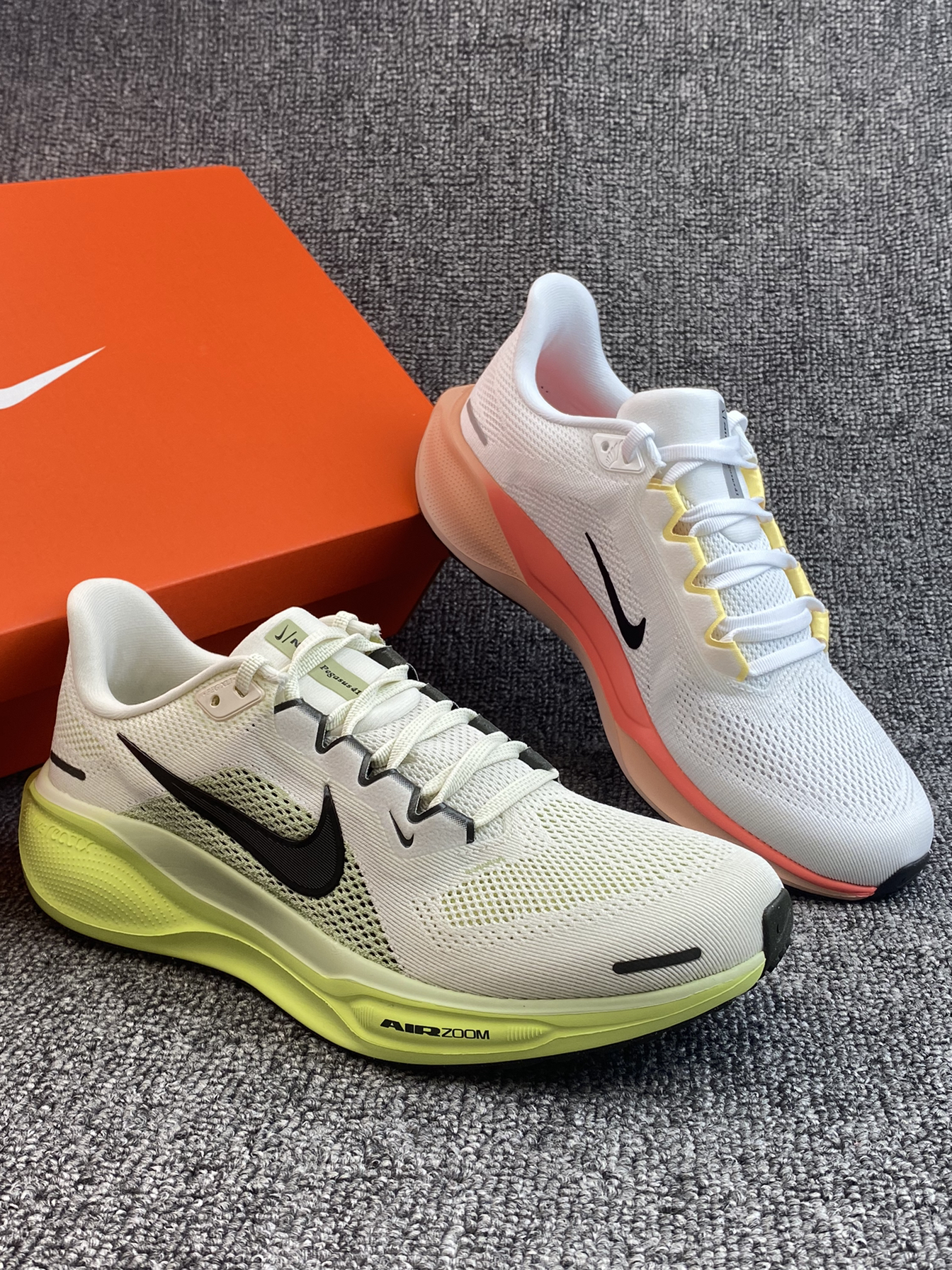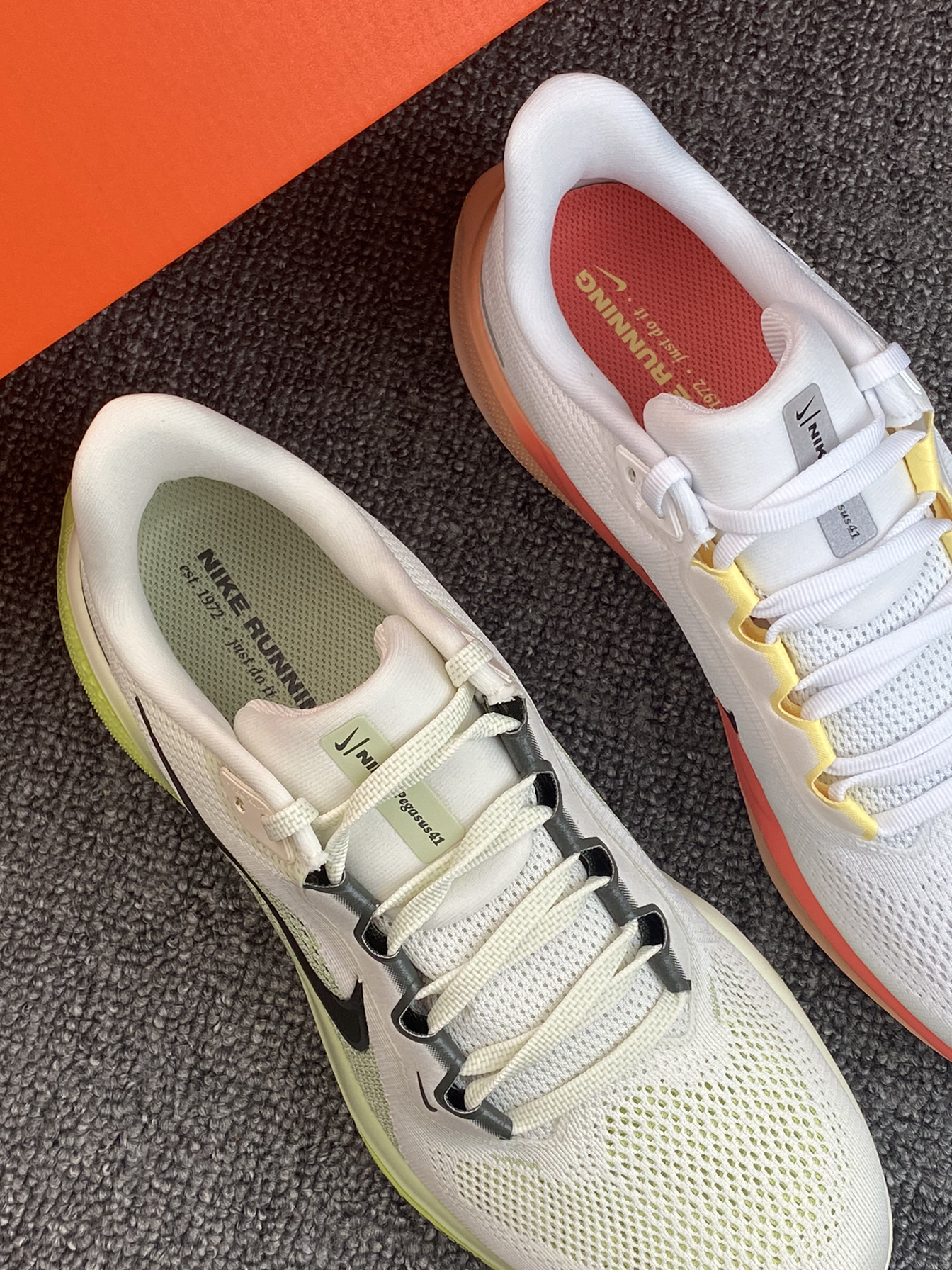 哈喽👋这里是老歌啊 今日分享一下这两双飞马41的新配色哇 新年的第一双鸳鸯鞋是飞马41给的哈哈哈(bushi 其实是两个配色啦,不过两个配色搭配一下还挺和谐 白黄黑的整体看上去会更小清新些 而白橙的则是更粉色系一点,我觉得很有个性 新年开年穿着飞马41也是不错的选择呀✨