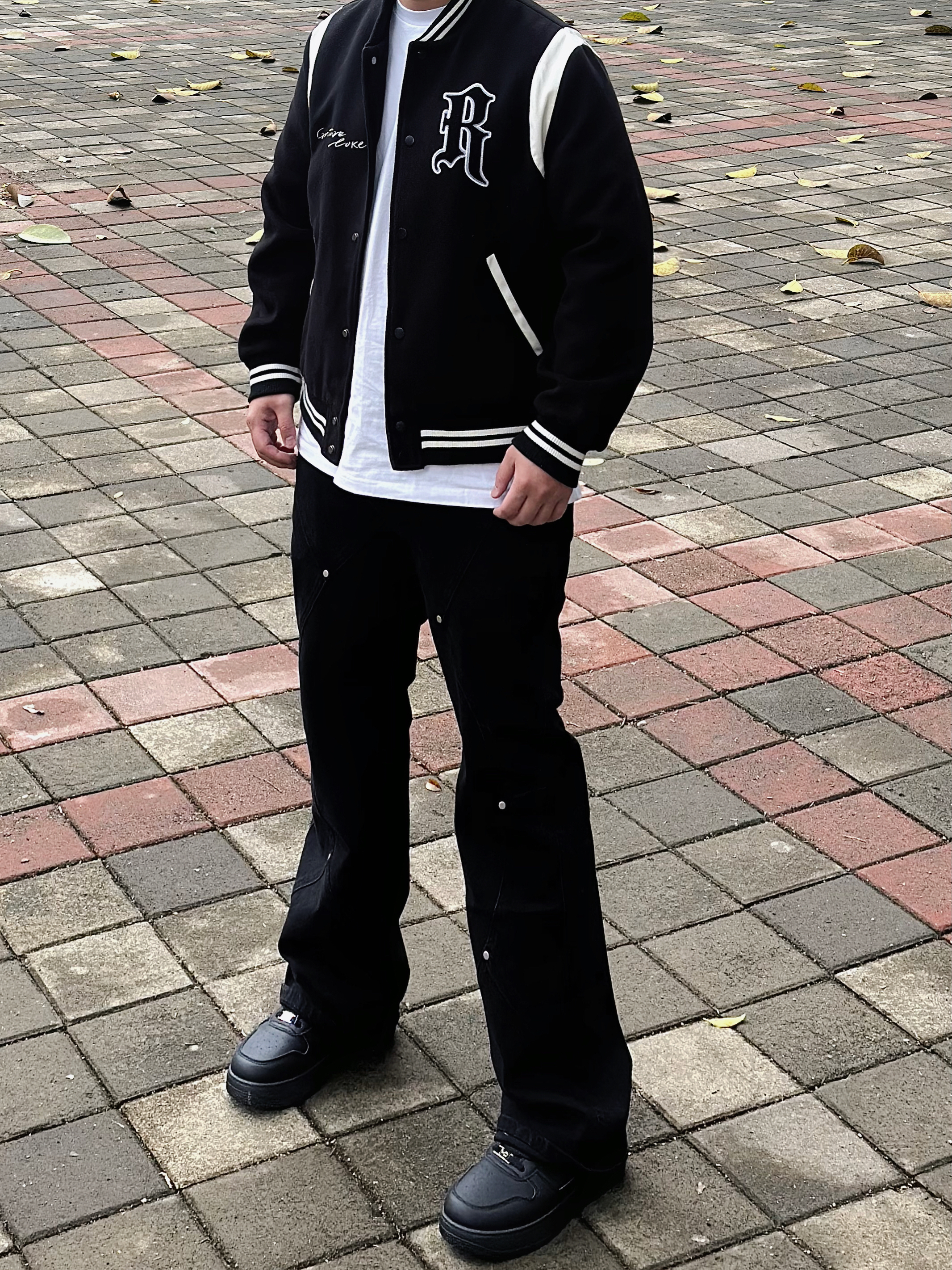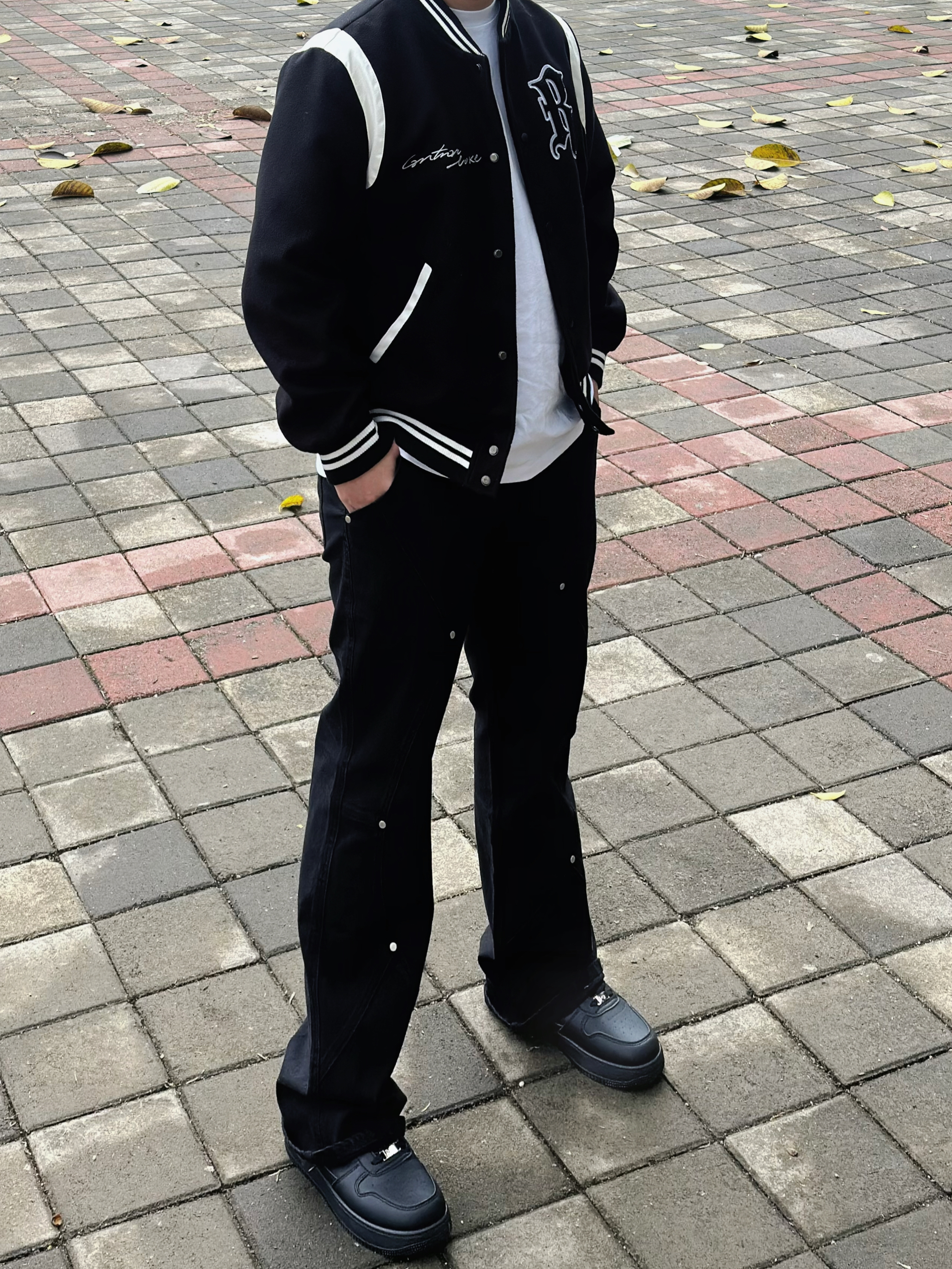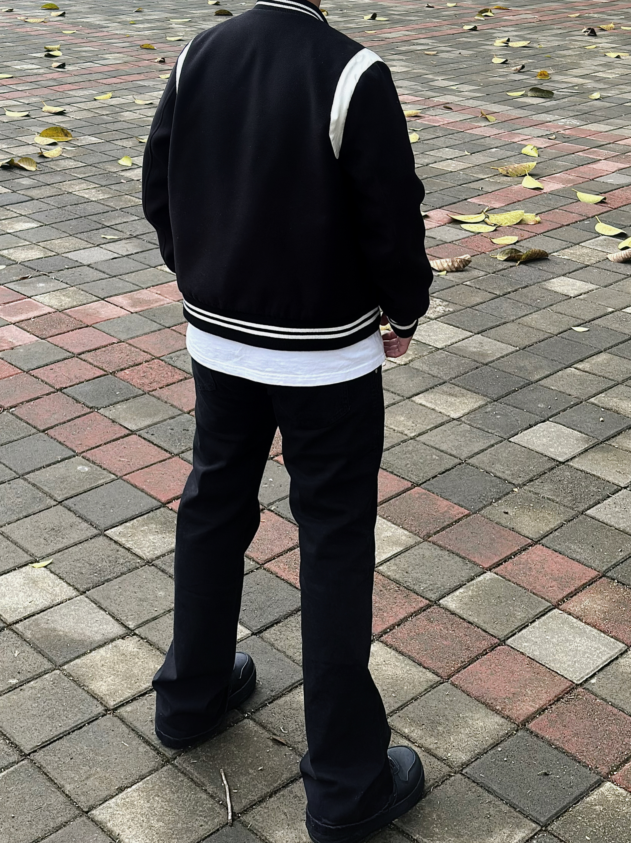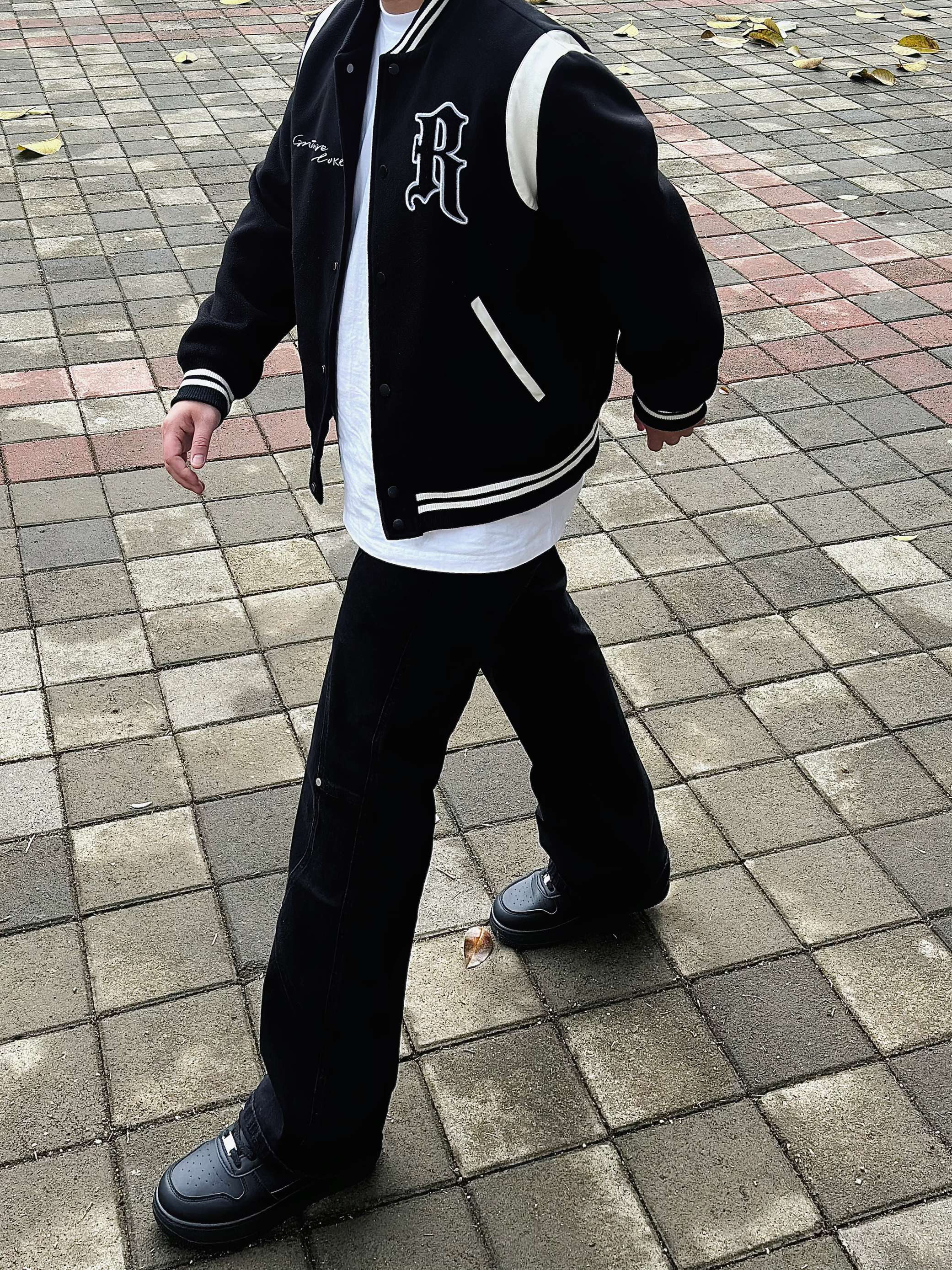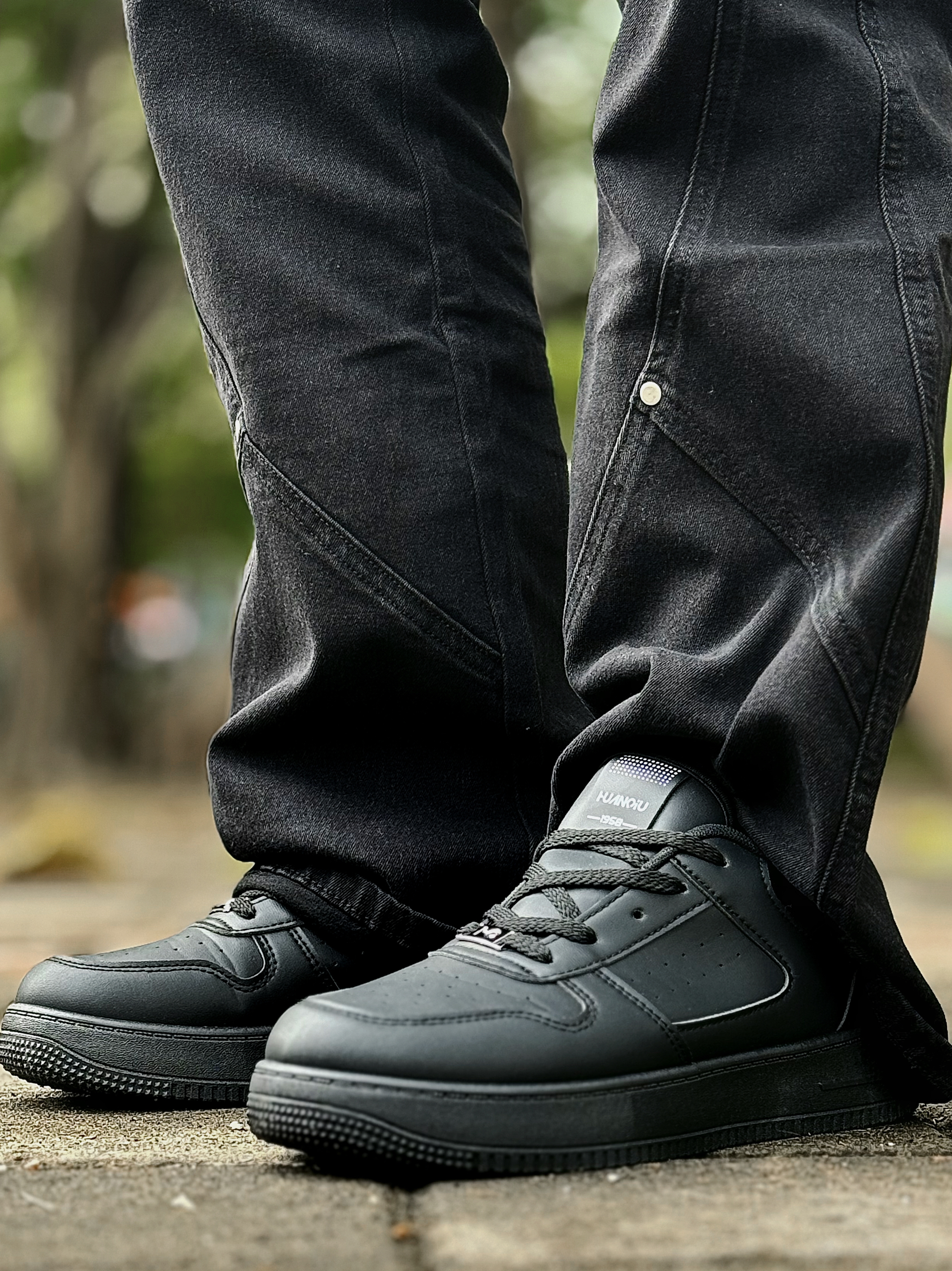那就是环球蛇年限定空军一号 黑武士风格真的好酷非常百搭 耐脏又好打理 非常耐看 脚感软乎乎 今日ootd上身选择搭配黑色棒球夹克 下身裤子选择搭配条高街黑色微喇裤 开学返校这样穿包帅的 !!