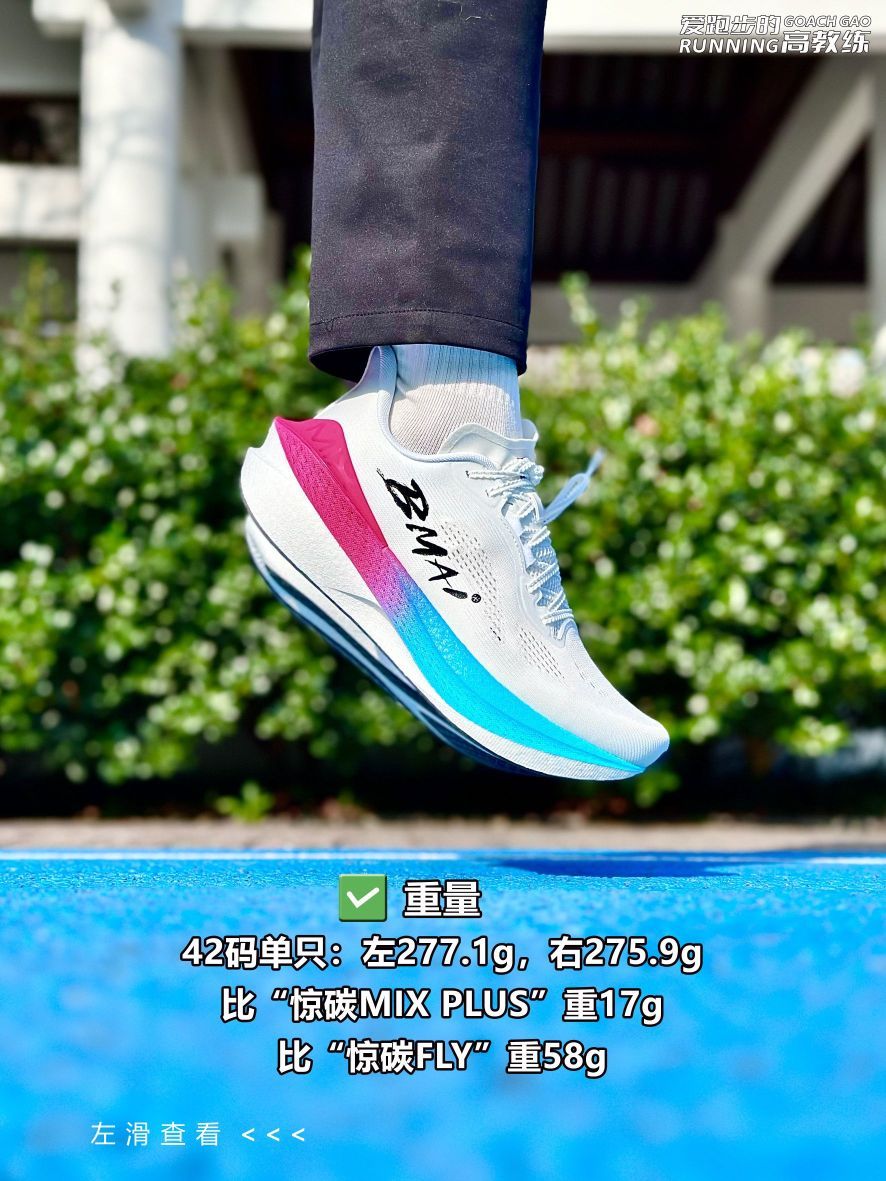 ❤️在跑者眼里,碳板跑鞋一直是精英大神跑者的专属,直到2022年,必迈推出了惊碳MIX,打出了全民碳板的旗号! ❓何为“全民碳板”,通常从两个方面,一是价格亲民,二是驾驭门槛低。 ♻️惊碳MIX经过了3次迭代,来到了2.0,全新外观,中底更厚;那稳定性是否在线,驾驭门槛是否依然亲民呢?下面让我们一起看看! 📝跑鞋数据: ✅鞋重:42码单只左脚277.1g,右脚275.9g; ✅鞋面:贾卡鞋面,大面...