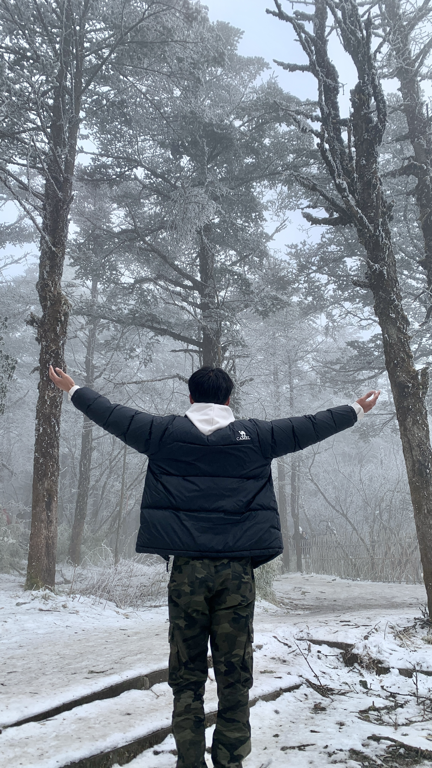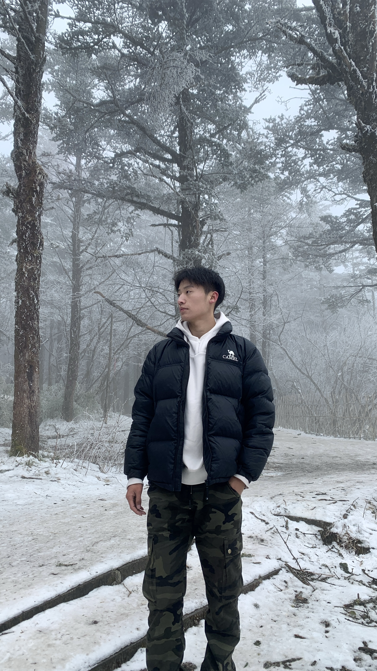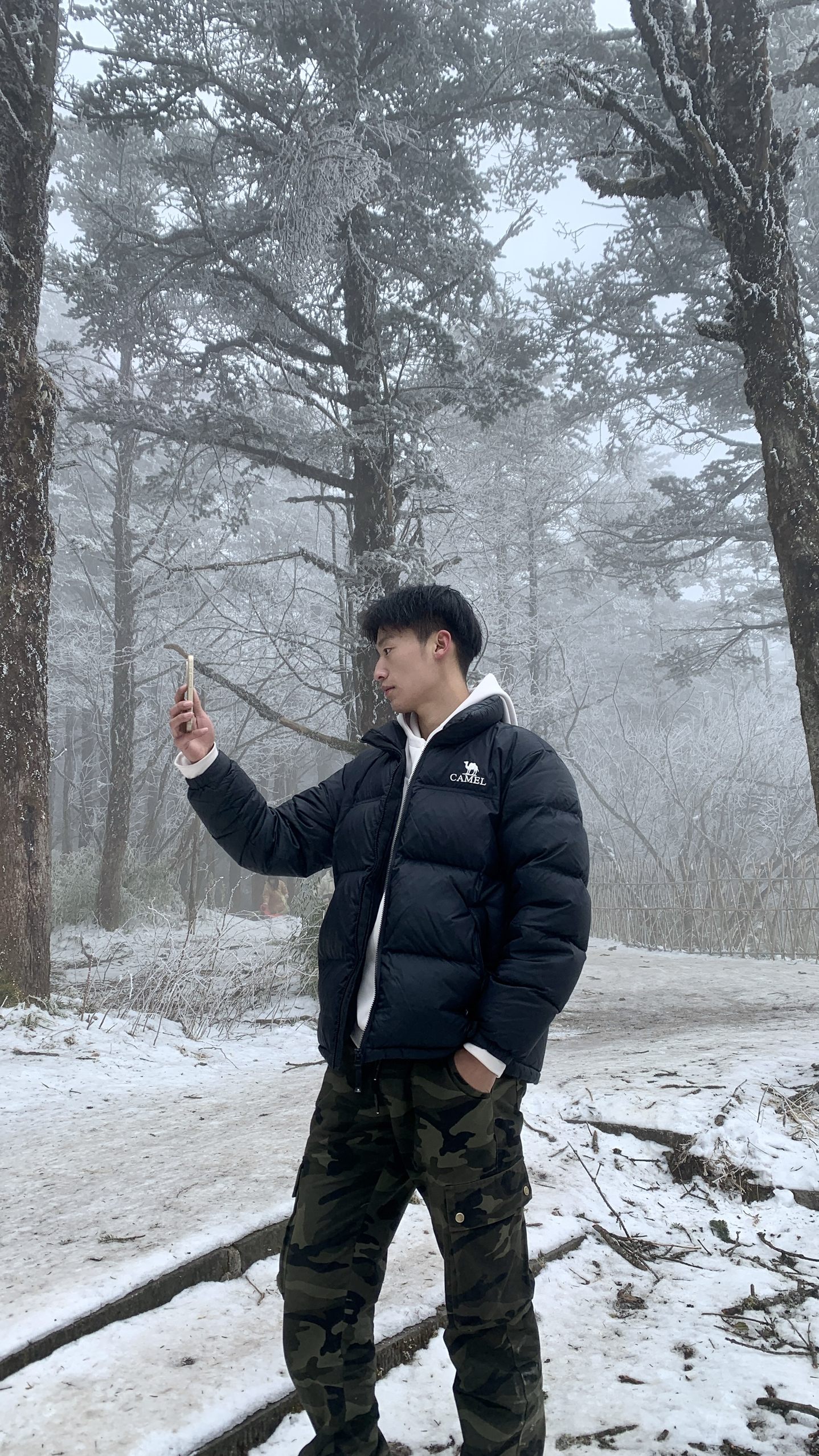 穿了一件骆驼的羽绒服,我不喜欢连帽的,我喜欢这种立体的,穿上以后也非常帅。