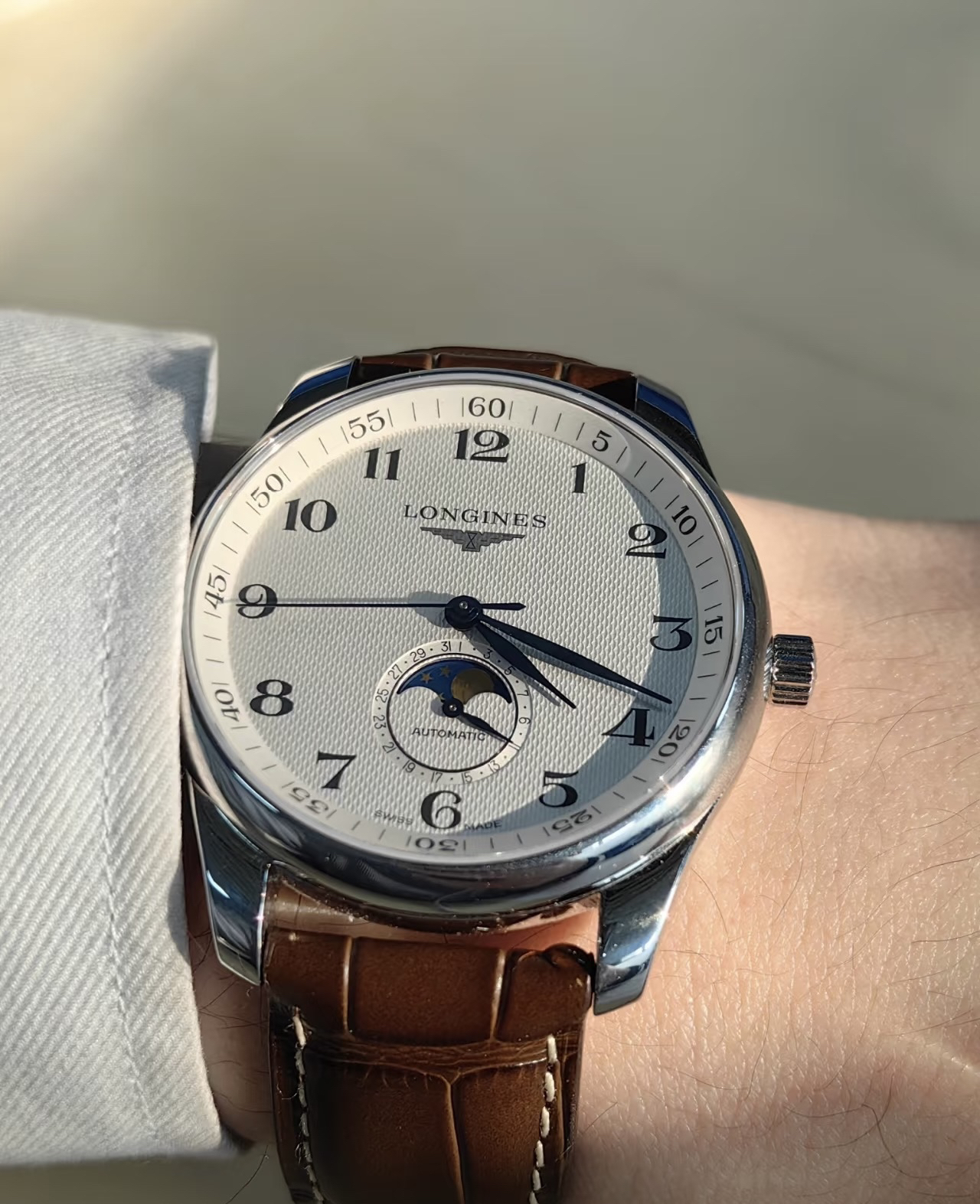浪琴名匠四针月相,买的钢带的,自己换了皮带。 觉得特别的绅士文气,最后还是选了数字版,更加经典百搭。
