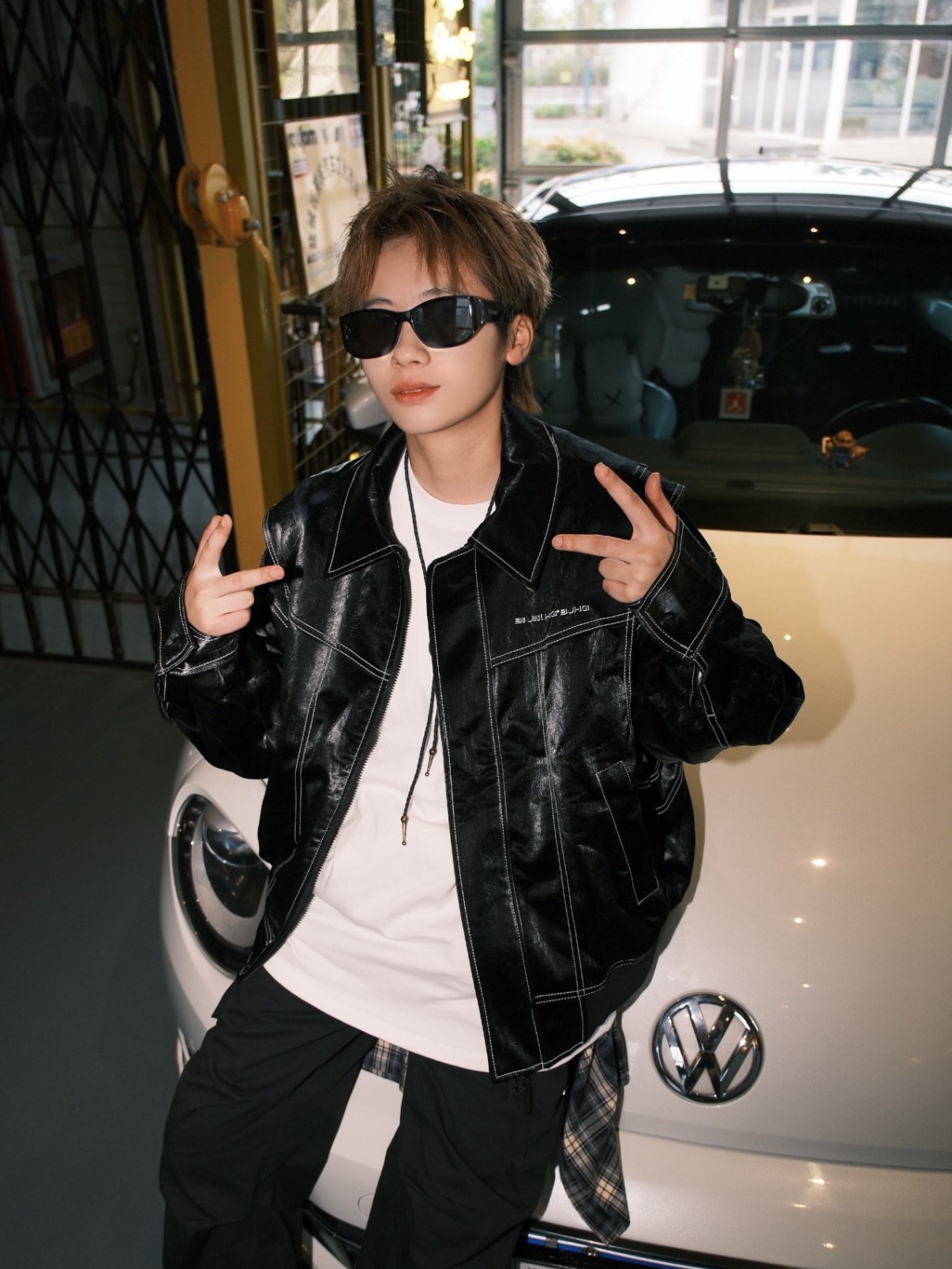 对甲壳虫真的毫无抵抗力 改装过的轮毂也很帅📧 今日份穿搭就来一身酷酷的AIIBlack 一件黑色皮衣搭配黑色阔腿裤🖊️ 撞色走线设计,加上解构拼接的袖子 就很有街头机能感📖 PU皮材质,上身蛮有质感的 @何嘎嘎丶