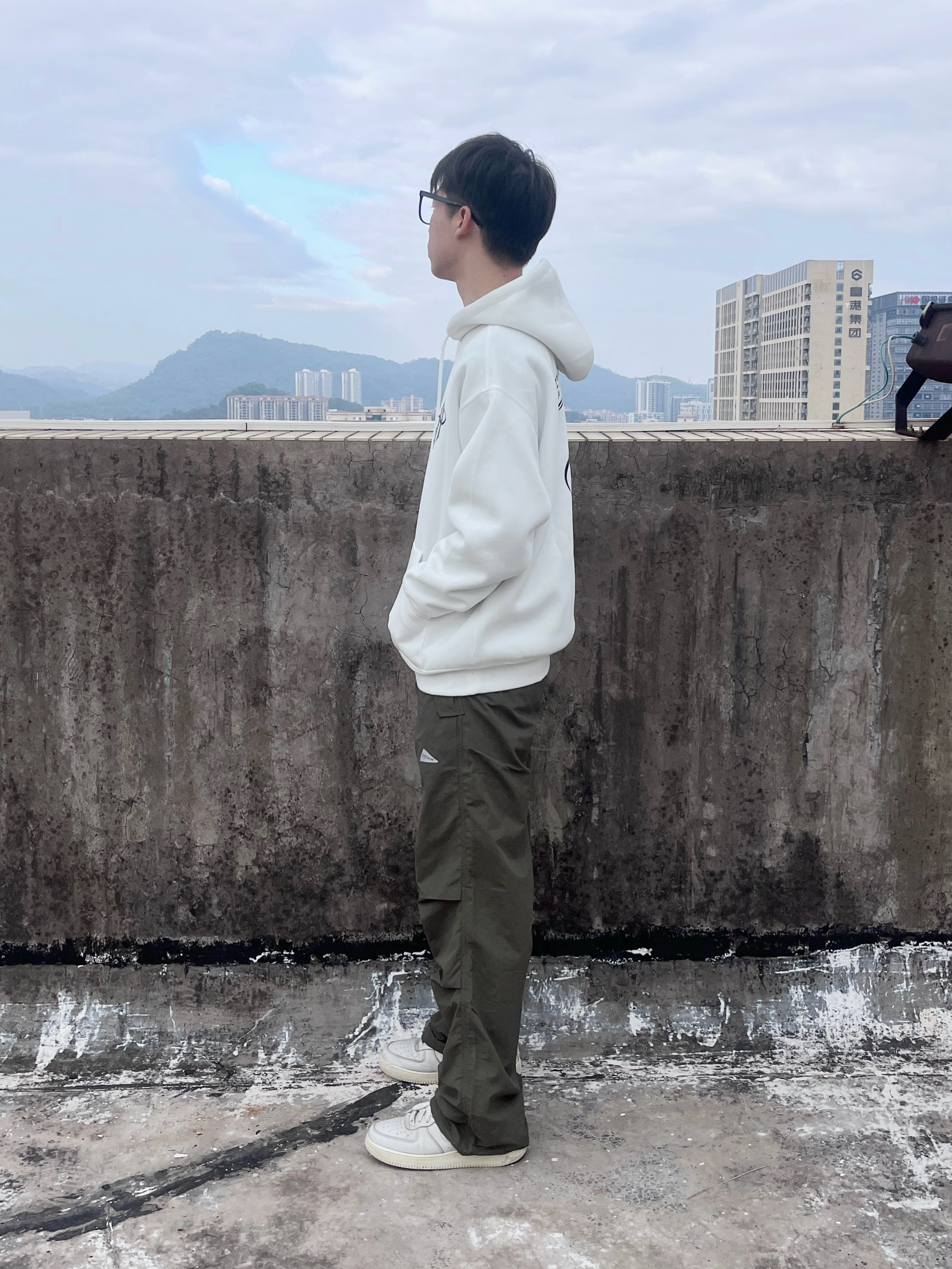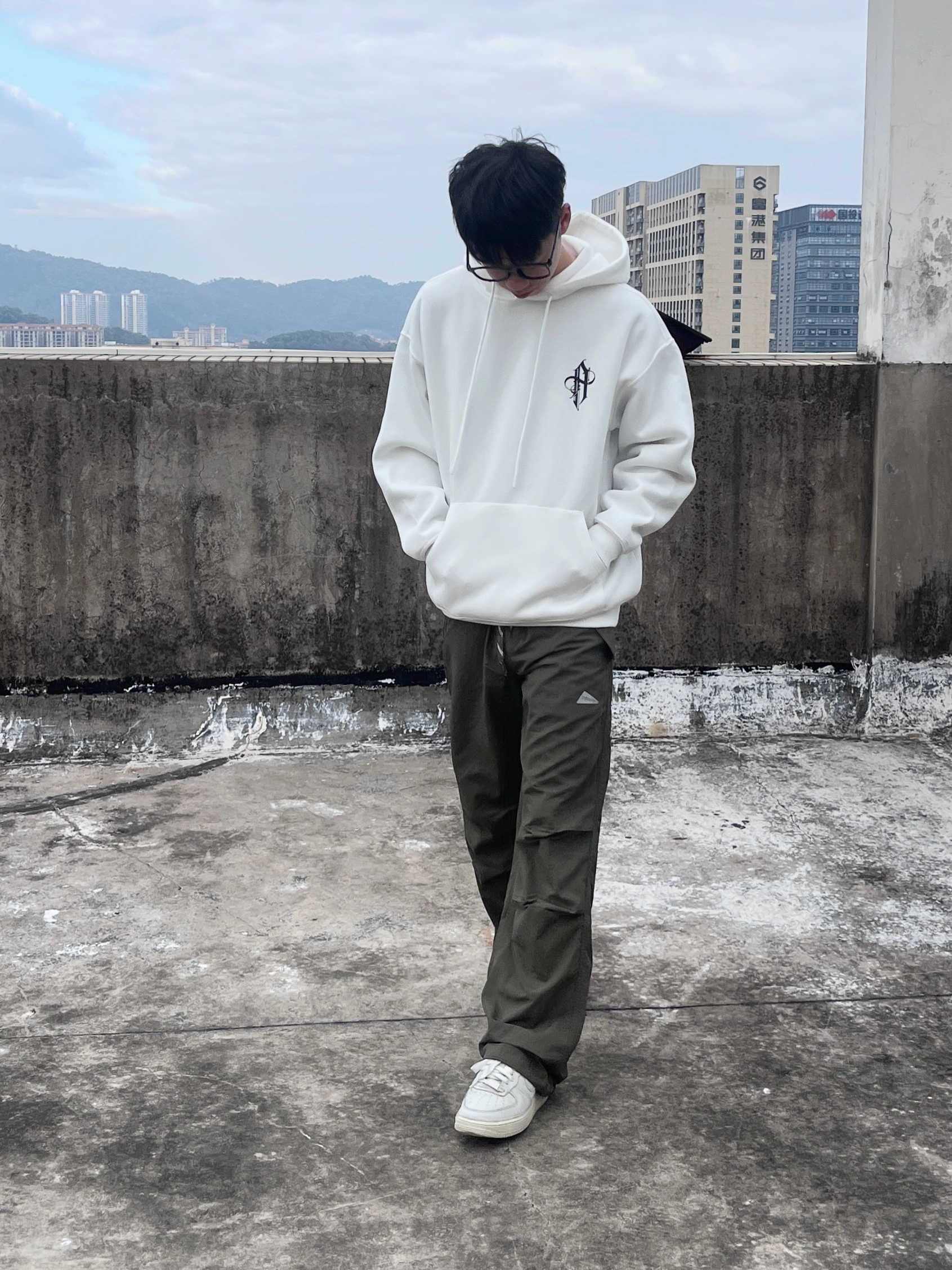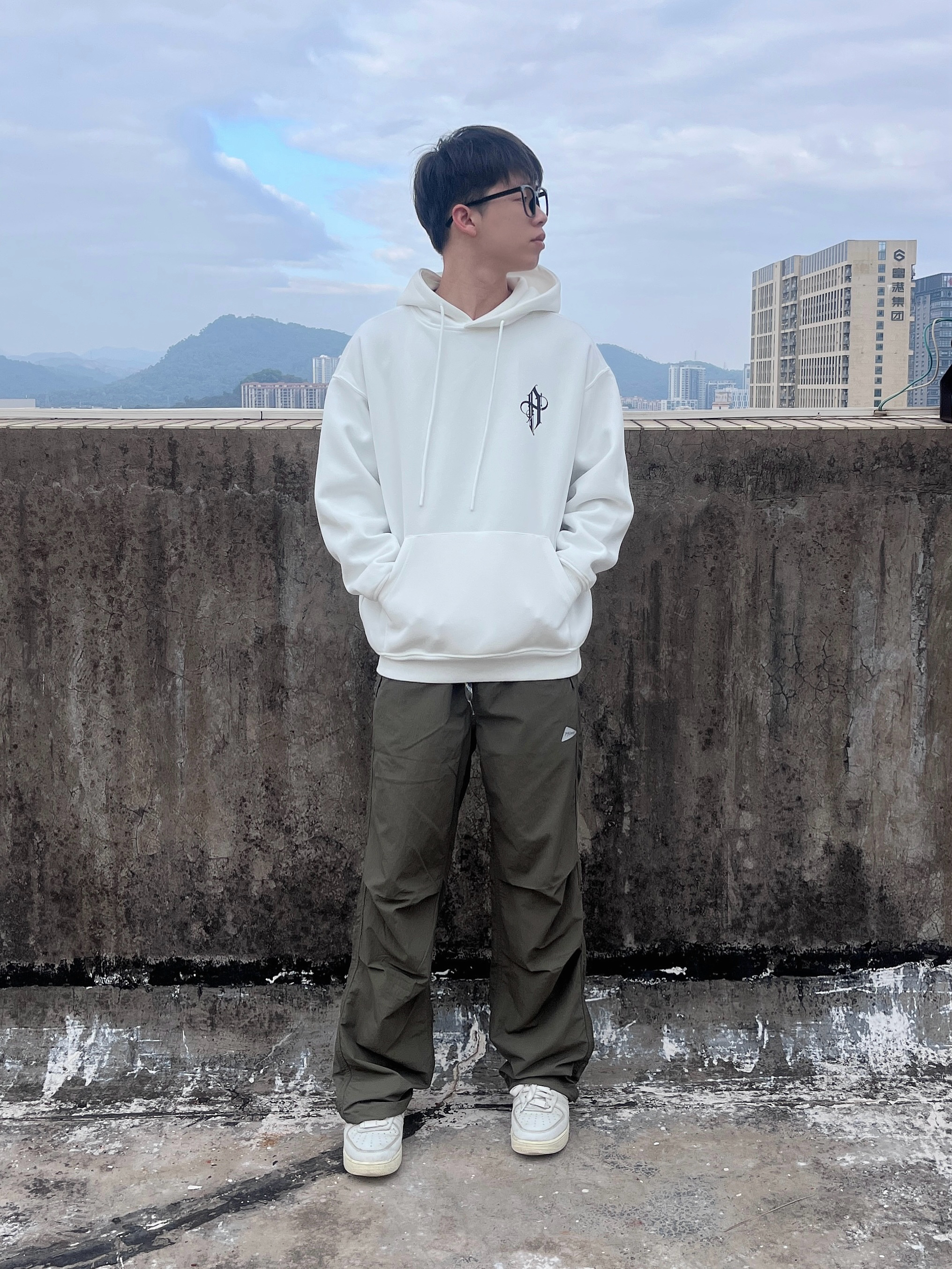 今日份穿搭分享look👀 衣服是白色美式字母印花卫衣 搭配 714STREET 家的军绿色工装裤 版型宽松显瘦 很适合山系户外出行 一套搭配下来 开春出行百搭又好看