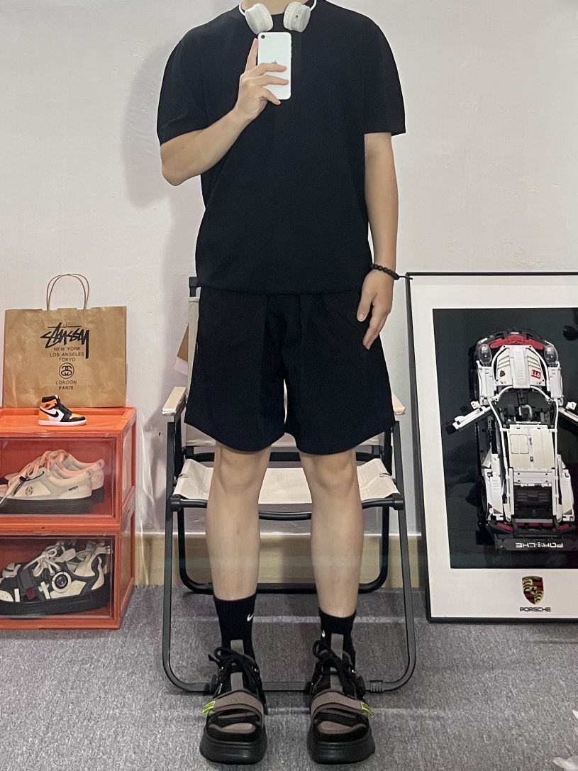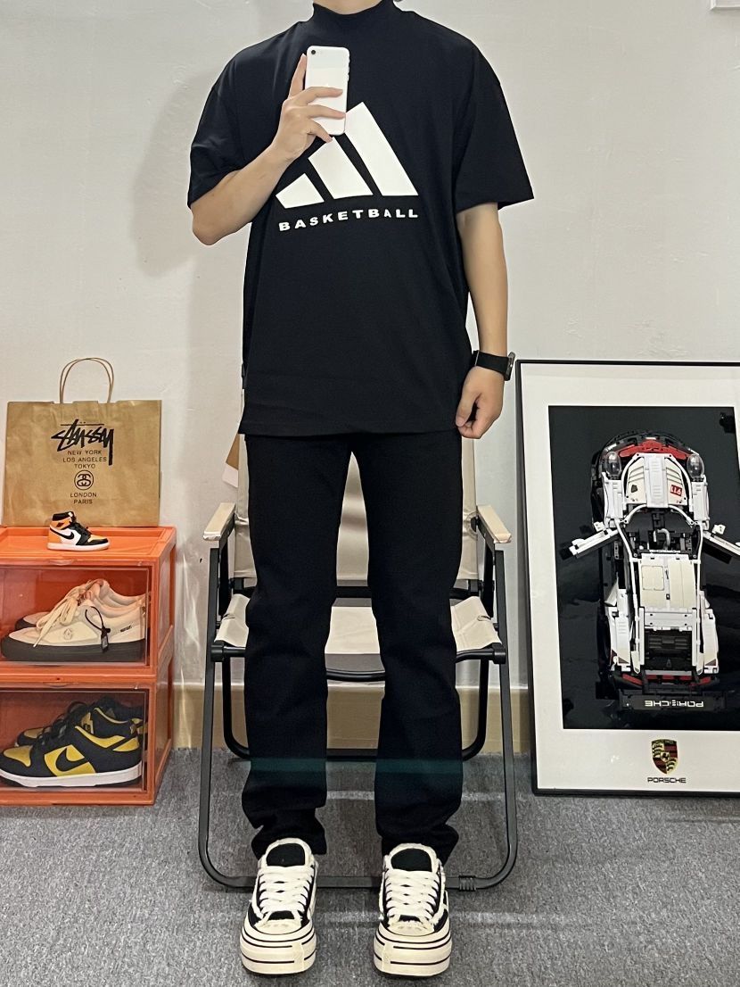 这身纯黑初春穿搭,将男生魅力展现得淋漓尽致。黑色1977半袖搭配黑色lulu家外套,巧妙利用长短对比,增添时尚感,脚下黑色高帮帆布鞋,潮流又个性,魅力十足。