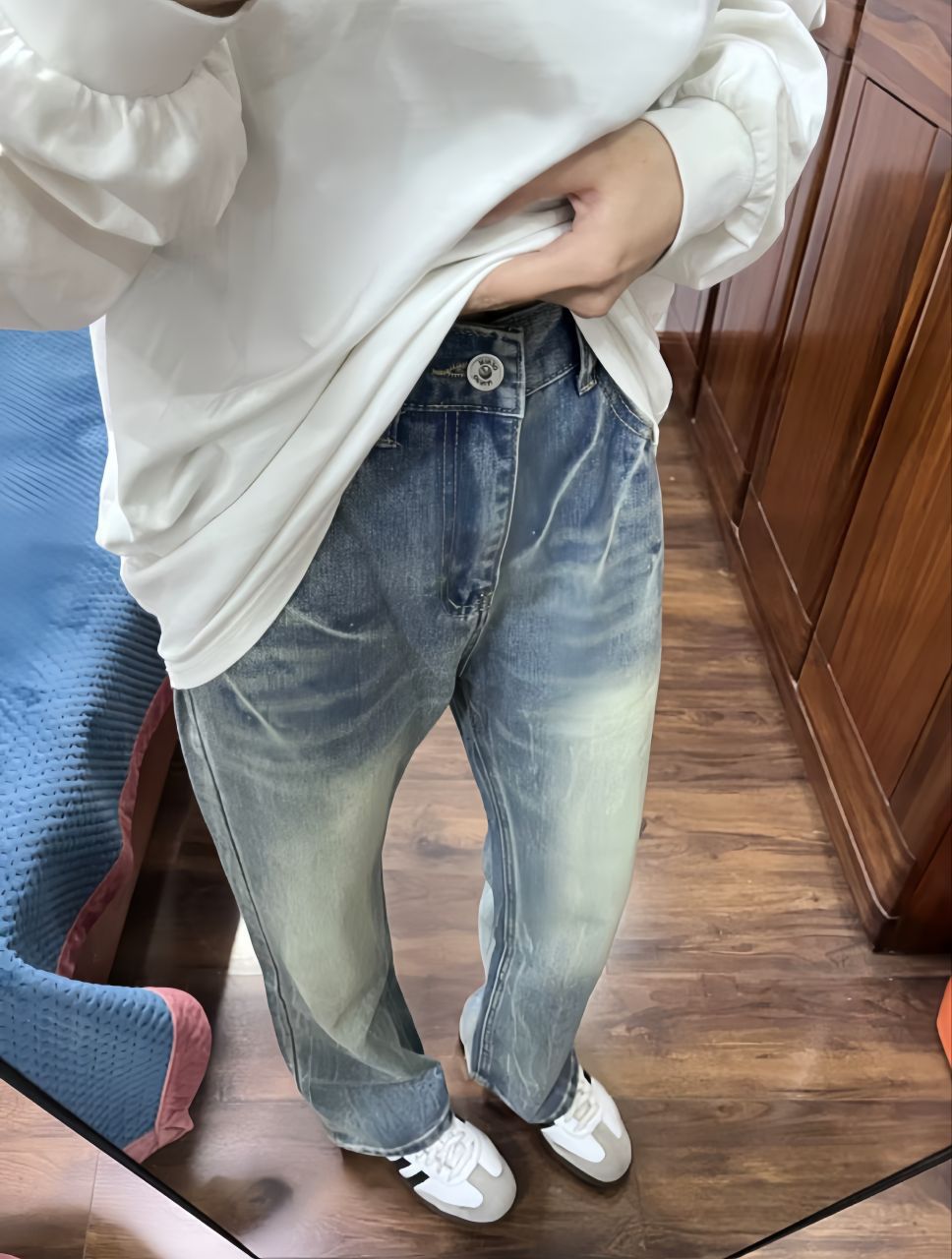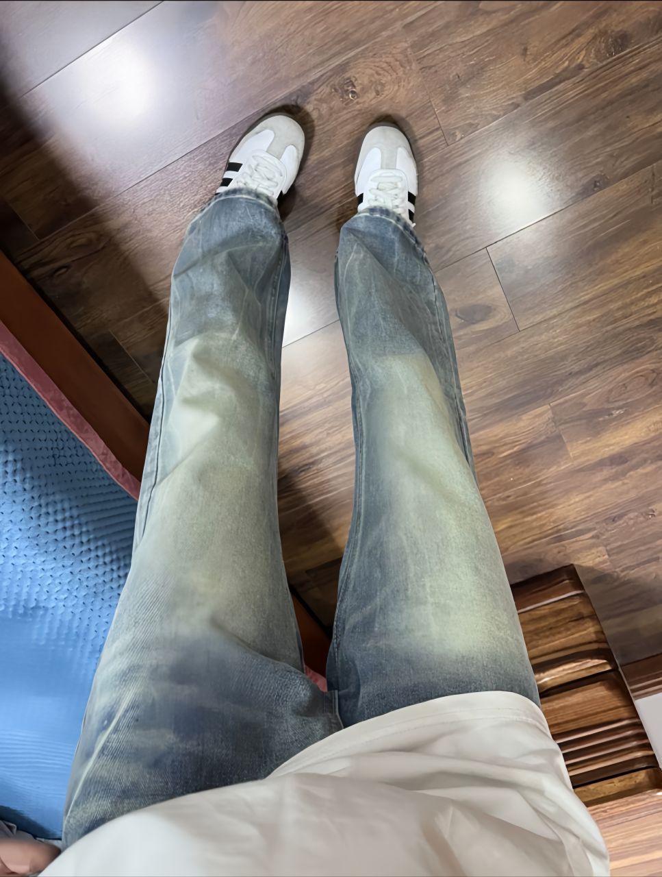啊啊啊啊我可太喜欢这种类型的牛仔啦!! 版型好正好好看!上身真的很显腿直这个颜色也是很流行的做旧蓝色 搭配一双德训白色小板鞋,百搭不累脚,舒服又帅气太酷啦!!