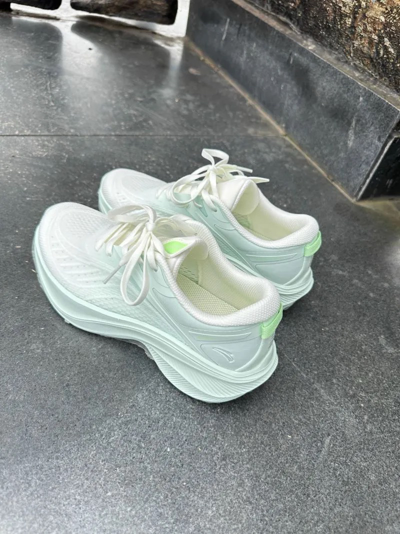 这是一双时尚的白色运动鞋。鞋身整体呈白色调,搭配有清新的浅绿色细节装饰,简约又不失活力。厚底设计不仅增加了一定的高度,还为穿着者带来舒适的脚感,仿佛行走在云端。 它在风格上十分百搭,与图中的百褶裙搭配,展现出青春甜美的学院风;与休闲裤搭配时,又能呈现出随性自在的街头感。无论是日常出行、校园漫步还是进行轻度运动,这双鞋都能轻松胜任,是追求时尚与舒适人群的不错选择。
