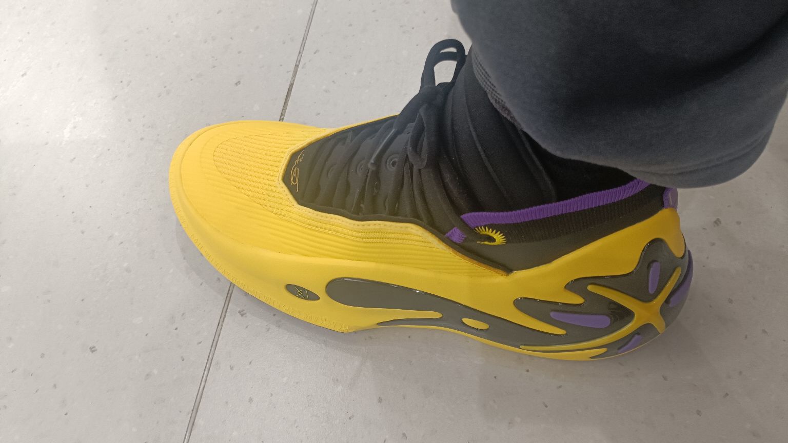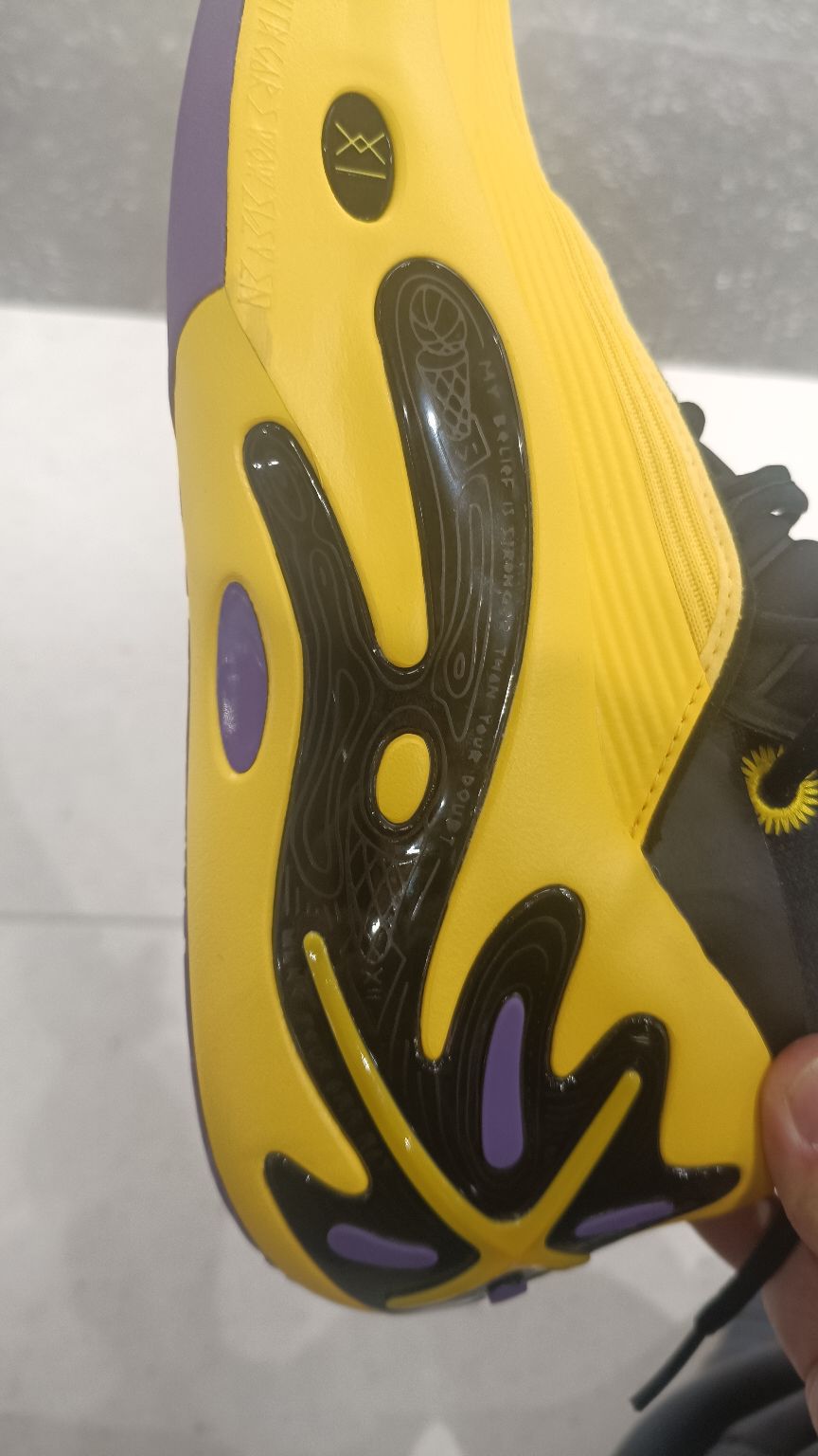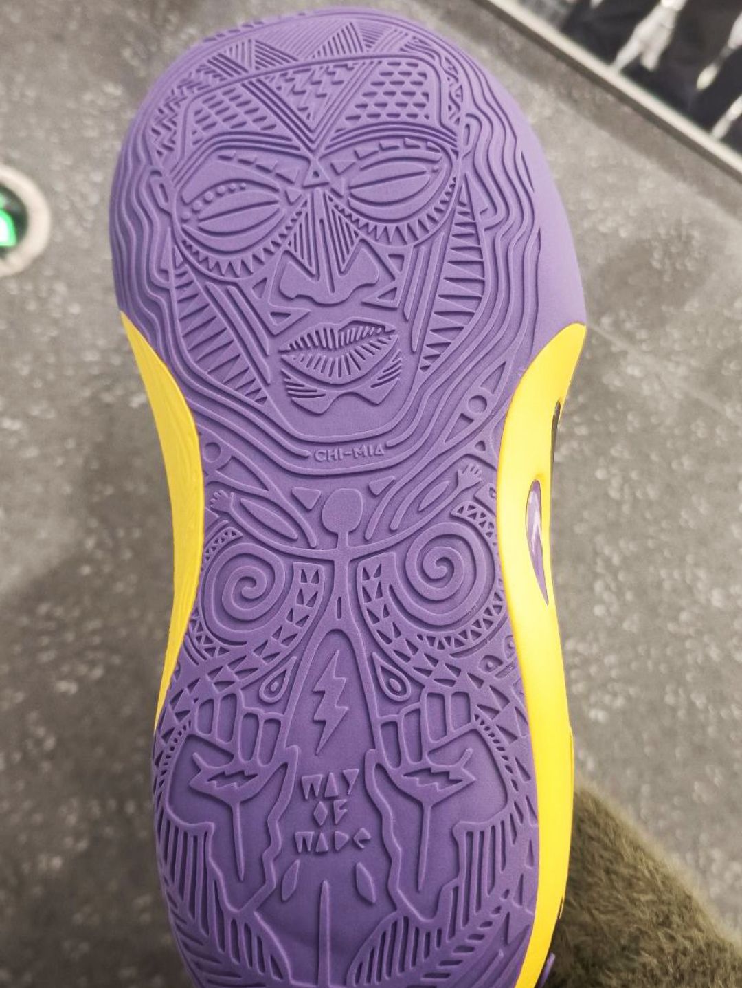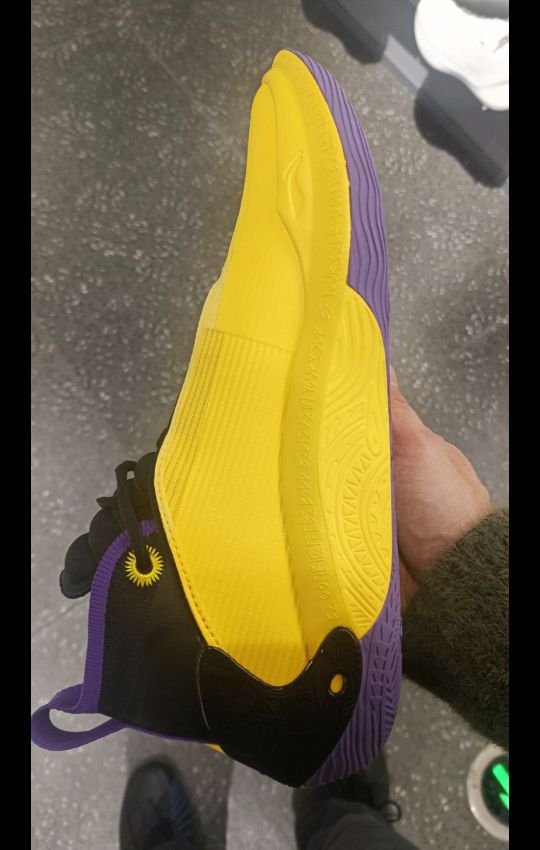 这双紫金配色整体鞋面是黄色,在灯光下去看特别亮眼!后跟处韦德之道的logo特别明显,球鞋辨识度也是特别高。