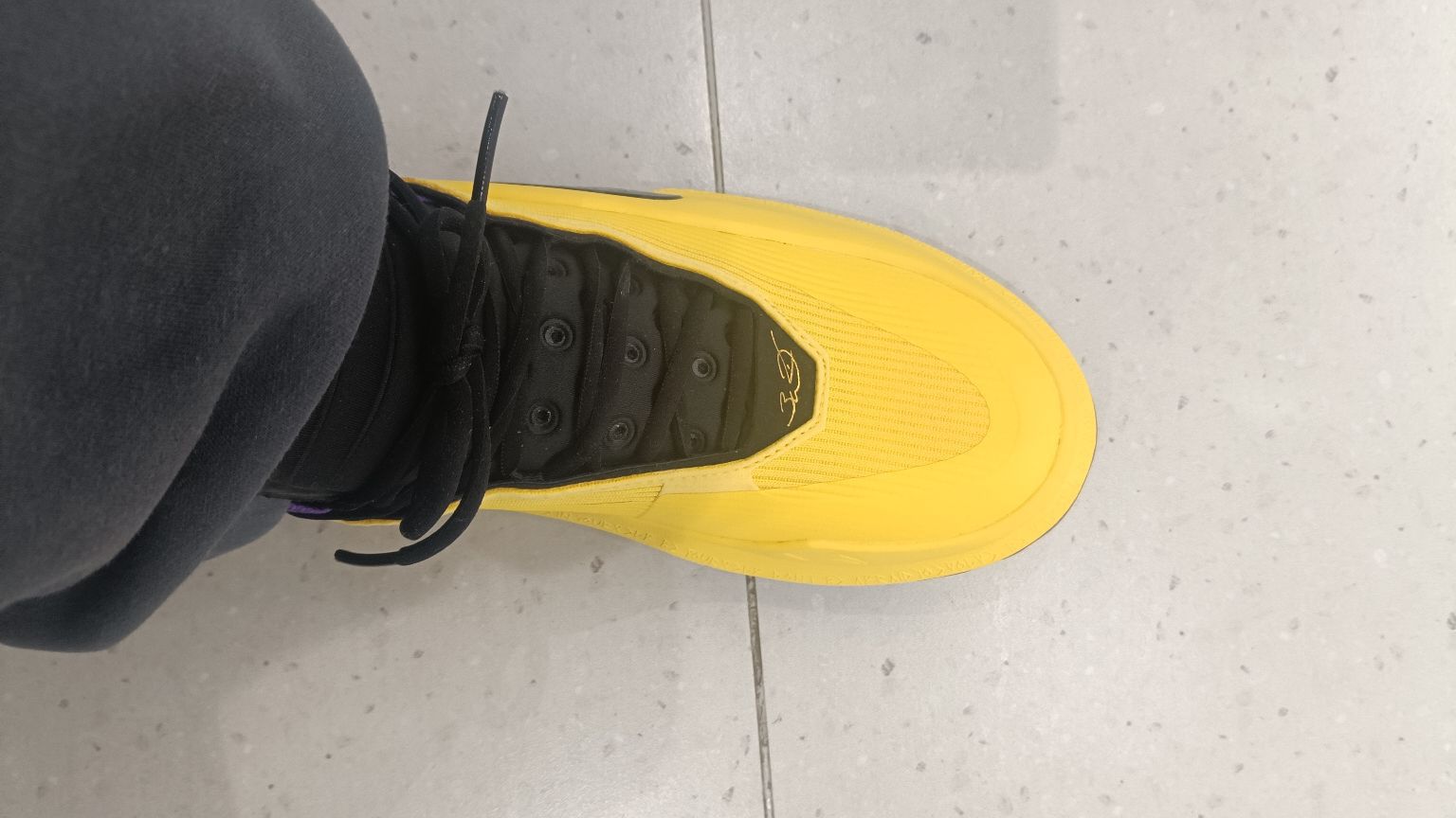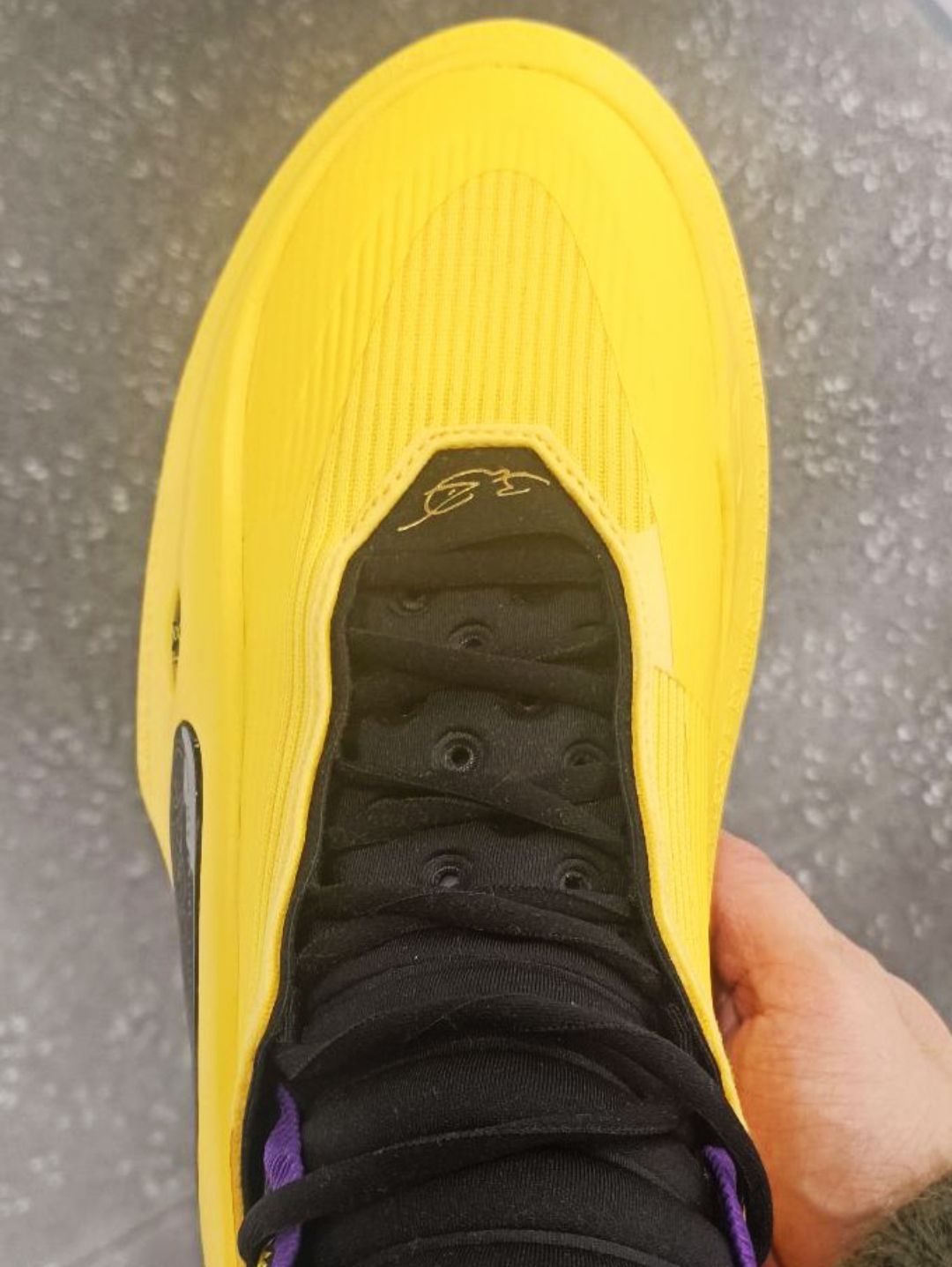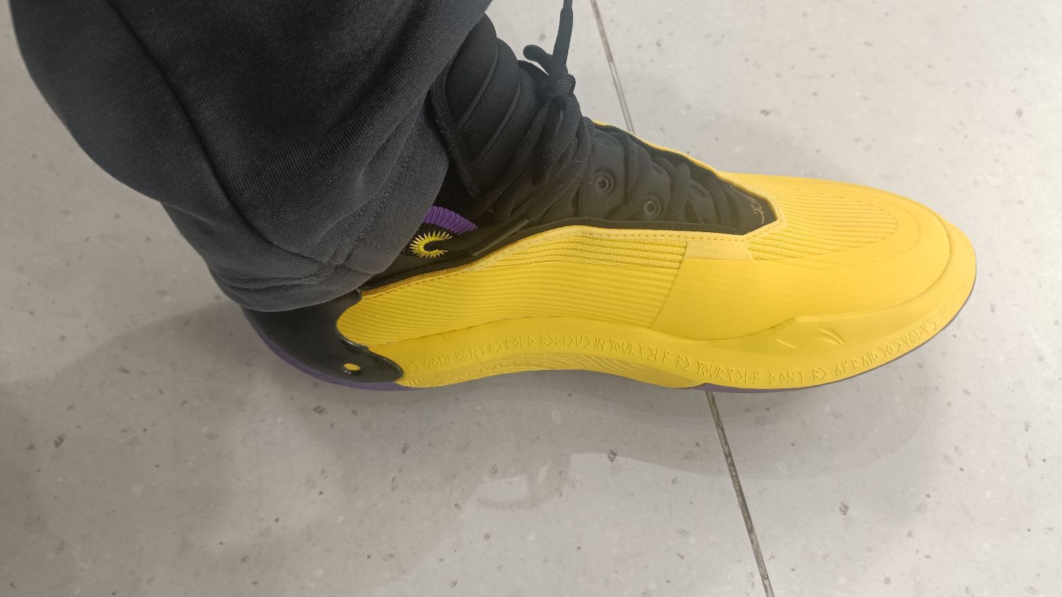 这双紫金配色整体鞋面是黄色,在灯光下去看特别亮眼!后跟处韦德之道的logo特别明显,球鞋辨识度也是特别高。