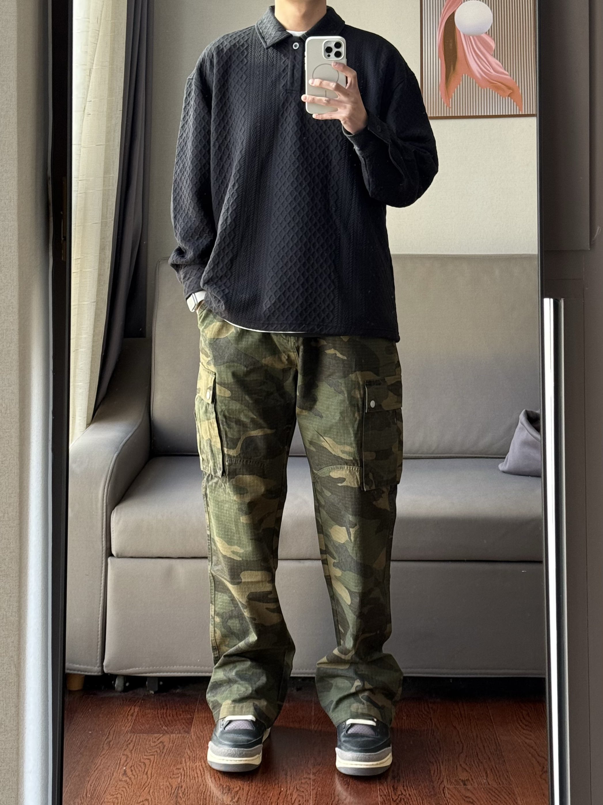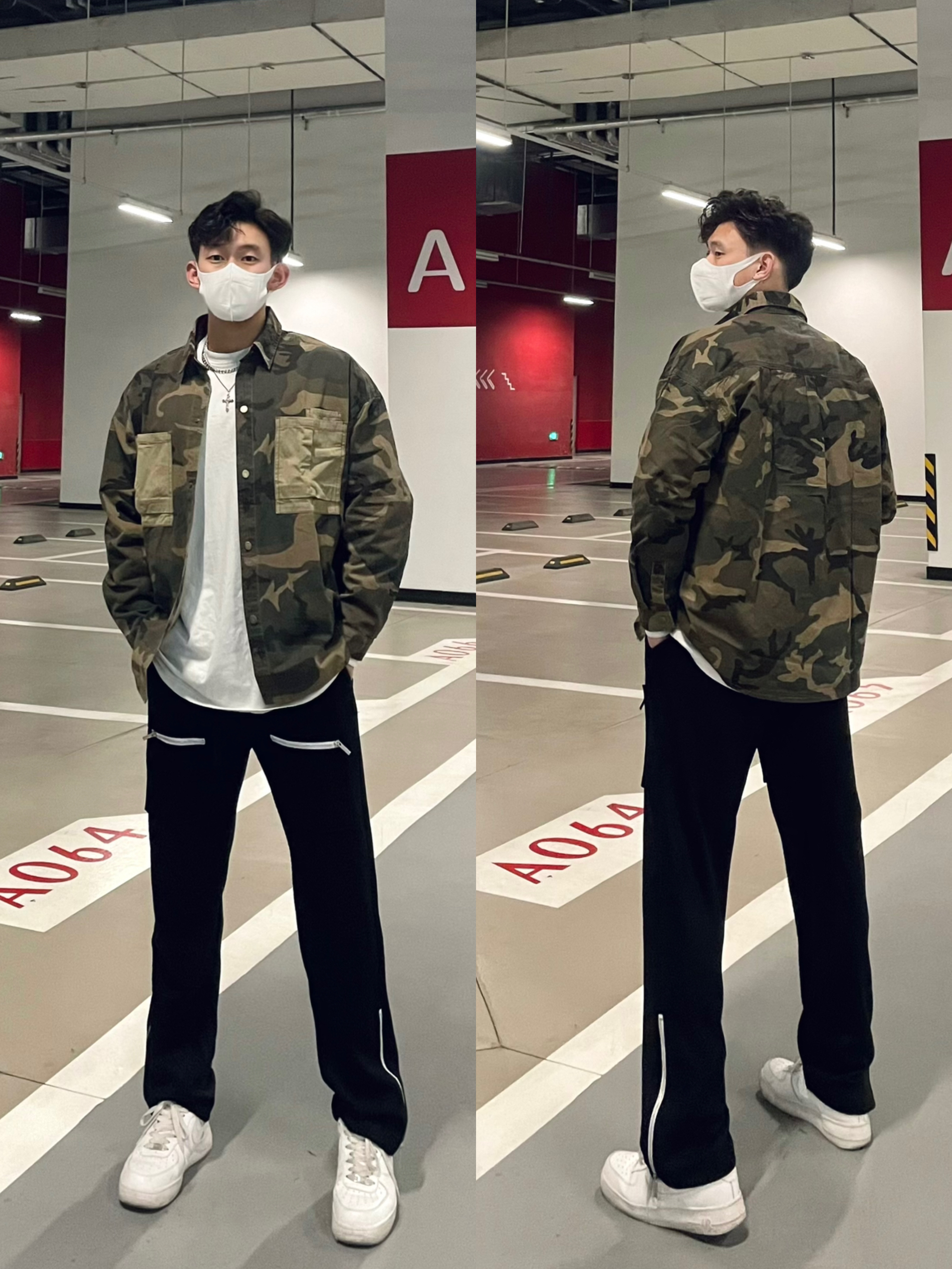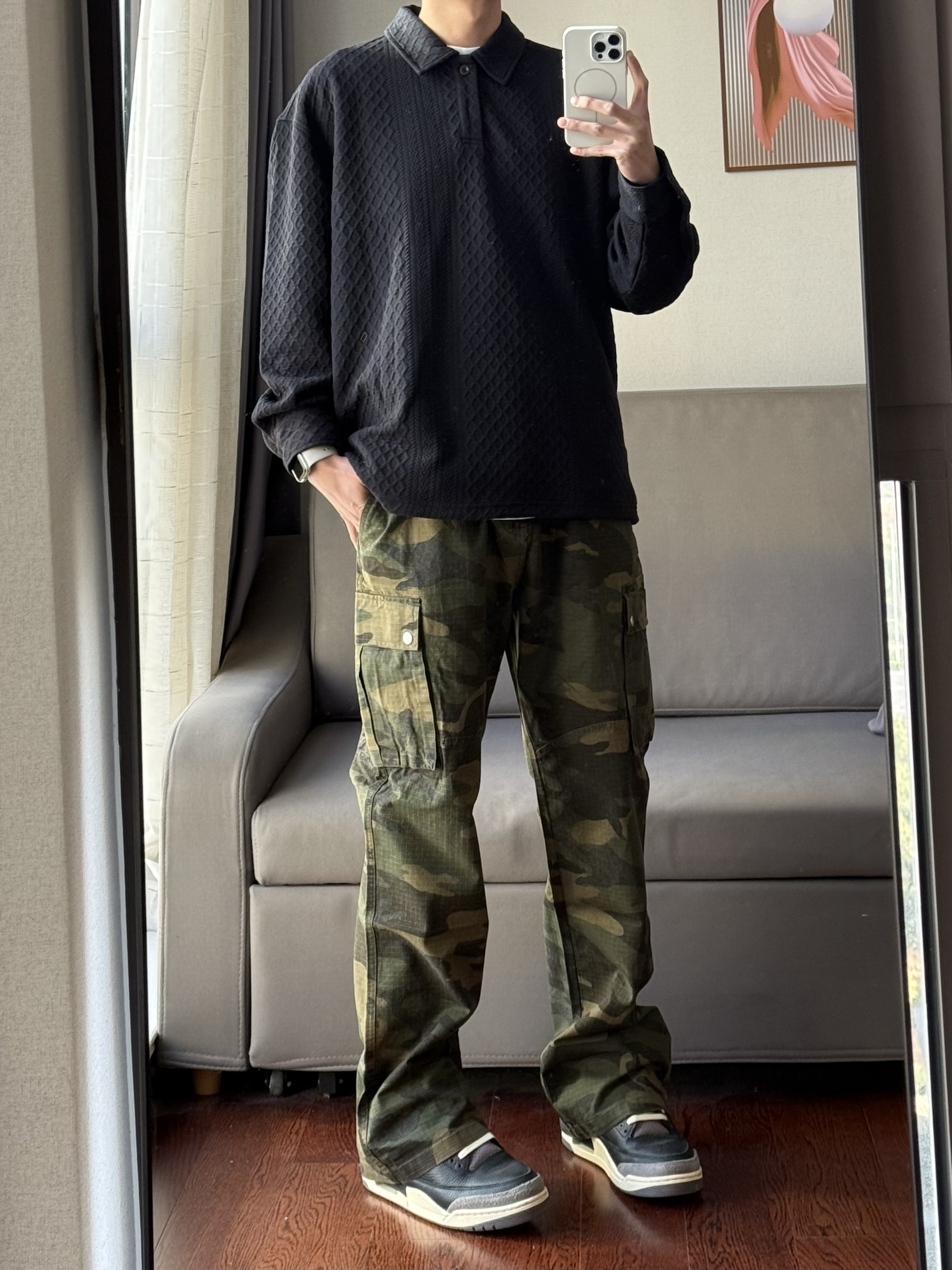 华夫格的设计真的会让人眼前一亮了! 深色的迷彩设计也是真的刚好配上了黑色的穿搭~ 这样的穿搭谁能拒绝呢🤠