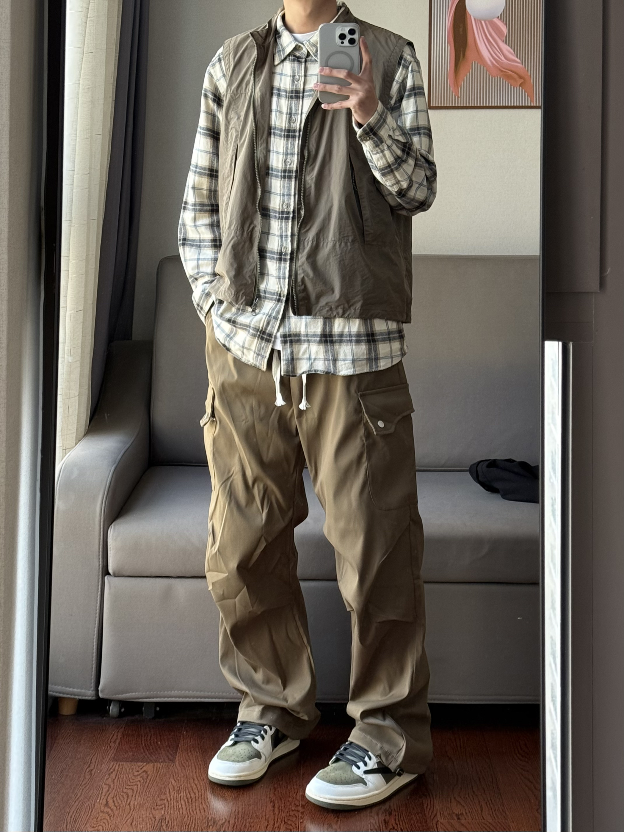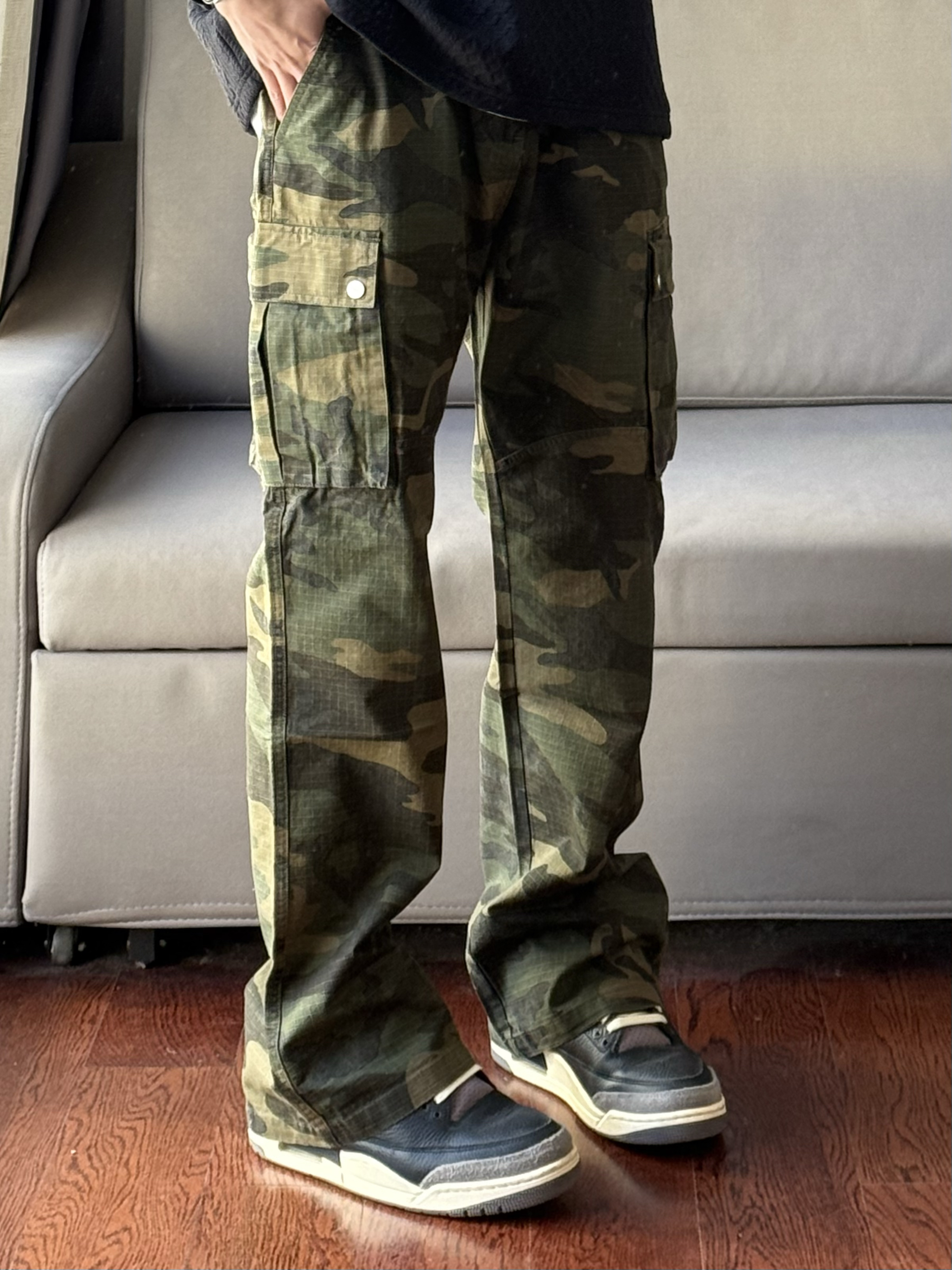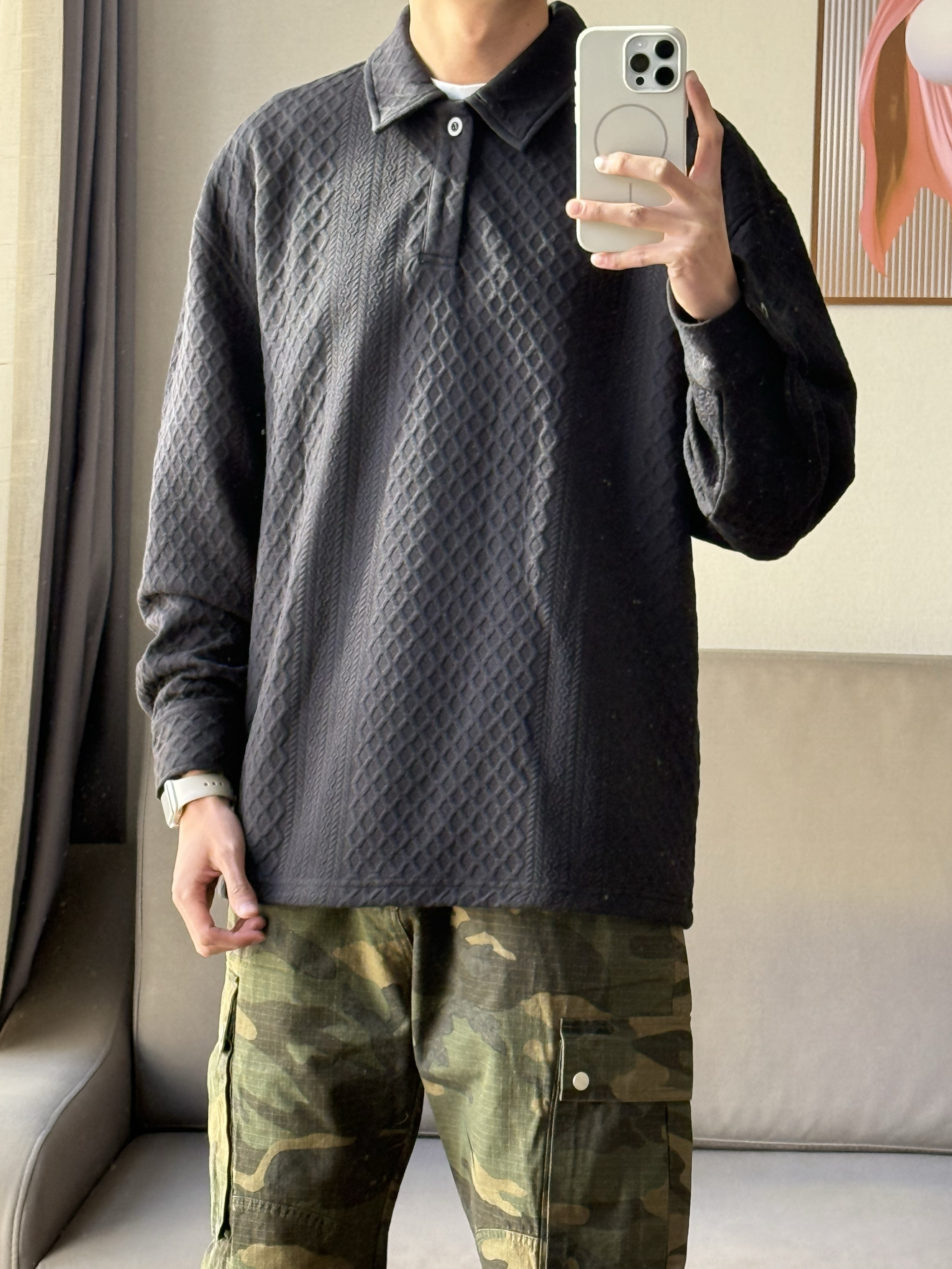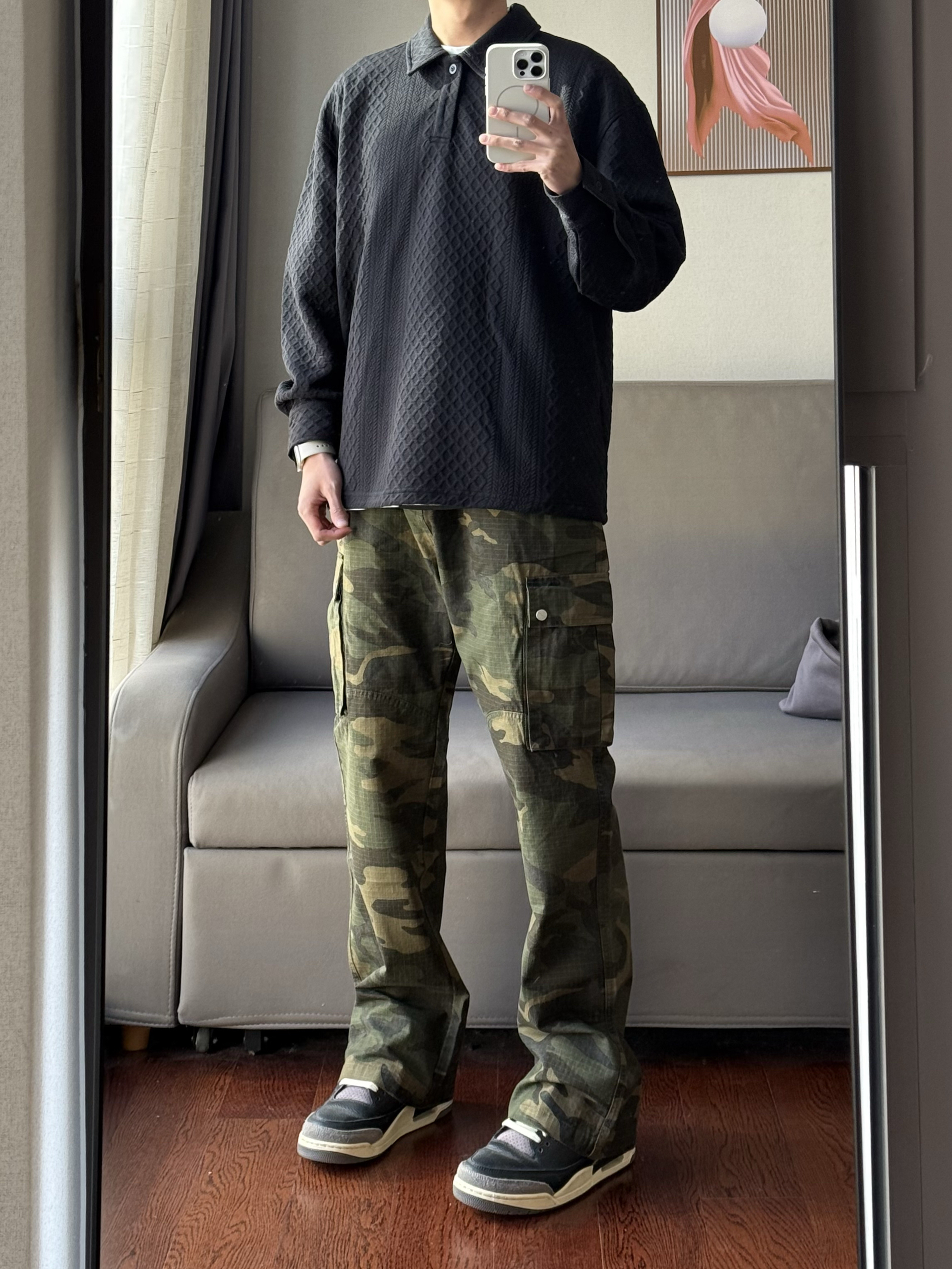 华夫格的设计真的会让人眼前一亮了! 深色的迷彩设计也是真的刚好配上了黑色的穿搭~ 这样的穿搭谁能拒绝呢🤠