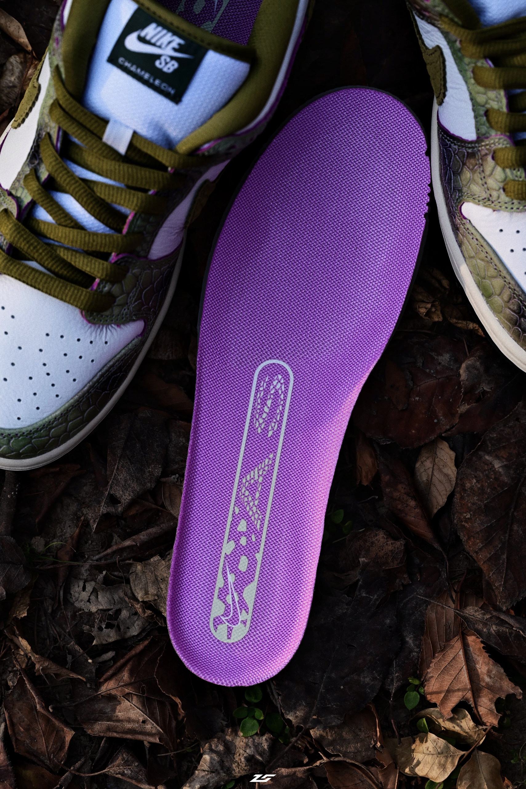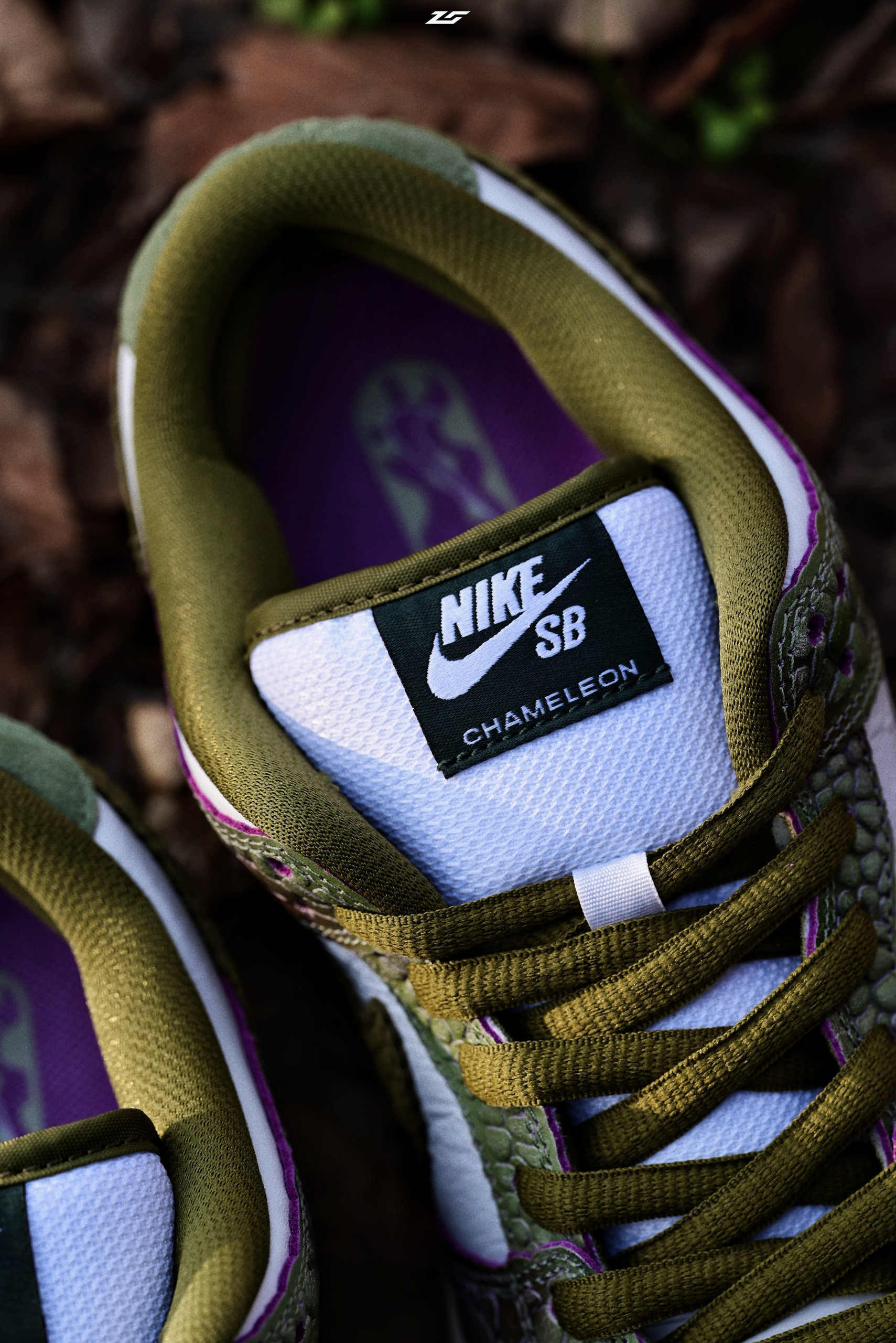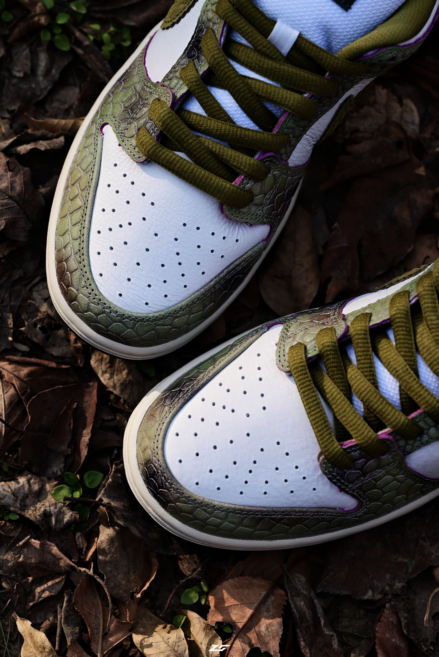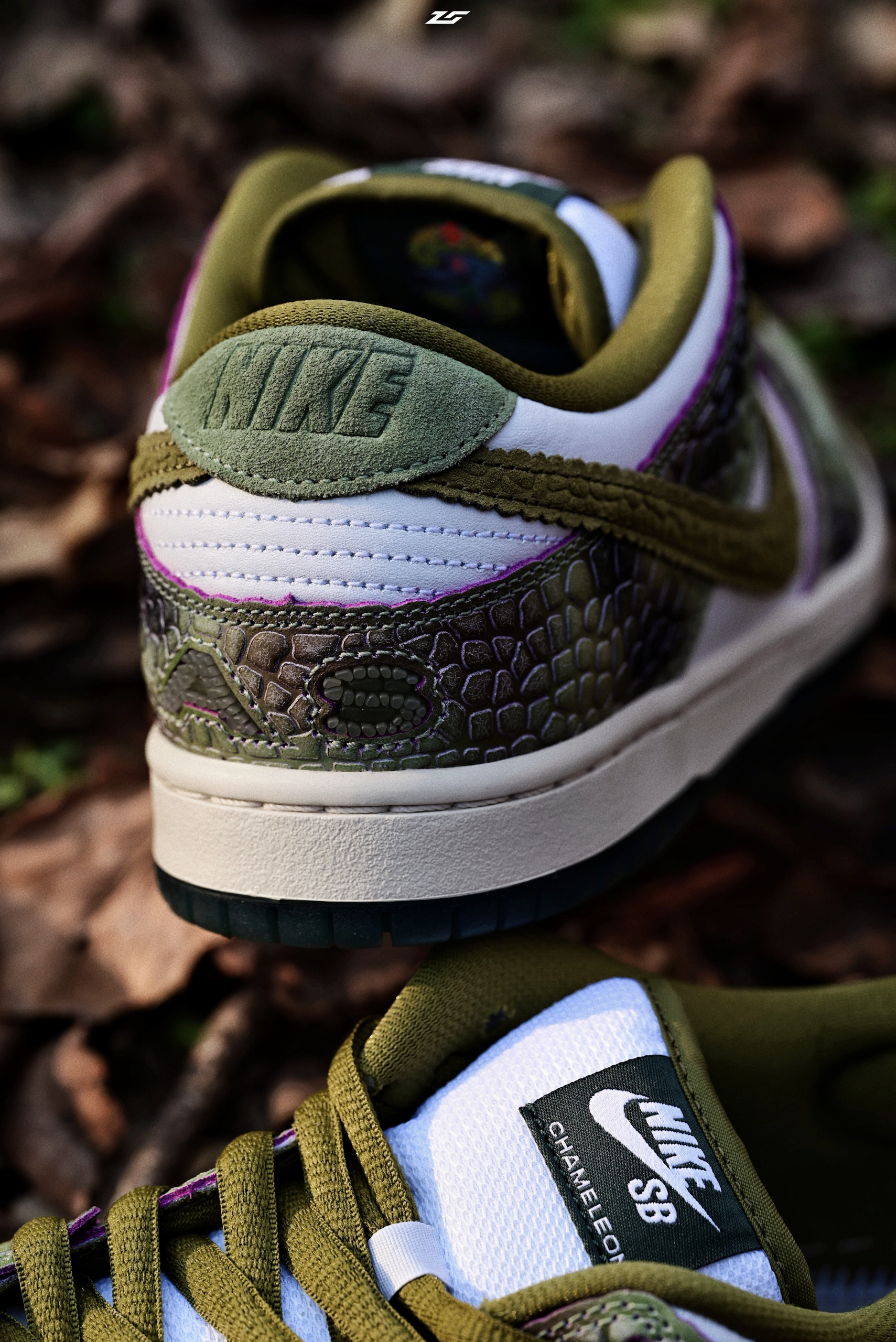 一双蛮特别的dunk,变色龙设计主题,皮质纹路很特殊,前段时间进奥莱了,价格香香,六开左右,附赠两幅鞋带,还是联名,血赚。 后跟/鞋垫/鞋舌内都有细节,另外还有刮刮乐属性,穿久了会了露出鞋面下面的紫色。