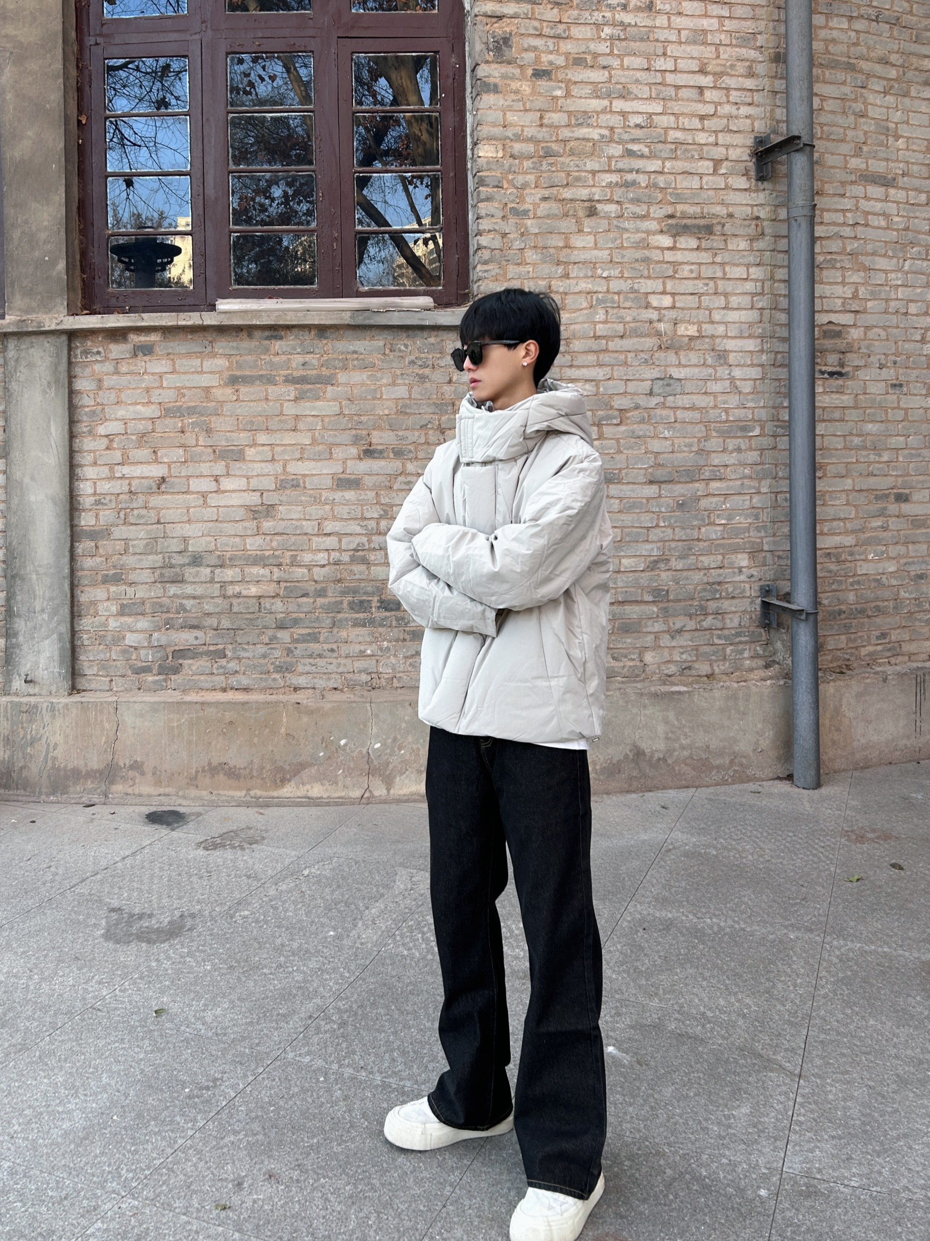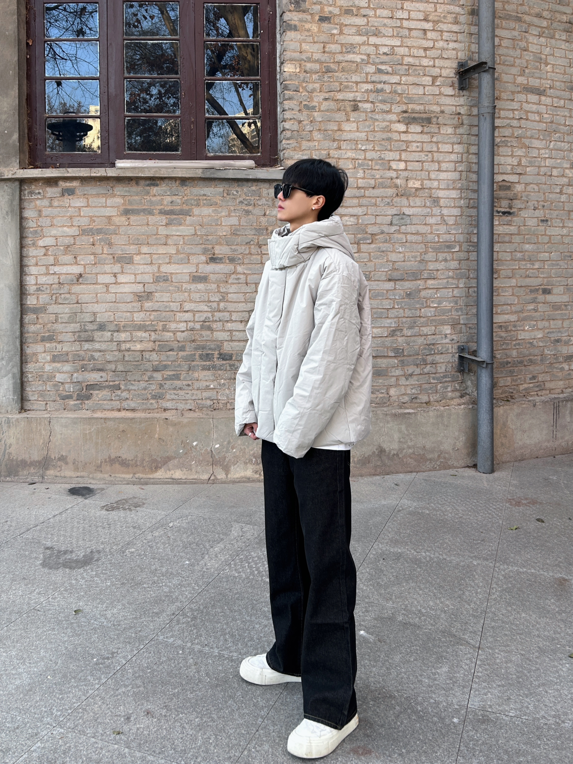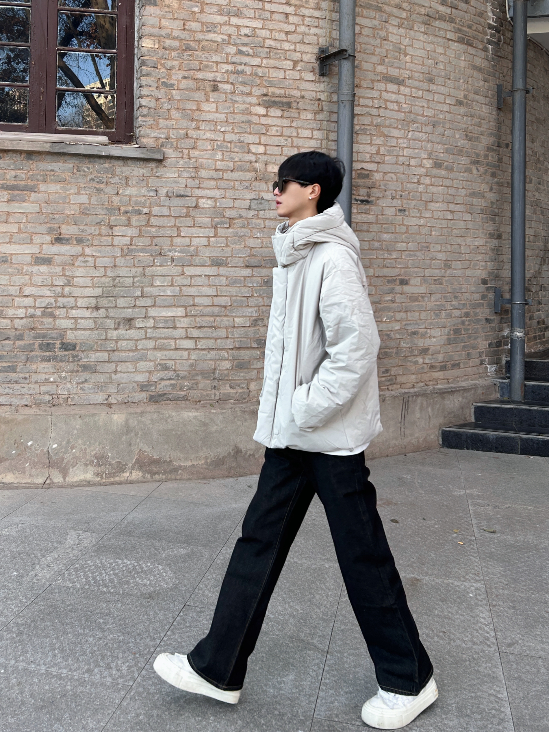 想要暖和就要穿蓬松一点的羽绒服 那我们的裤子就要选择宽松一些的 这样才不会有那种头重脚轻的感觉 上身了一件灰色的羽绒服 这件羽绒服穿上真的很有氛围感 还有我很喜欢的小细节 就是一个类似于围巾一样的设计 灰色的配色在冬天还是很有辨识度的 给人一种很干净的帅气 再来一些线条的设计 比起面包服更有穿搭感 搭配一条水洗牛仔裤 这条牛仔裤的颜色真的有种复古的味道 微喇的版型也是现在很流行的 穿在腿上舒服保暖...
