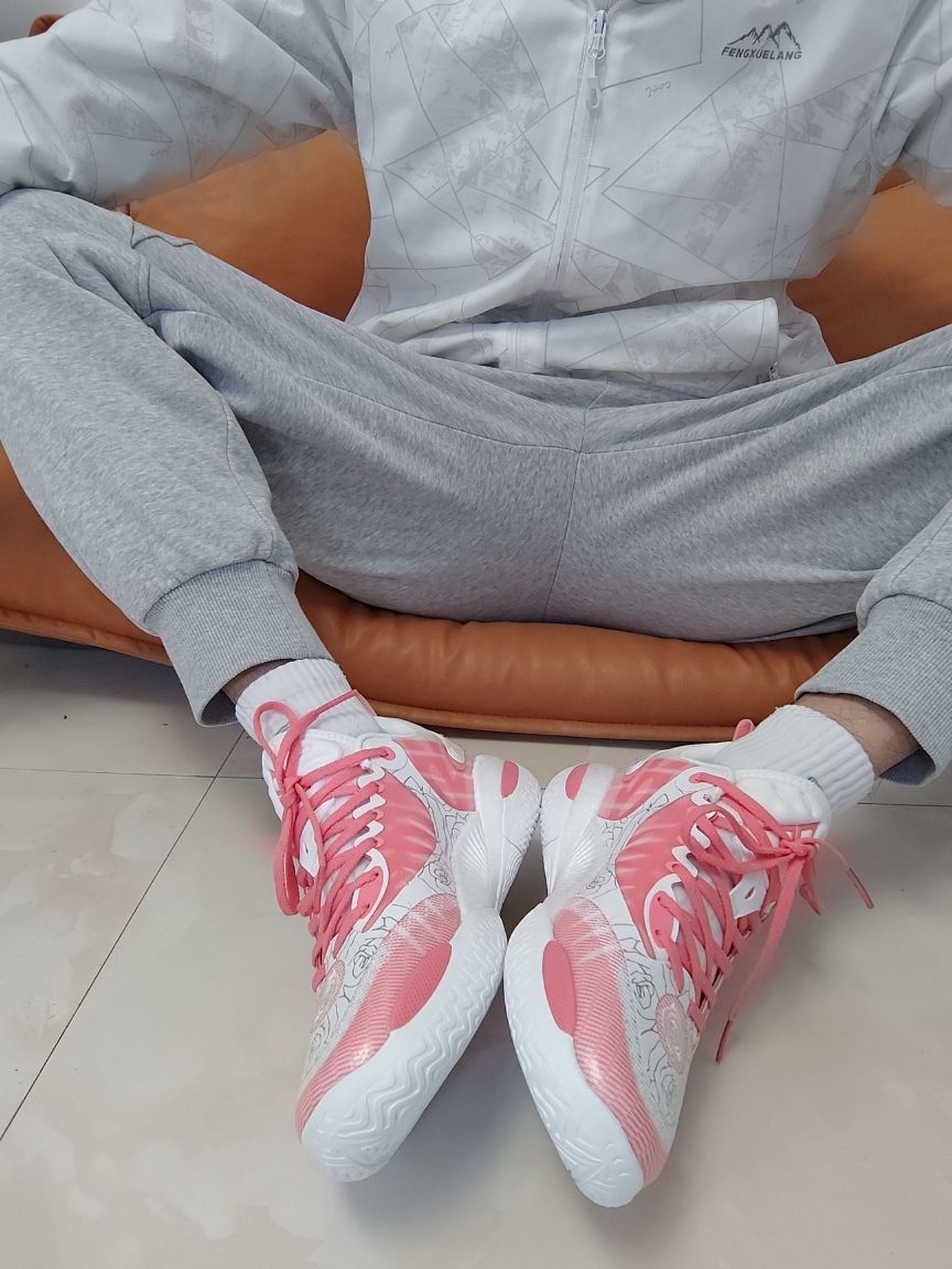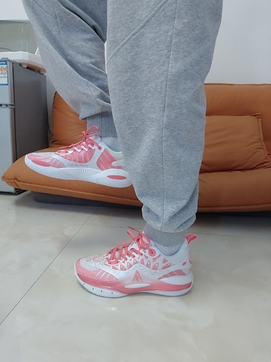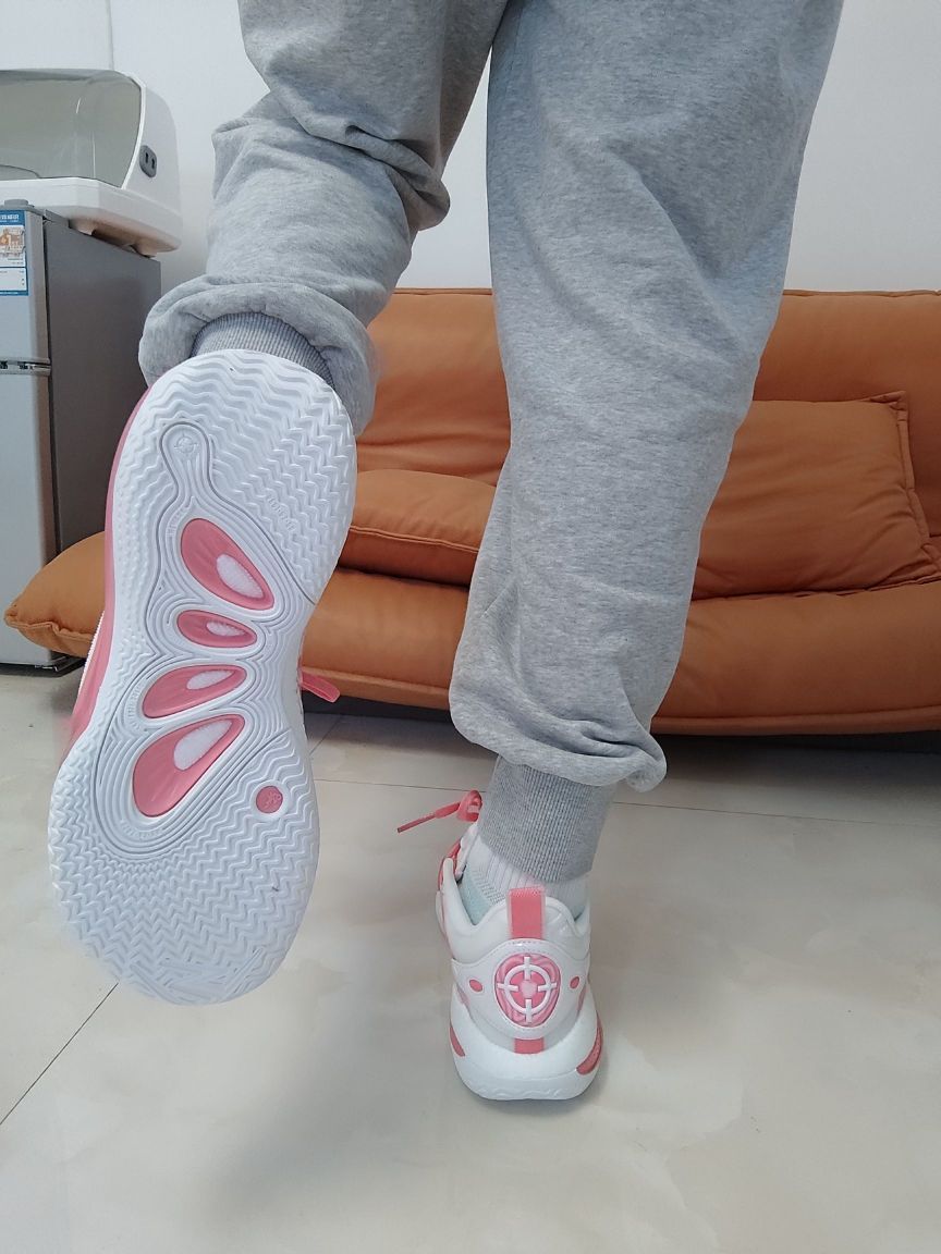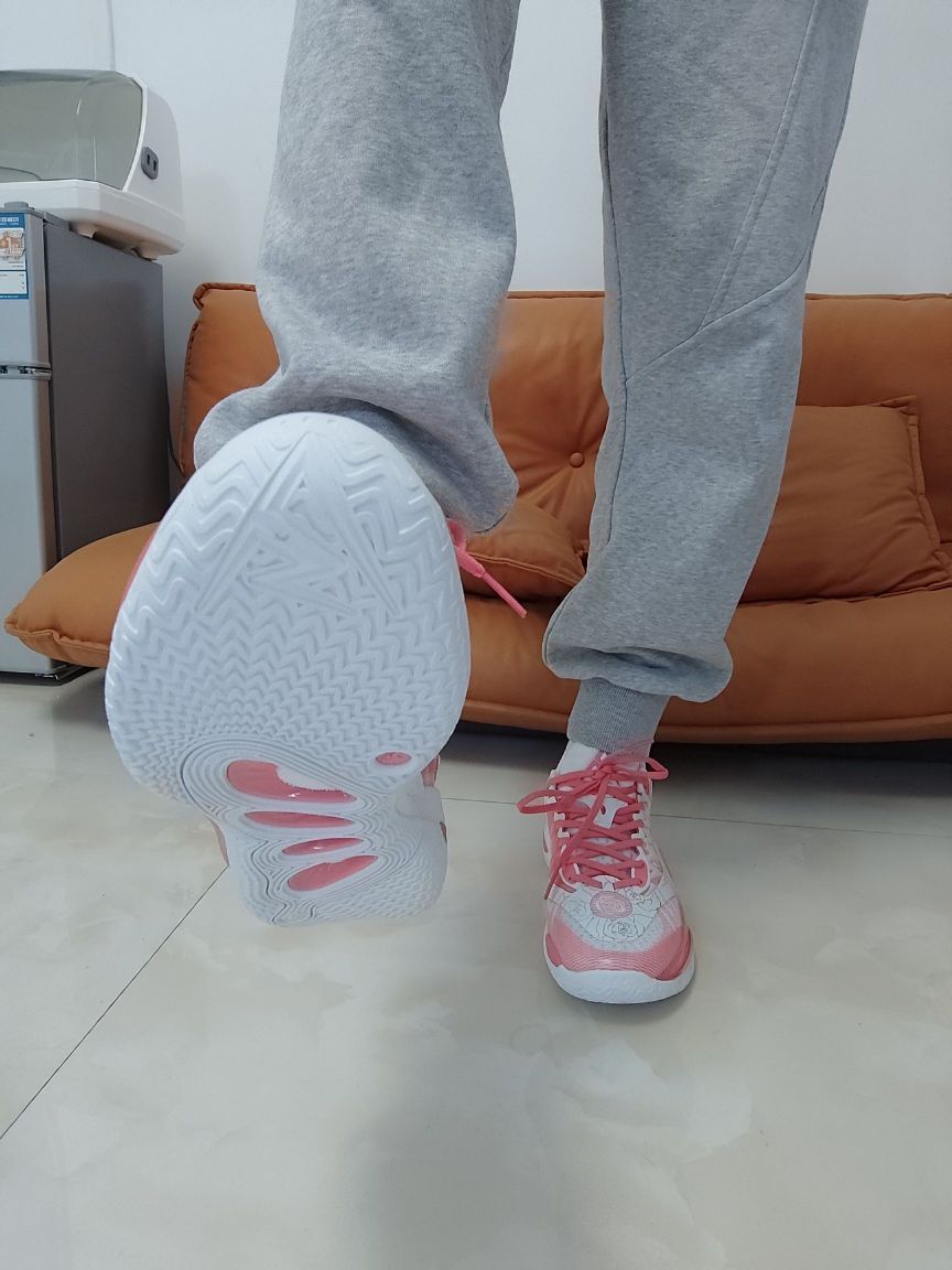 又想打球了! 没想到准者的篮球鞋这么好看! 鞋底的蝴蝶🦋标识是不是太有创意了? 鞋子粉色特别吸引眼球, 果断上脚试试! 鞋底的弹性特别好, 包括鞋底“蝴蝶翅膀”中间, 都像海绵一样有弹性! 穿上后脚感特别好! 鞋底的抓地力强, 在比较滑的瓷砖上也能感受到 鞋子的强大止滑能力。[赞_blue] 但这个配色应该不适合水泥场地, 这么好看的鞋子我担心它变脏![偷看_blue] 但室内篮球场应该会成为全场...