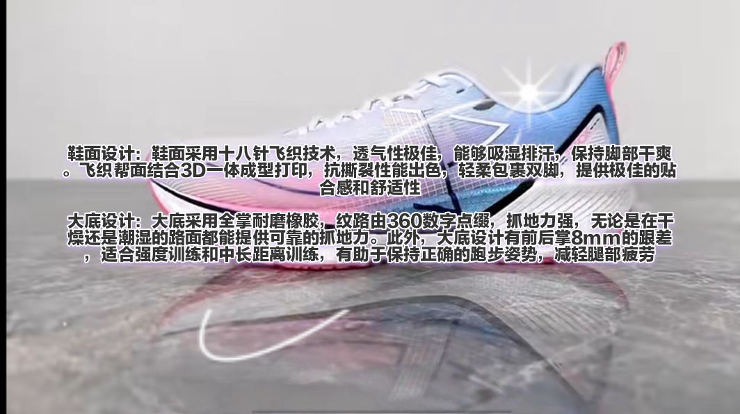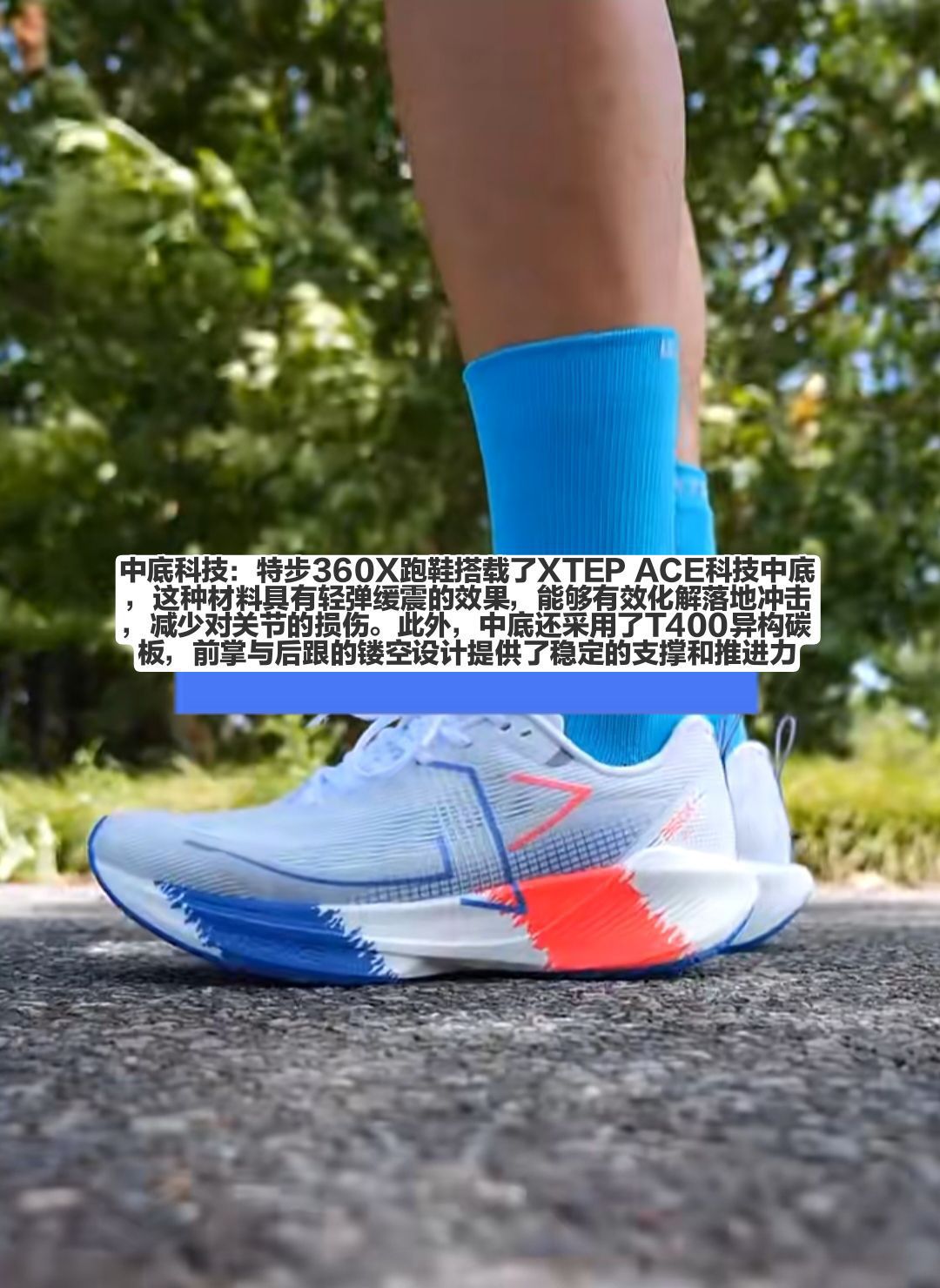中底科技:特步360X跑鞋搭载了XTEP ACE科技中底,这种材料具有轻弹缓震的效果,能够有效化解落地冲击,减少对关节的损伤。此外,中底还采用了T400异构碳板,前掌与后跟的镂空设计提供了稳定的支撑和推进力 鞋面设计:鞋面采用十八针飞织技术,透气性极佳,能够吸湿排汗,保持脚部干爽。飞织帮面结合3D一体成型打印,抗撕裂性能出色,轻柔包裹双脚,提供极佳的贴合感和舒适性 大底设计:大底采用...
