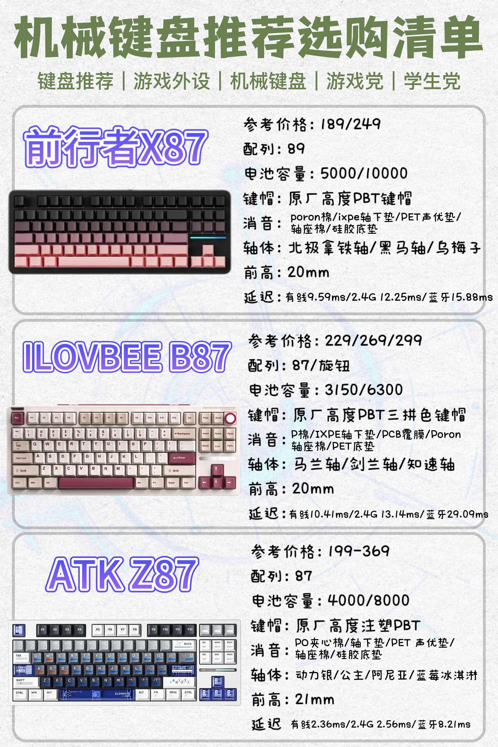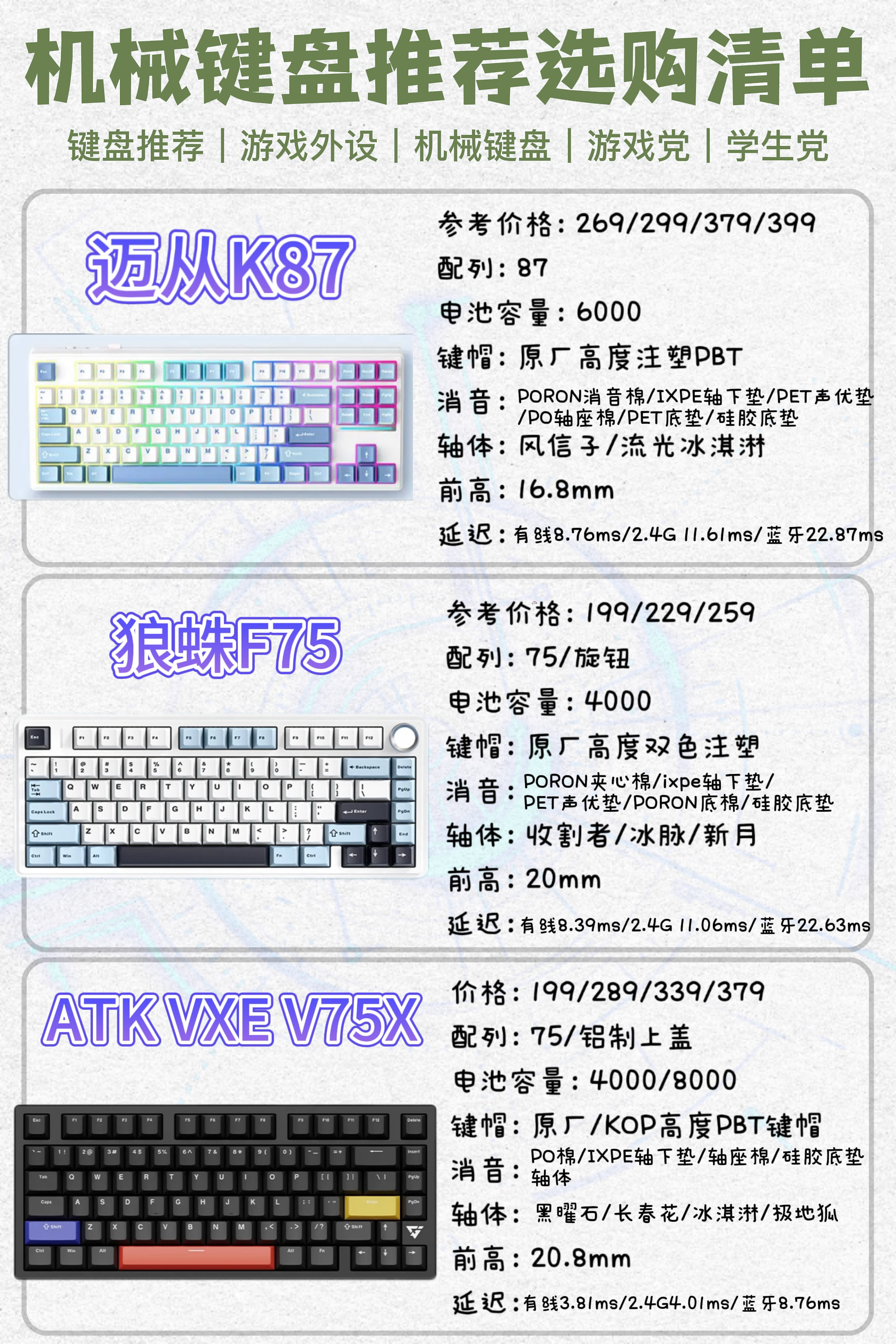 本篇笔记关联了Dareu/达尔优 EK871 有线 机械键盘 108键 三模 可充电 热插拔 办公 电竞 低延迟 灰白 热插拔版、AULA/狼蛛 F75 三模 机械键盘 80键 收割者轴 新月轴 冰脉轴 客制化 热插拔 全键 性价比高 冰川蓝 游戏、MC/迈从 K87 三模 机械键盘 87键 全键热插拔 客制化 风信子轴 奶黄轴 紫轴 湖蓝白等商品,为用户提供真实的使用体验和购买参考。
