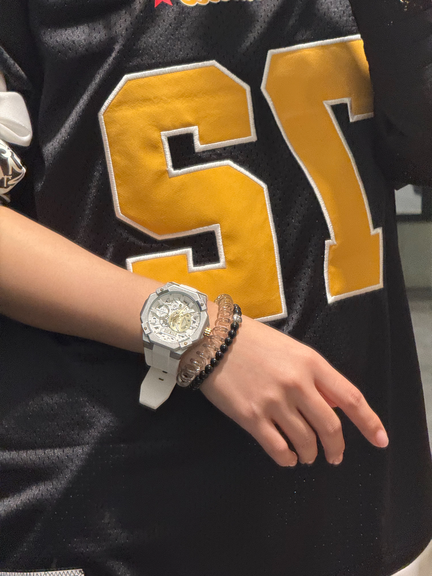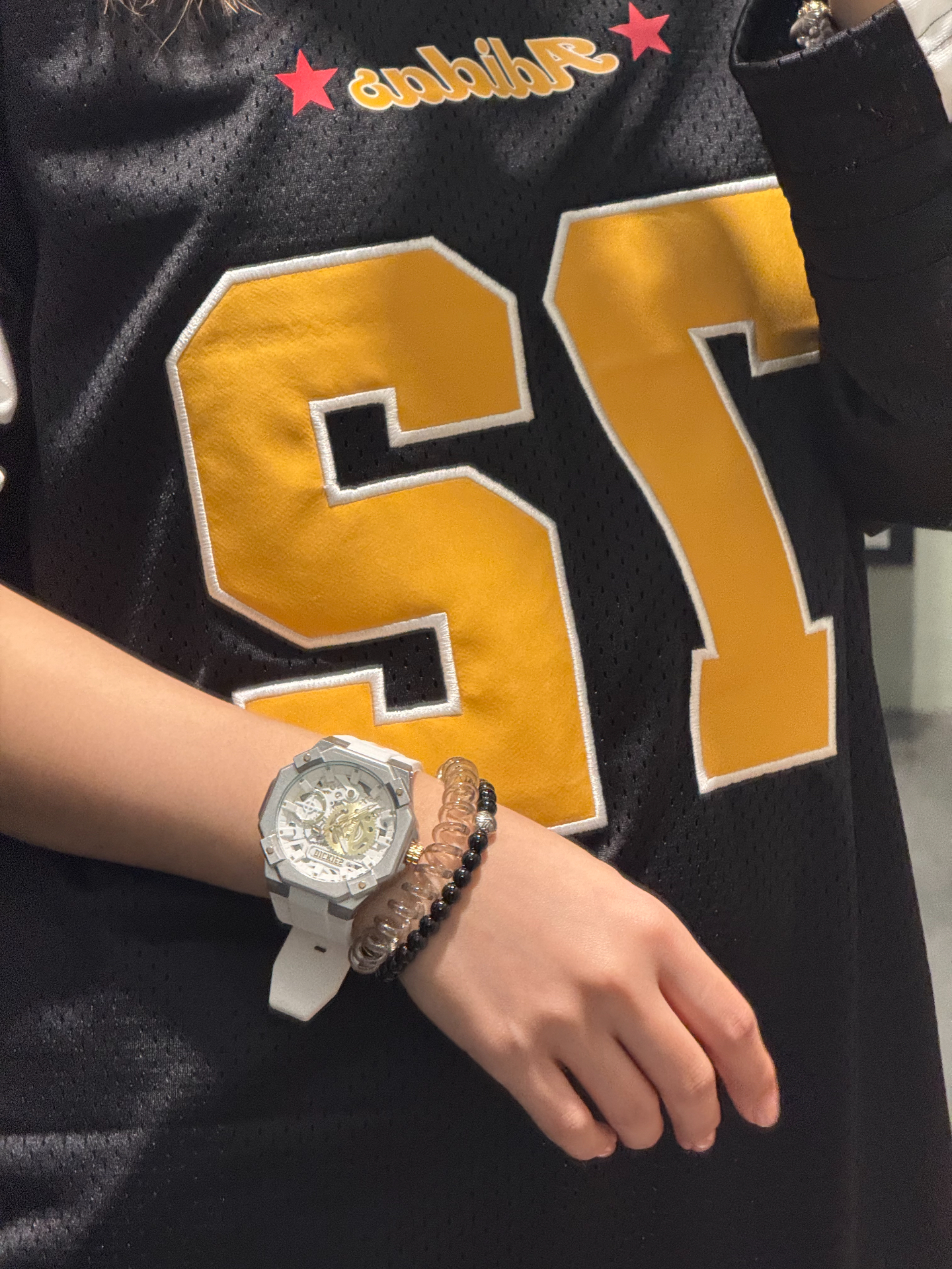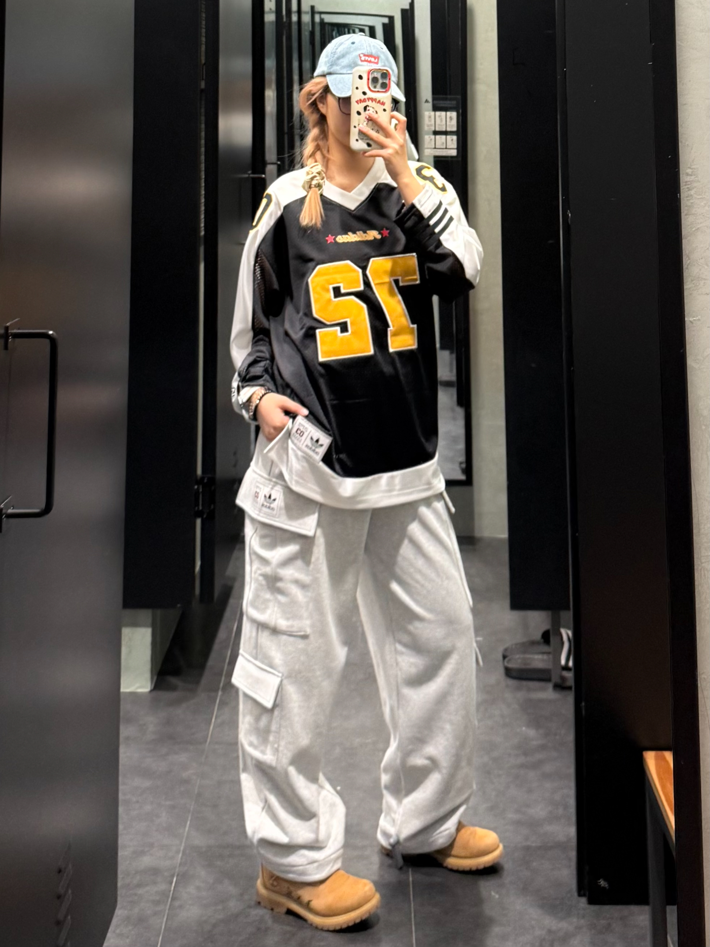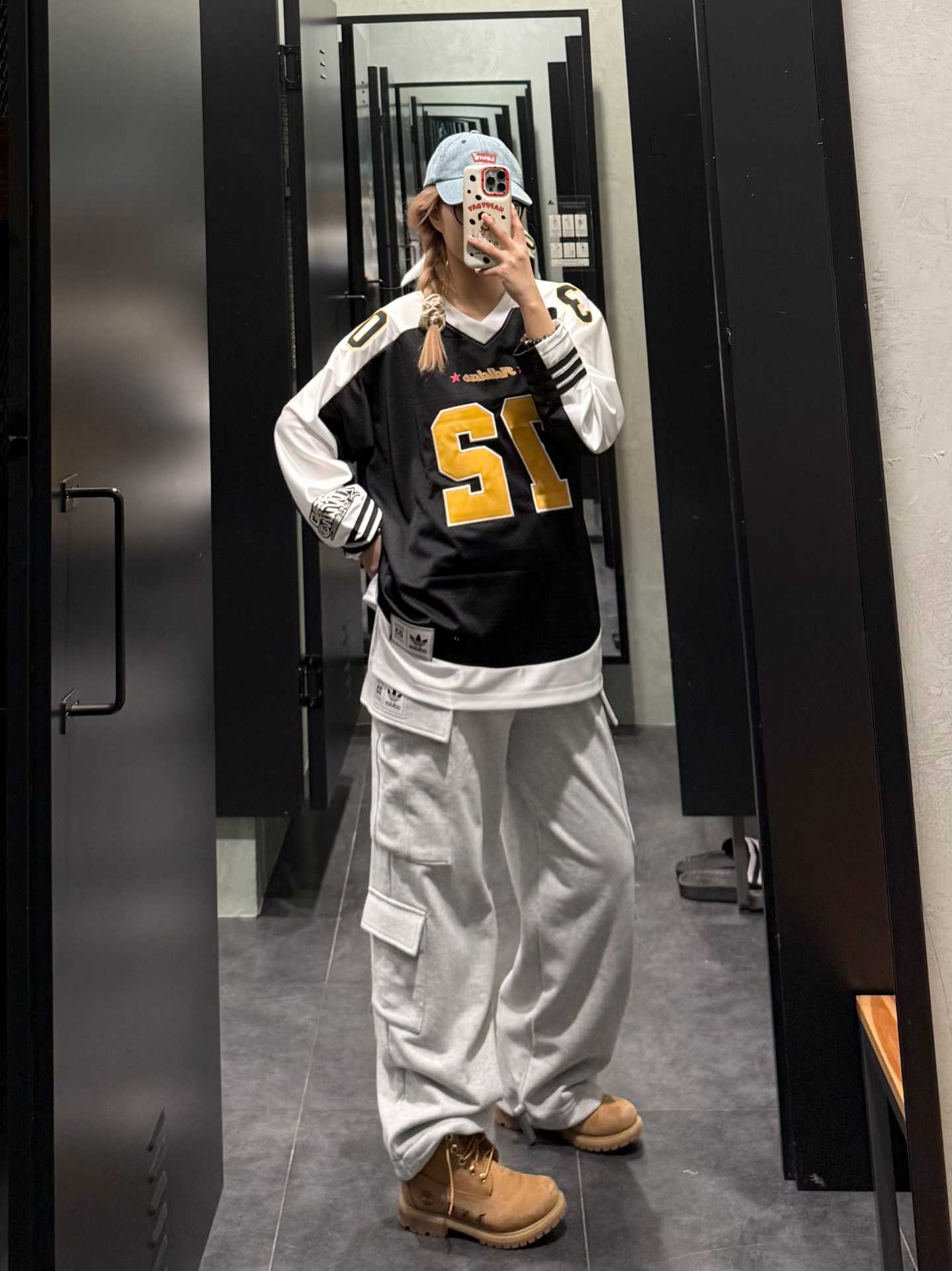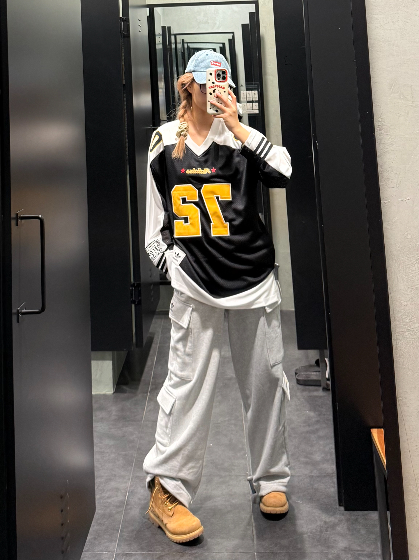 无论何时球衣都是我松弛感的来源,宽松的版型加上字母印花,一瞬间的chill感就来了!而且还可以当情侣装穿!完全无脑搭配就可以!搭裤子是经典搭配,搭裙子的话就是今年流行的blokette风!怎么打都不出错!今天这套look我选择了Dickies的大表盘和这一套真的绝搭!酷酷的! 图片源于网络侵删