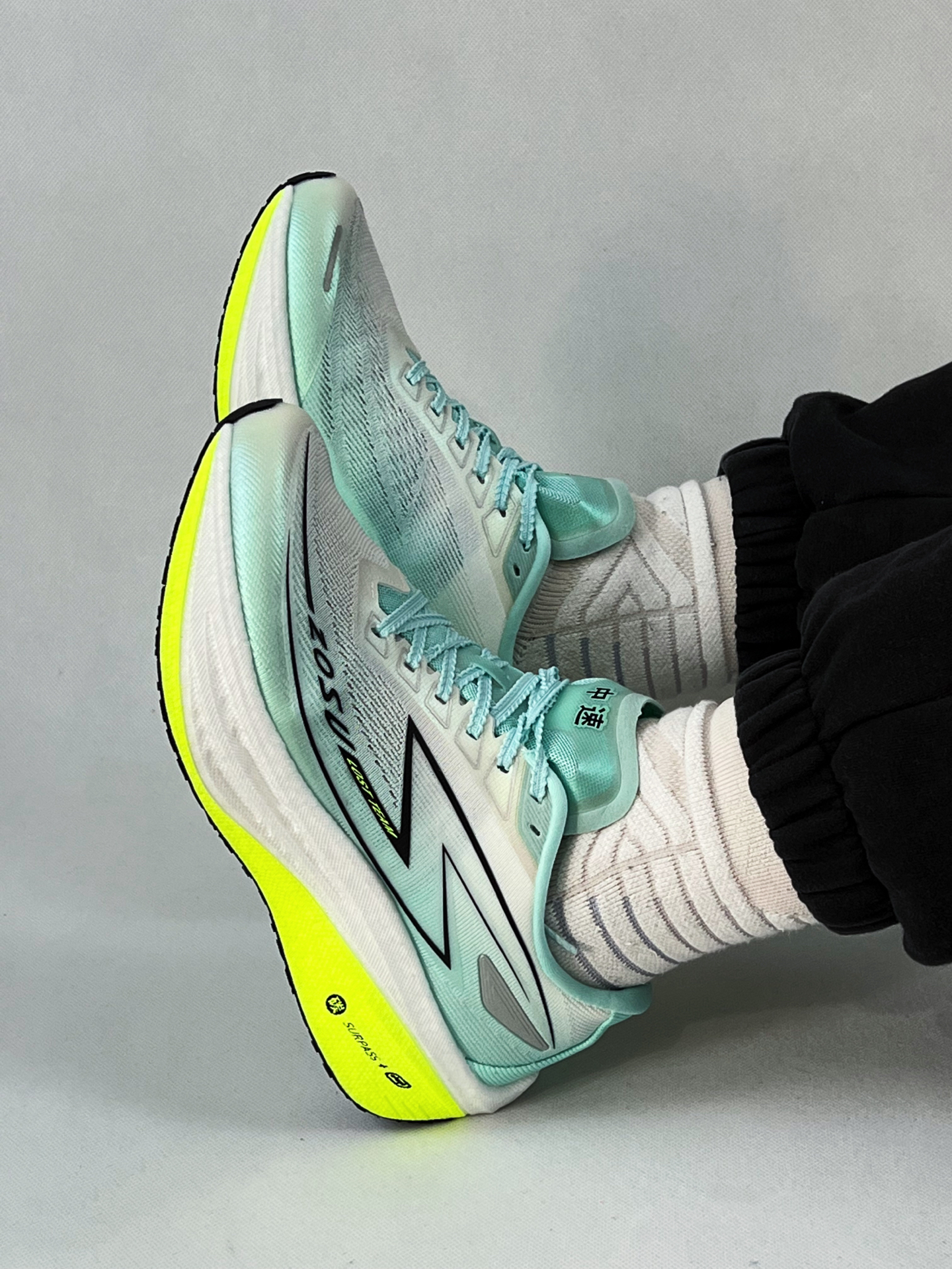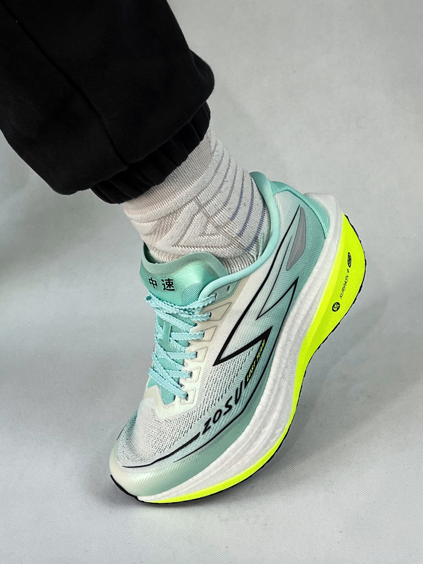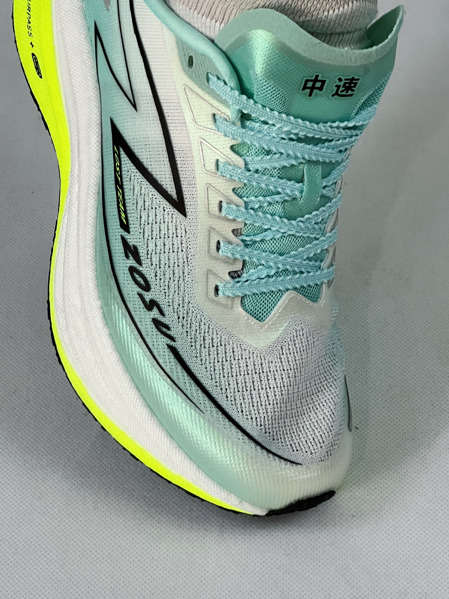 今天和大家分享一双高颜竞速跑鞋 就是这双中速 无垠1.0 清新绿 实物上脚颜值还是蛮酷的哦 网纱鞋面的透气性不错 中底搭载了超临界发泡材料+碳板 脚感很韧弹、启动回弹不错 外底的耐磨防滑问题不大 对于体测竞速、训练、有氧等场景蛮推荐 尺码选购建议正码 鞋 双 双鞋了 好礼物