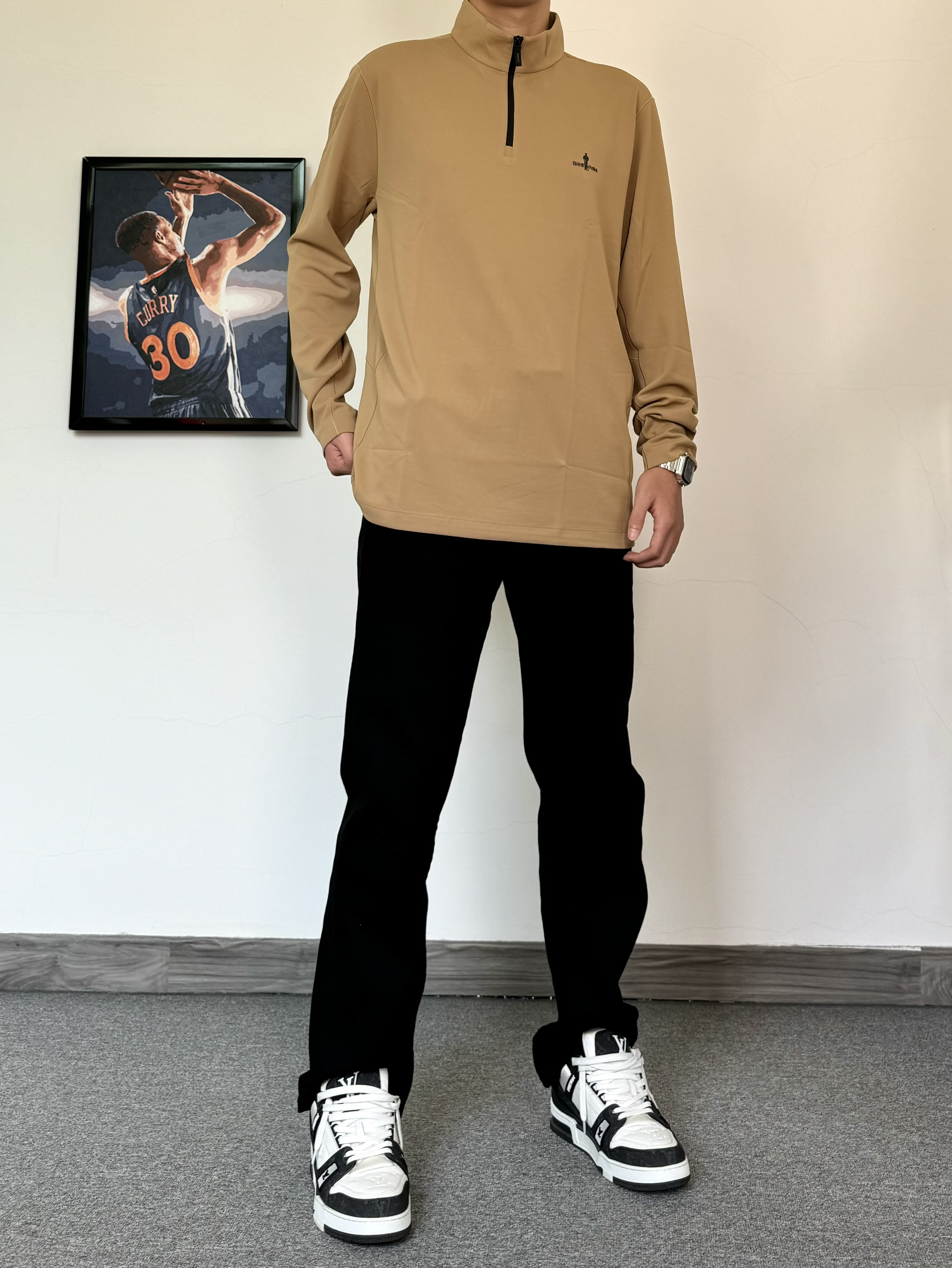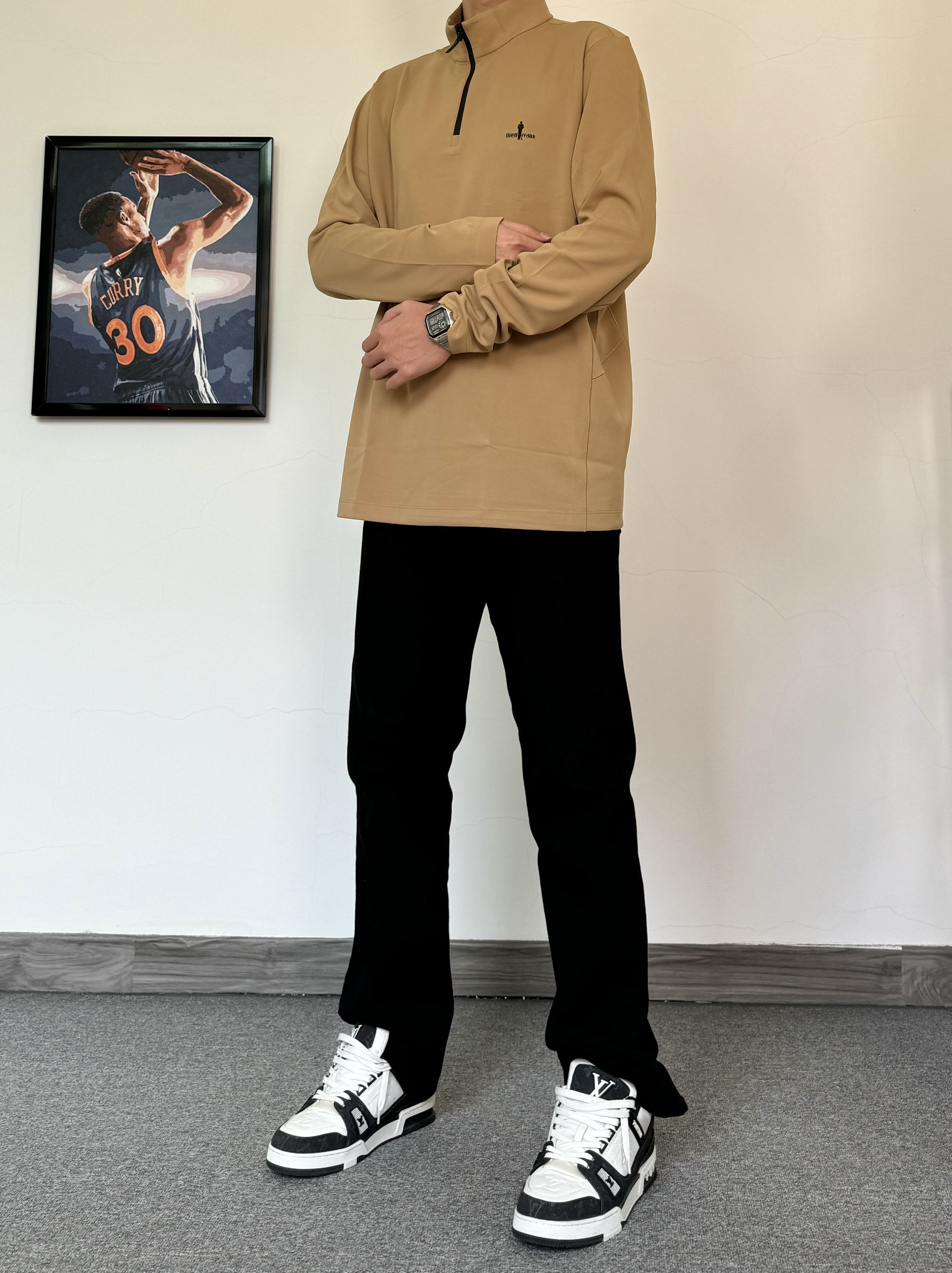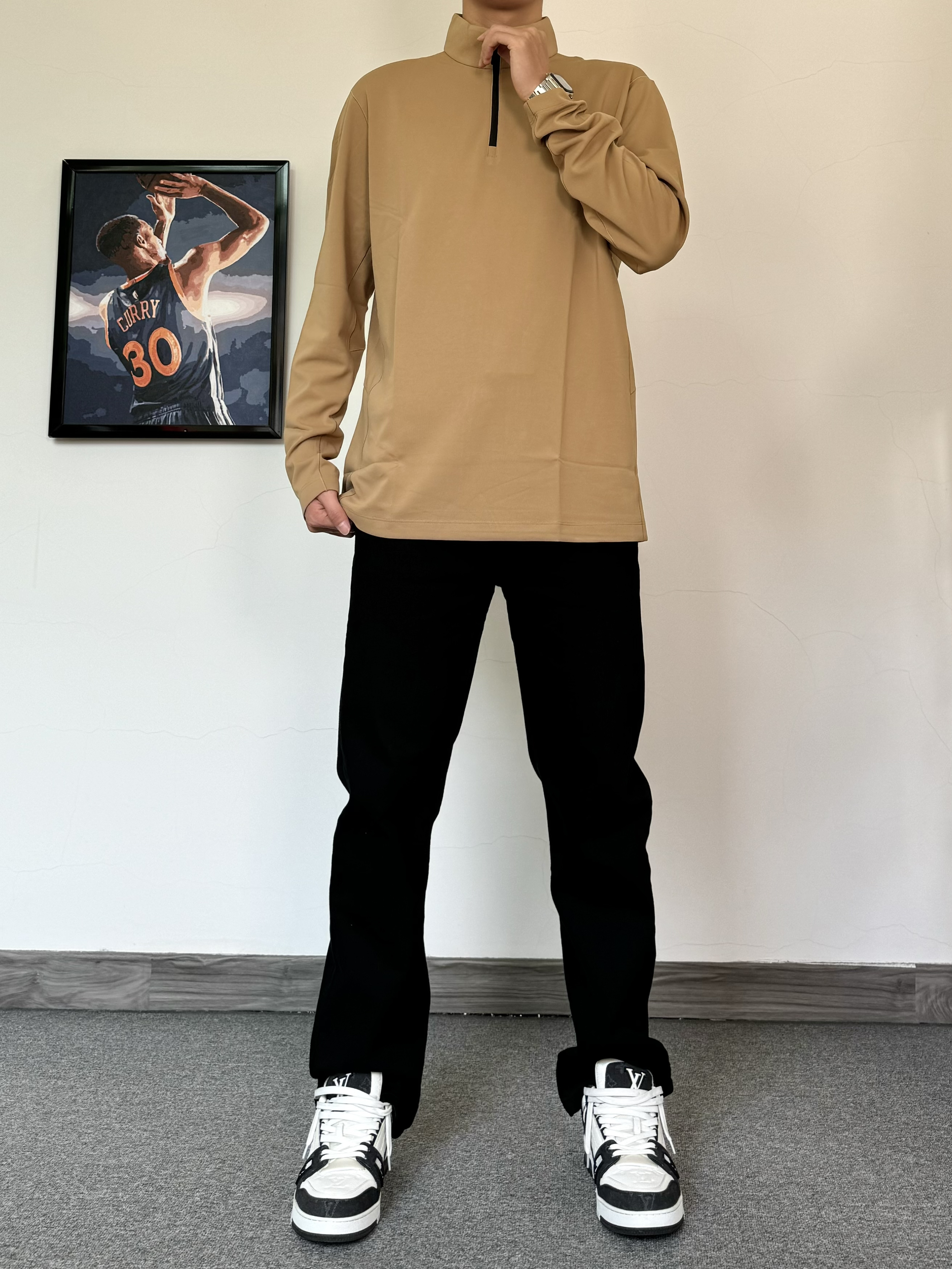 初春真的太好穿衣服了 上身一件质感立领T恤 面料柔软舒适 卡其色主打气质 搭配纯黑色牛仔裤配经典板鞋 黑白配色真的百搭! 轻松打造男大即视感✨