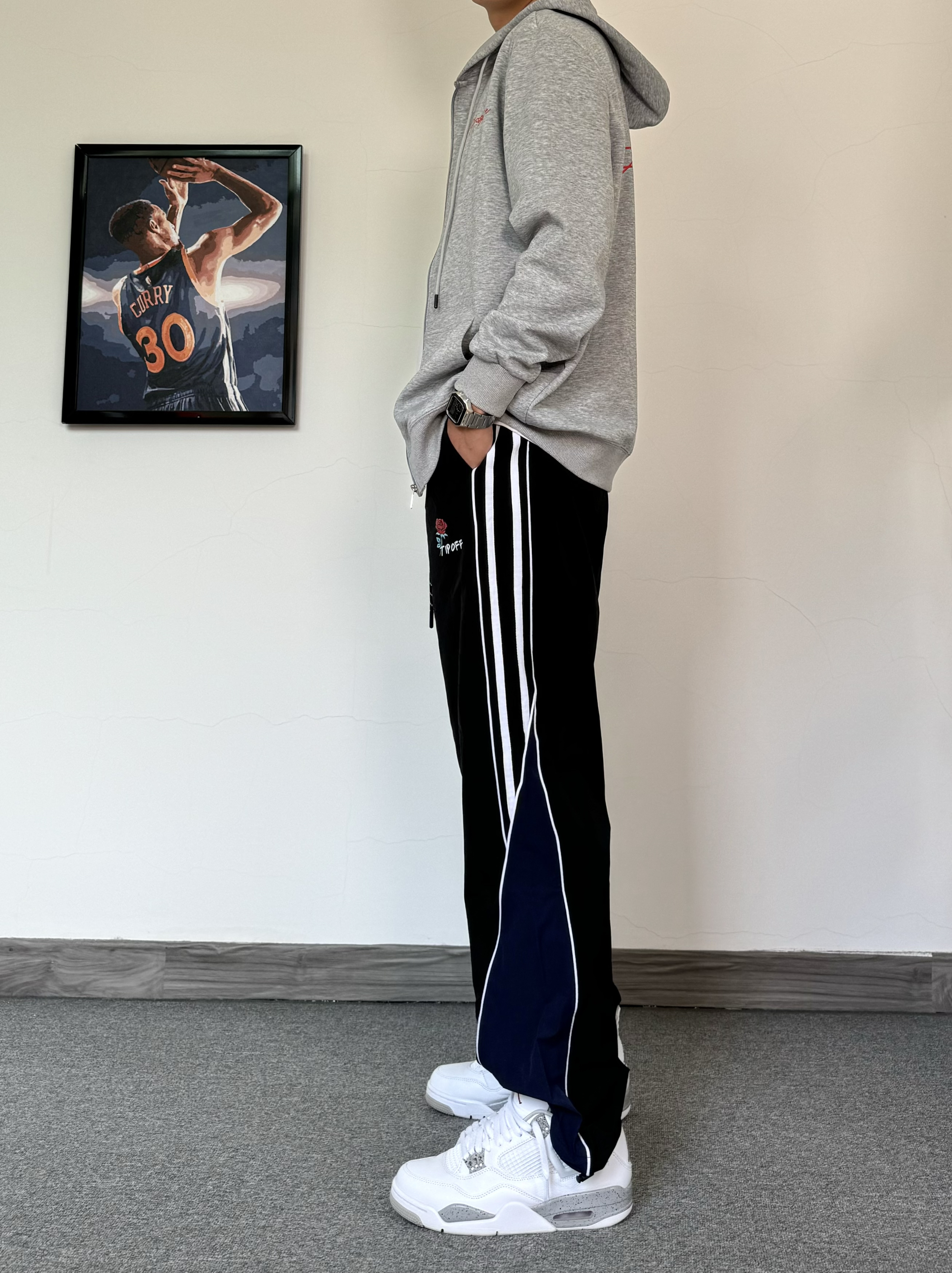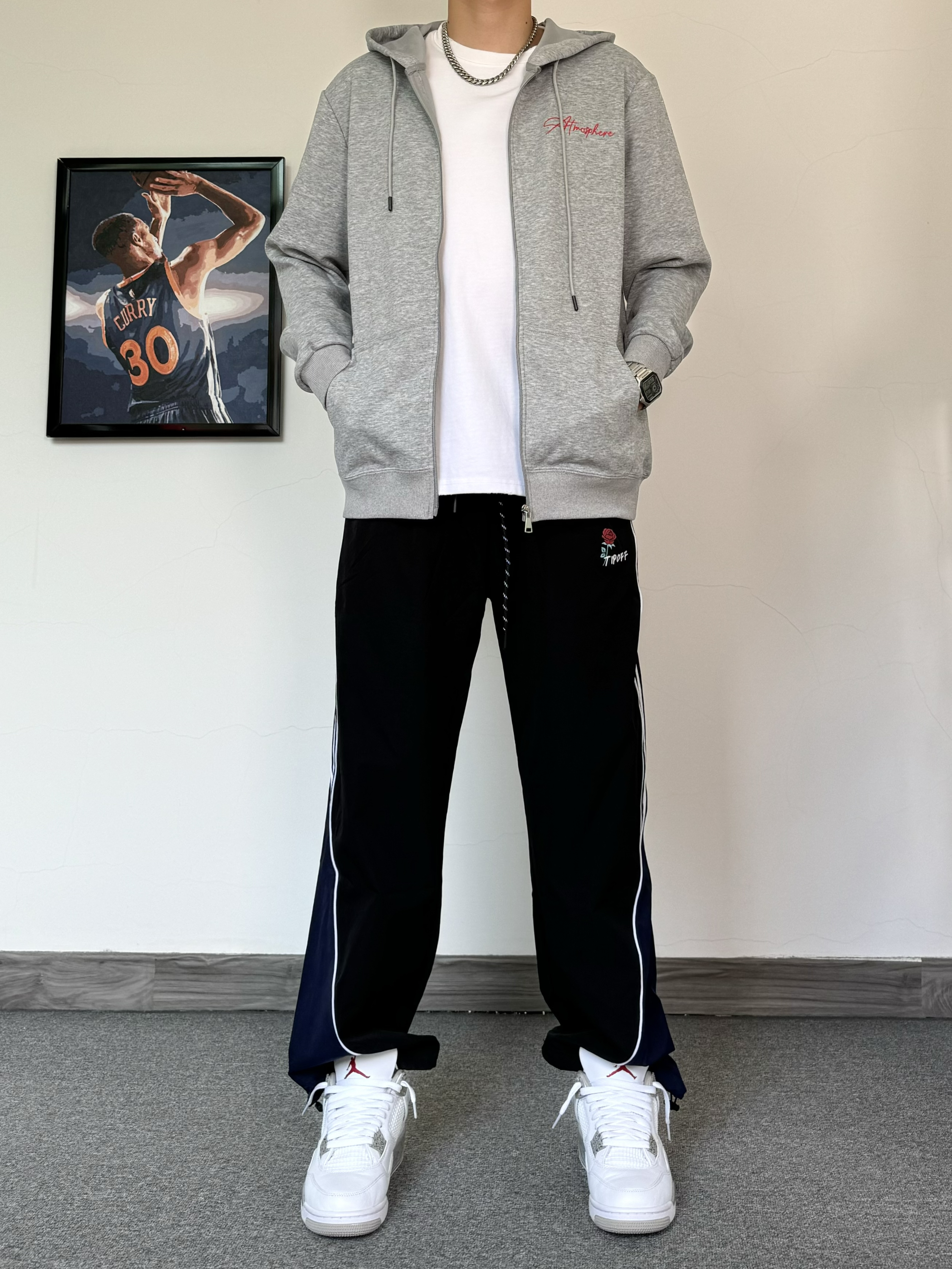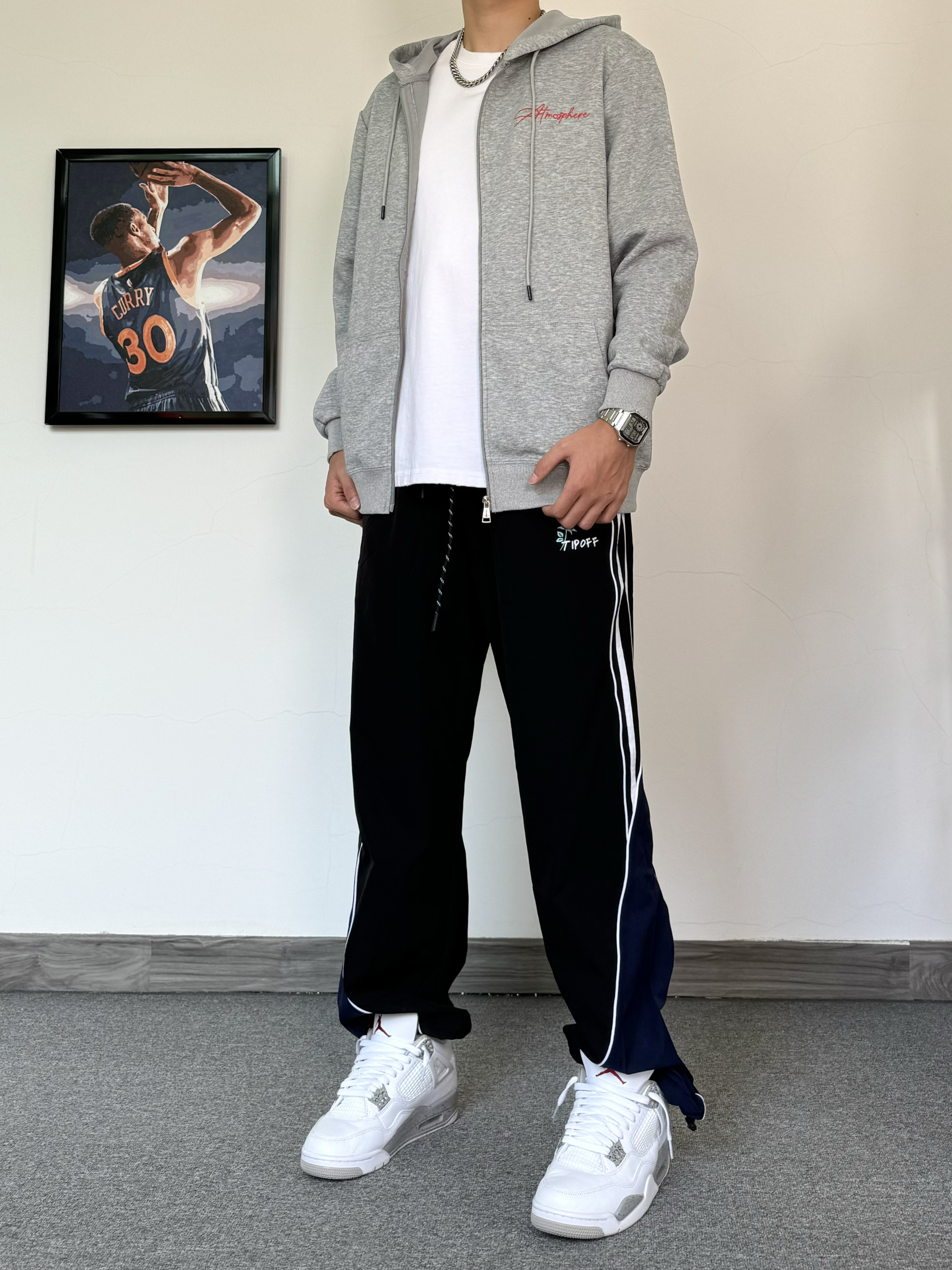 开春了穿上一件灰色卫衣 内搭白色T恤 层次感十足 搭配上一条宽松休闲裤 拼接配色尊嘟很帅 裤脚还有收口设计 细节一波 脚下百搭的aj4 妥妥的百搭单品