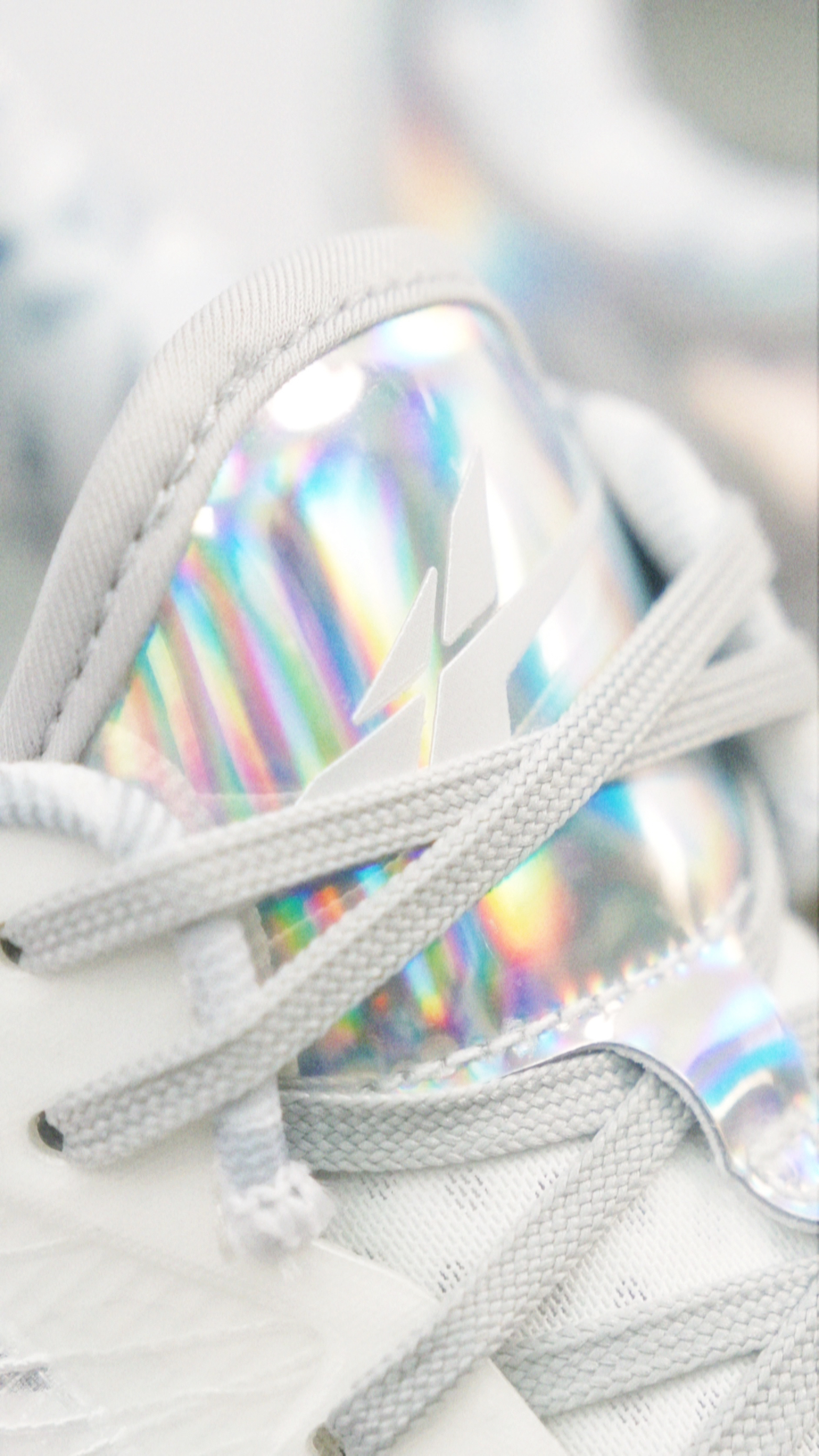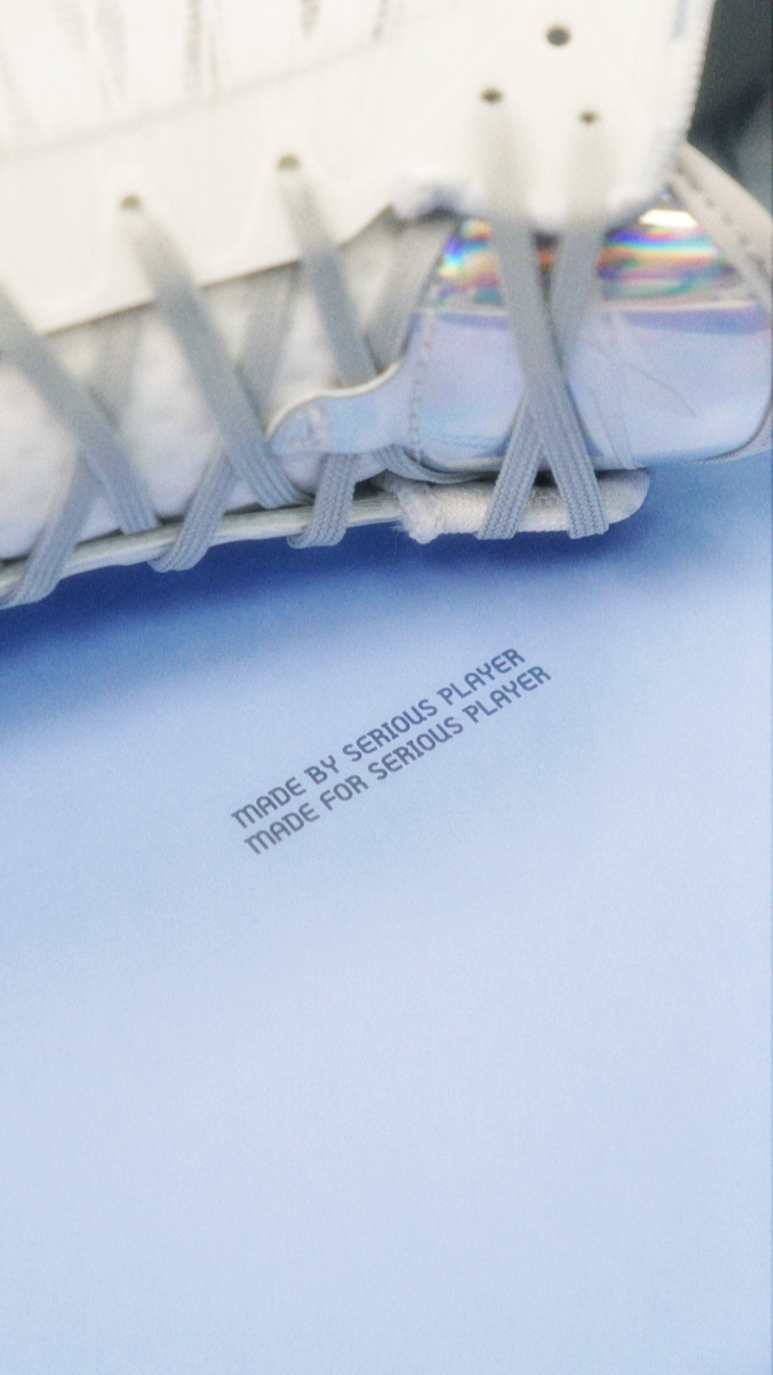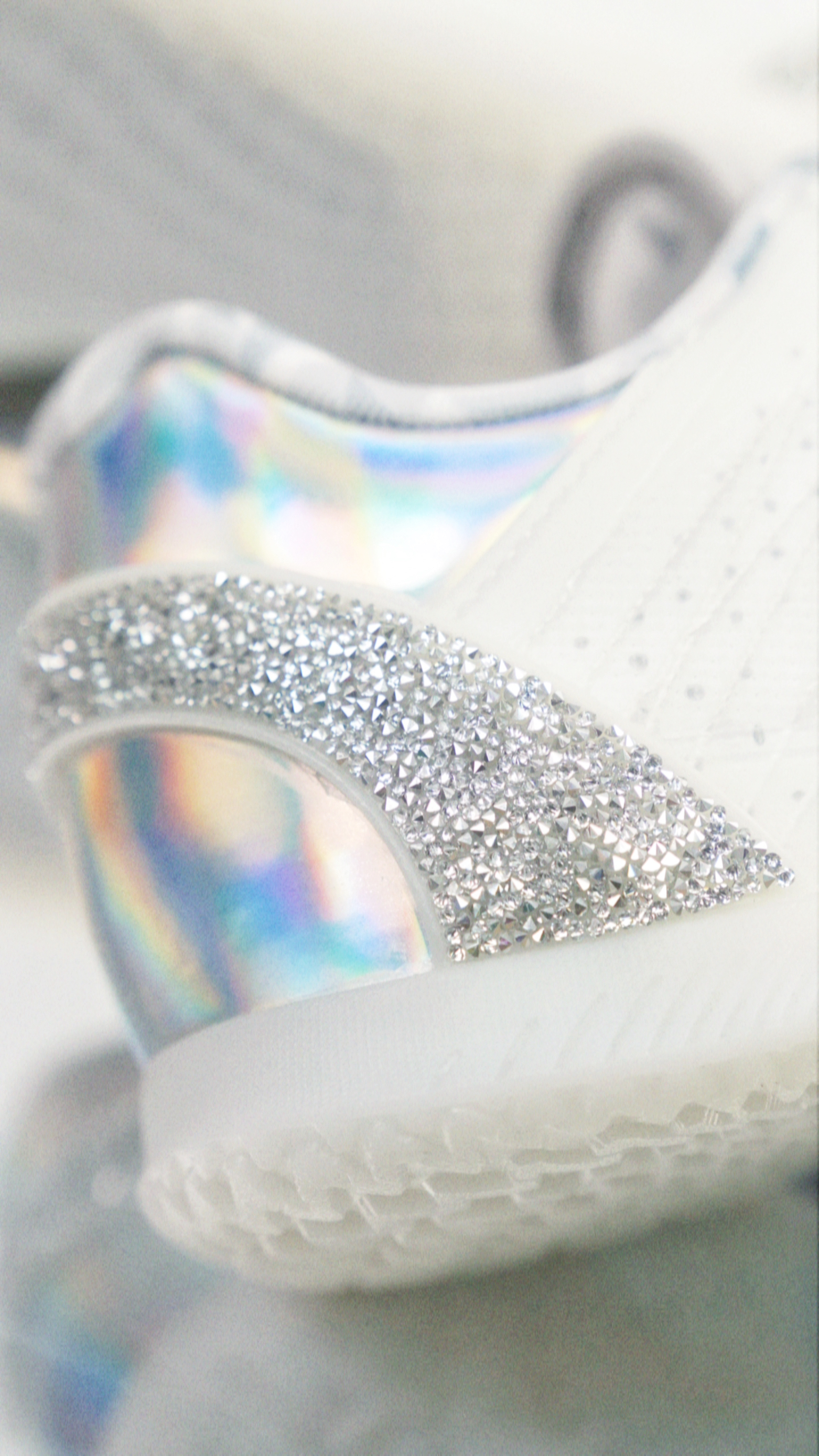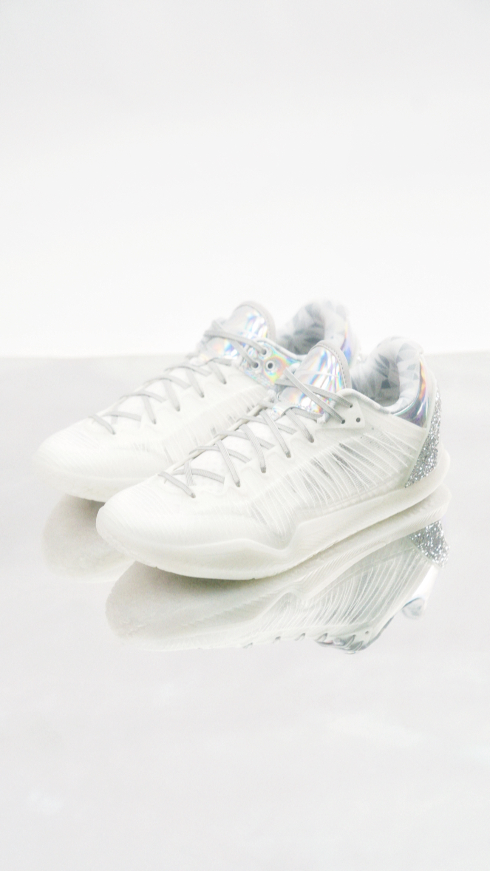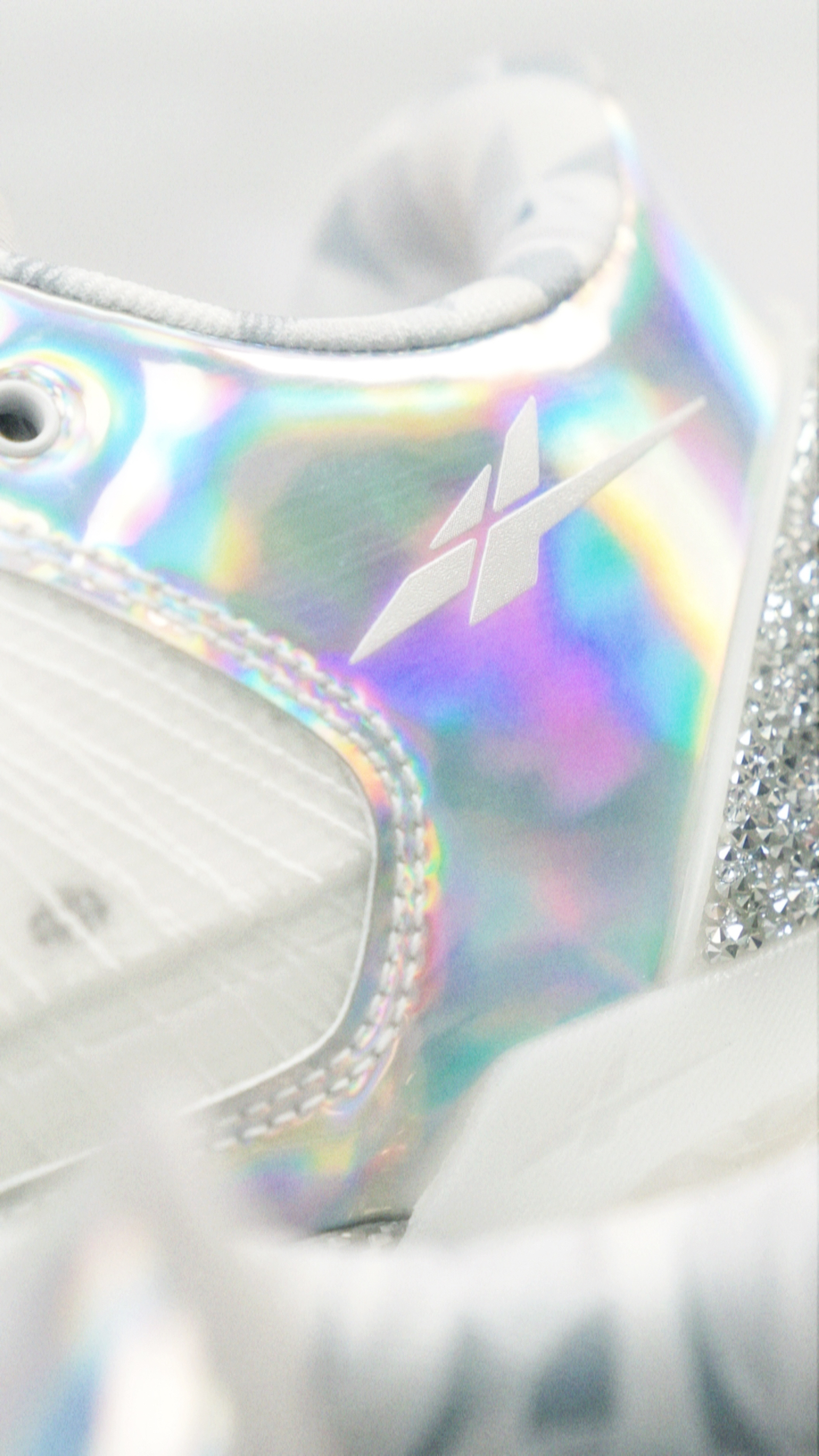 SPO和施华洛世奇联名的Player 1 Plus,主体白色搭配后跟的一圈碎钻和镭射质感的皮质,好帅! 鞋内衬是钻石切割的图案,很细节了。 这次害特别的用了蓝色鞋盒,还有两个单独的白色防尘袋。