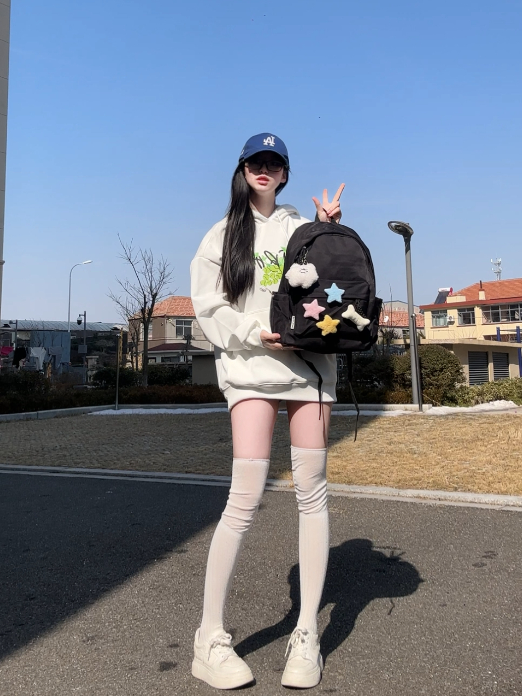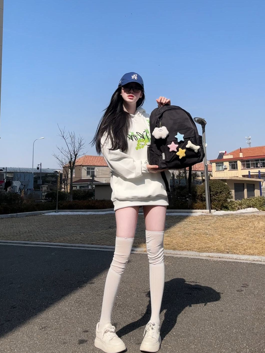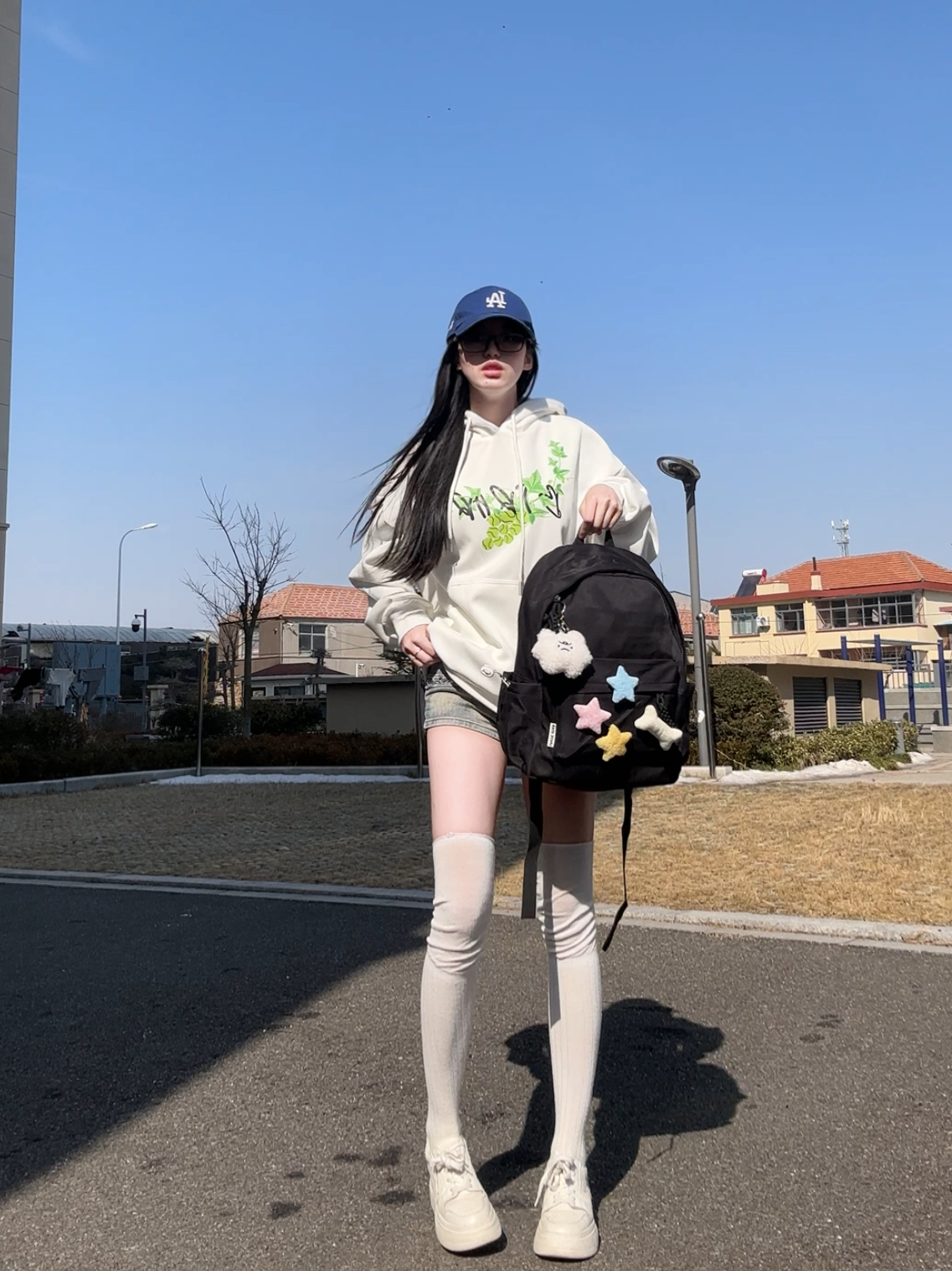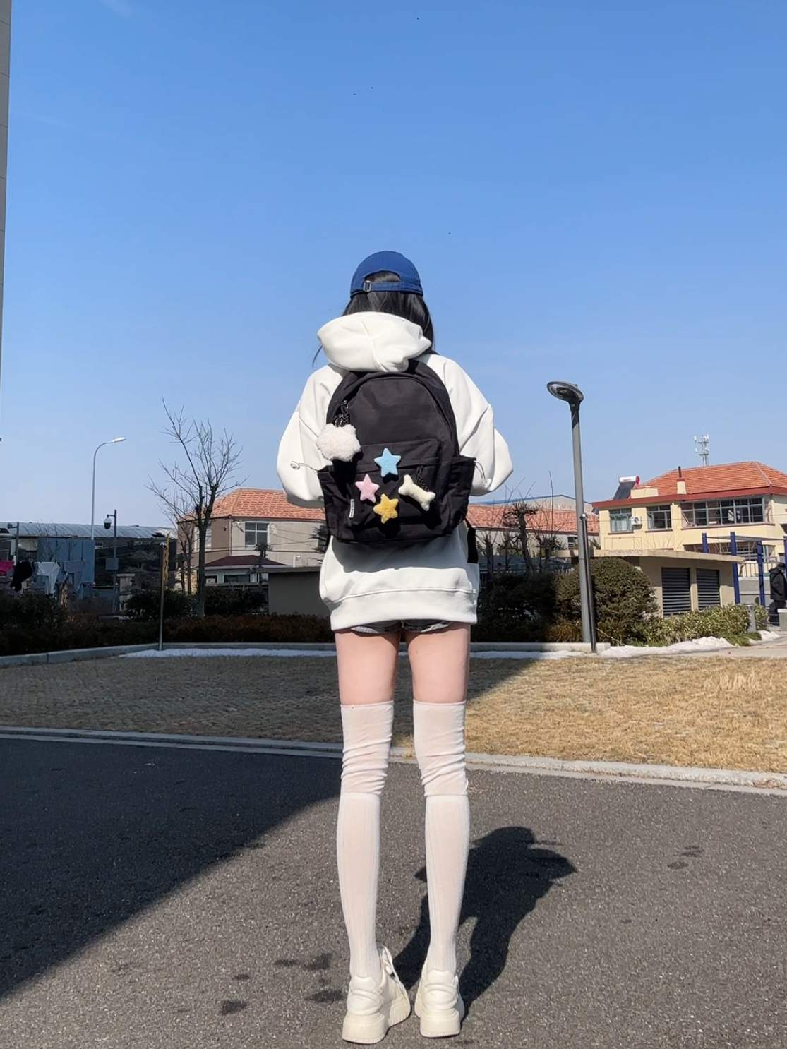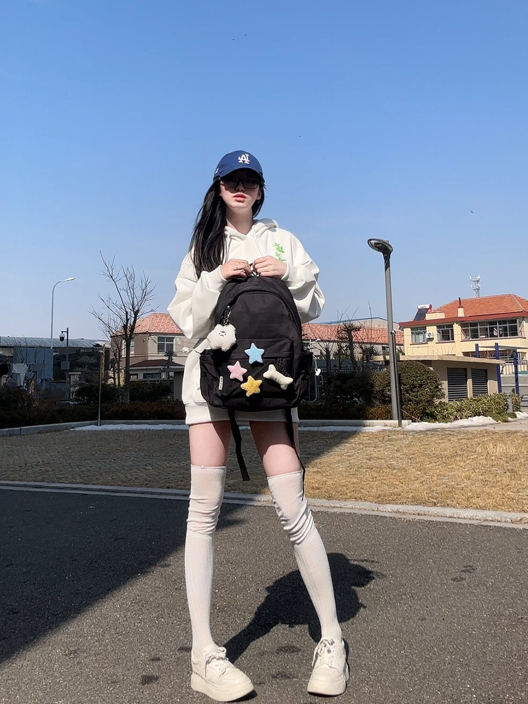 🎒: UNITE STAR 回头率好高的一身穿搭~ 点睛之笔是我的双肩包 纯色黑色经典又复古~ 可拆卸挂件真的好可爱好吸睛 容量也很大,能装好多东西 时髦感和实用性同在, 少年感拉满啦 通勤约会都没问题!!