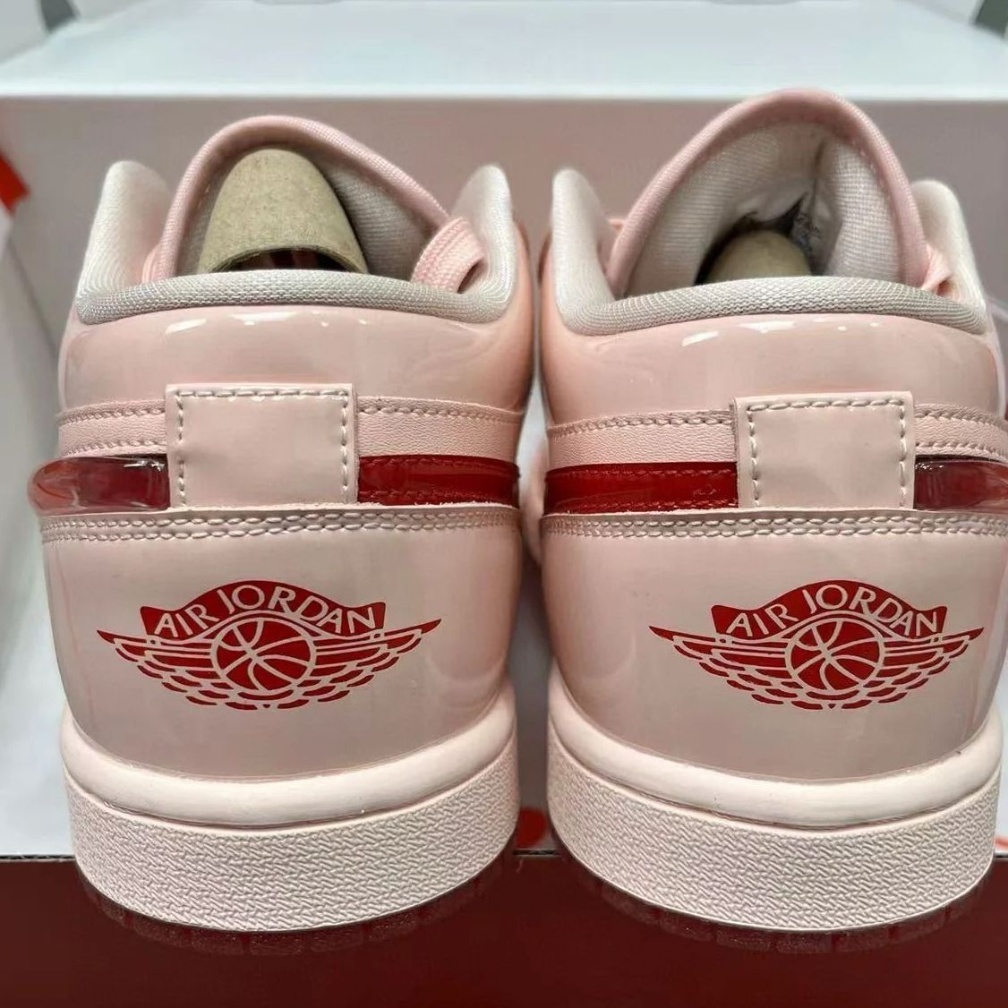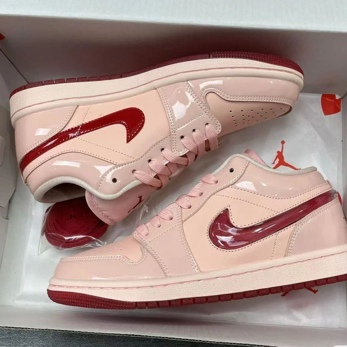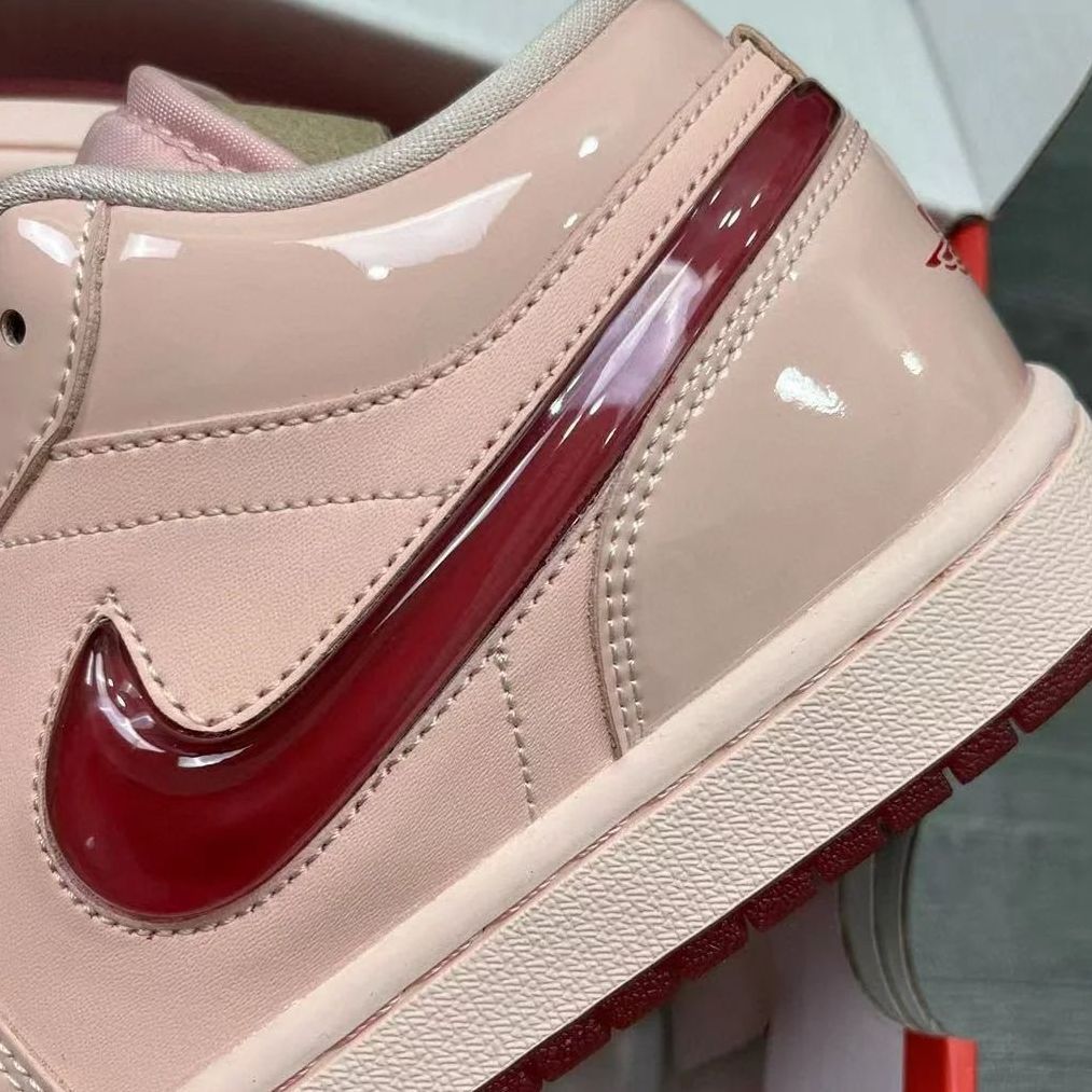 这是NIKE的Air Jordan 1 Low情人节限定女款低帮运动鞋。淡粉色主调搭配红色点缀,尽显少女心。鞋面采用亮面材质,易清洁;侧身果冻质感红色Swoosh标志辨识度高,鞋舌小飞人logo和鞋跟红色飞翼细节满满,鞋垫还有爱心图案增添浪漫氛围。红色橡胶大底防滑耐磨,既适合日常穿着,也适合运动,是送礼的不错选择。