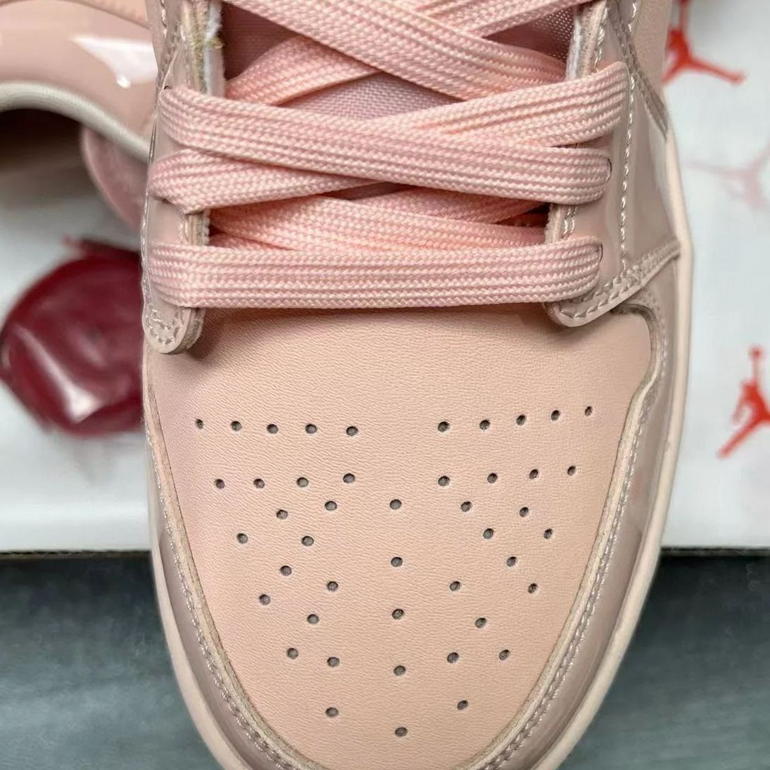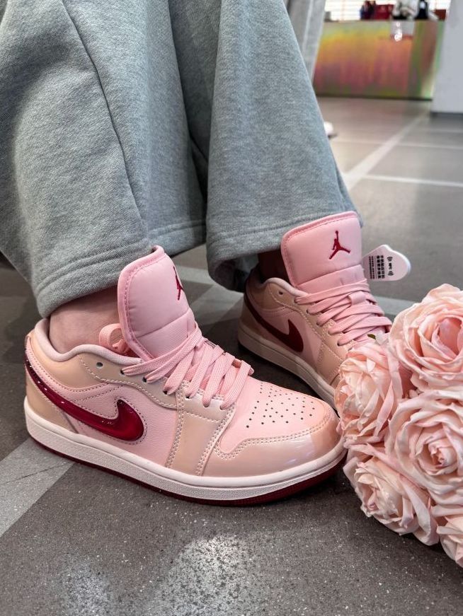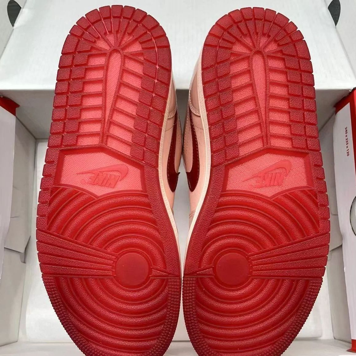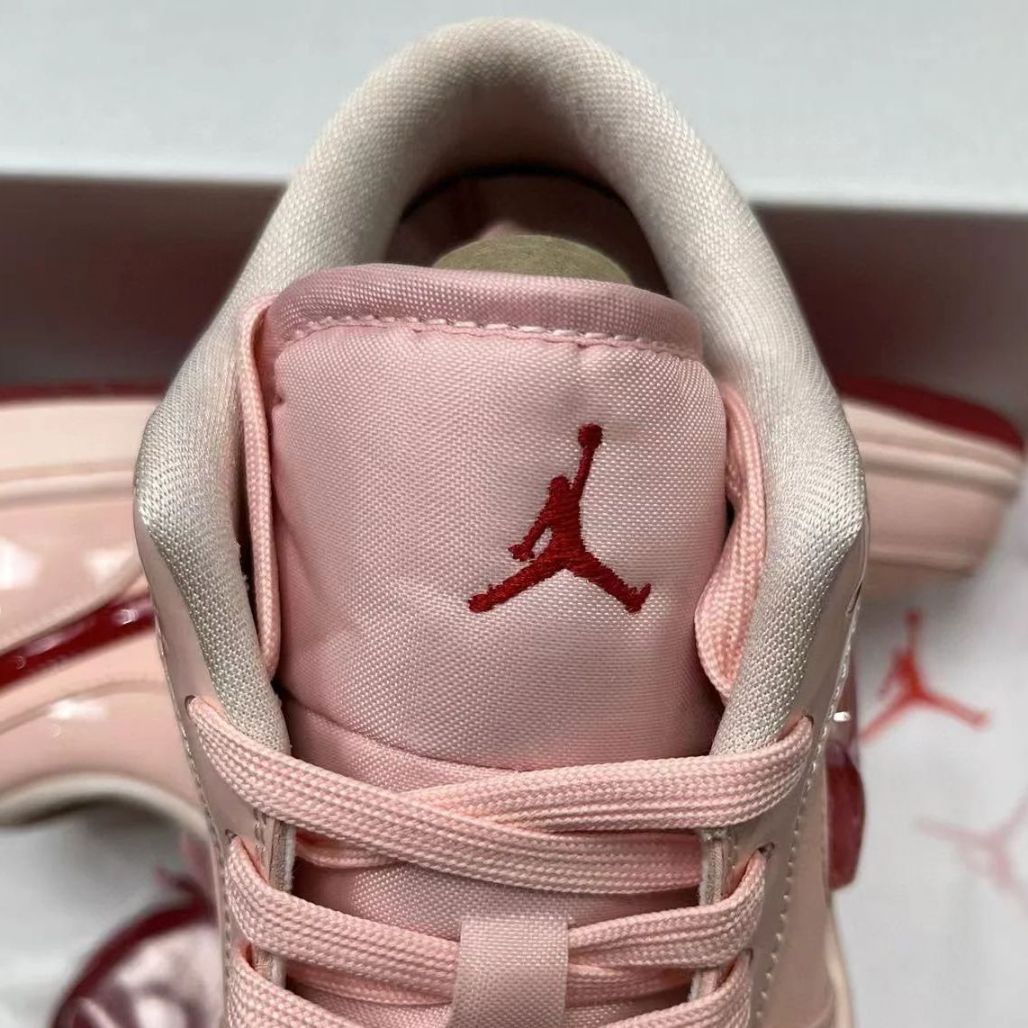 这是NIKE的Air Jordan 1 Low情人节限定女款低帮运动鞋。淡粉色主调搭配红色点缀,尽显少女心。鞋面采用亮面材质,易清洁;侧身果冻质感红色Swoosh标志辨识度高,鞋舌小飞人logo和鞋跟红色飞翼细节满满,鞋垫还有爱心图案增添浪漫氛围。红色橡胶大底防滑耐磨,既适合日常穿着,也适合运动,是送礼的不错选择。