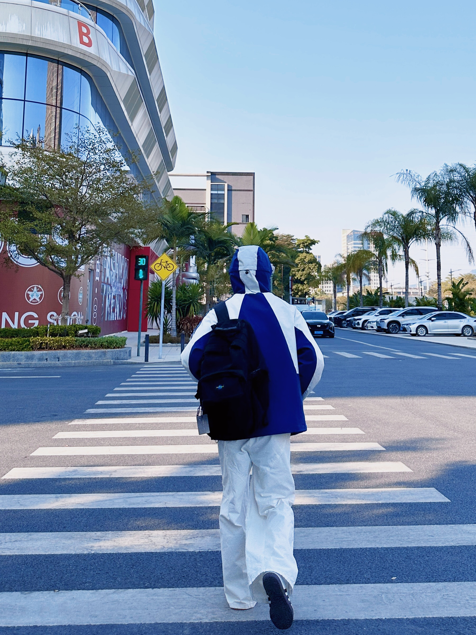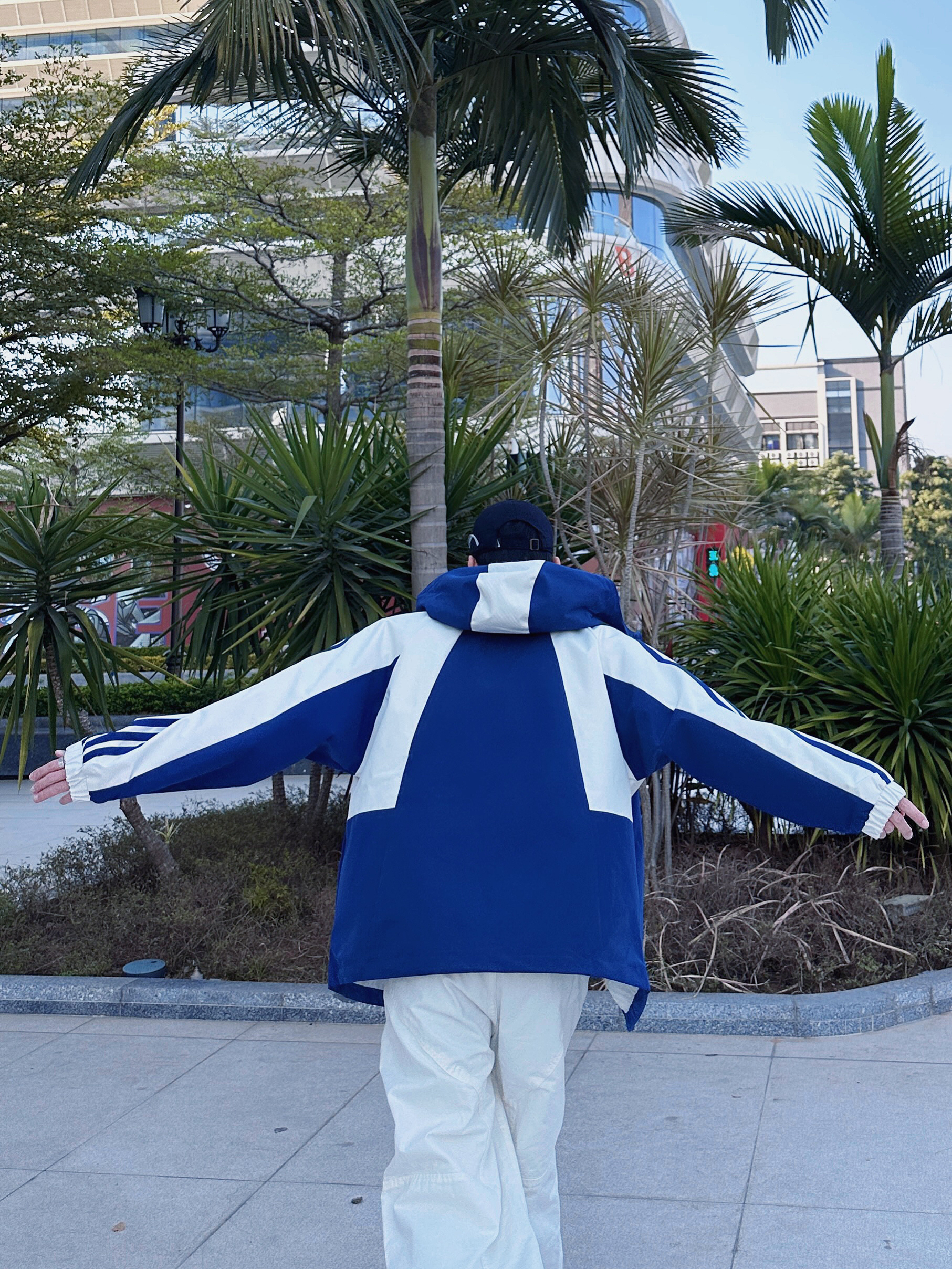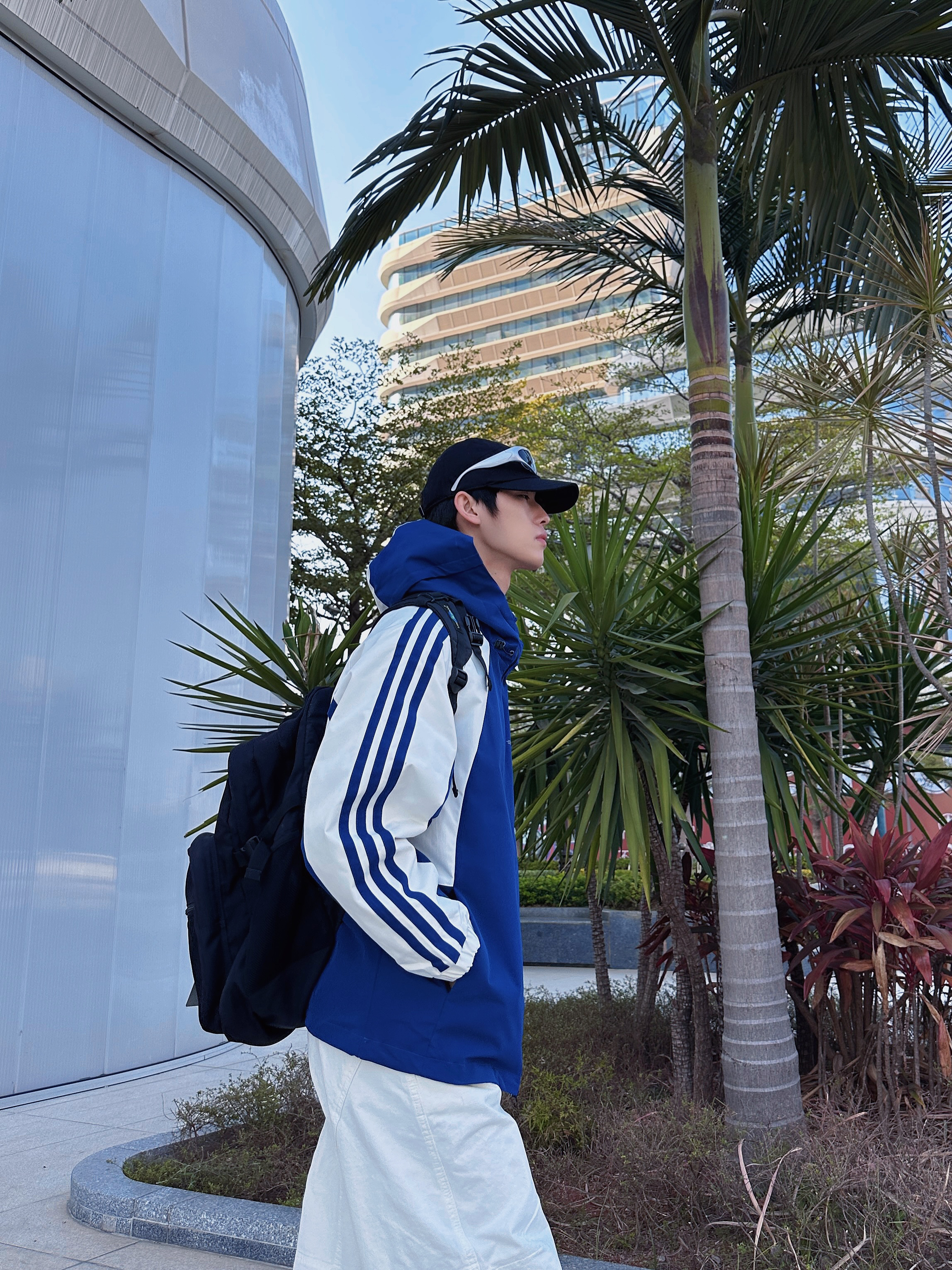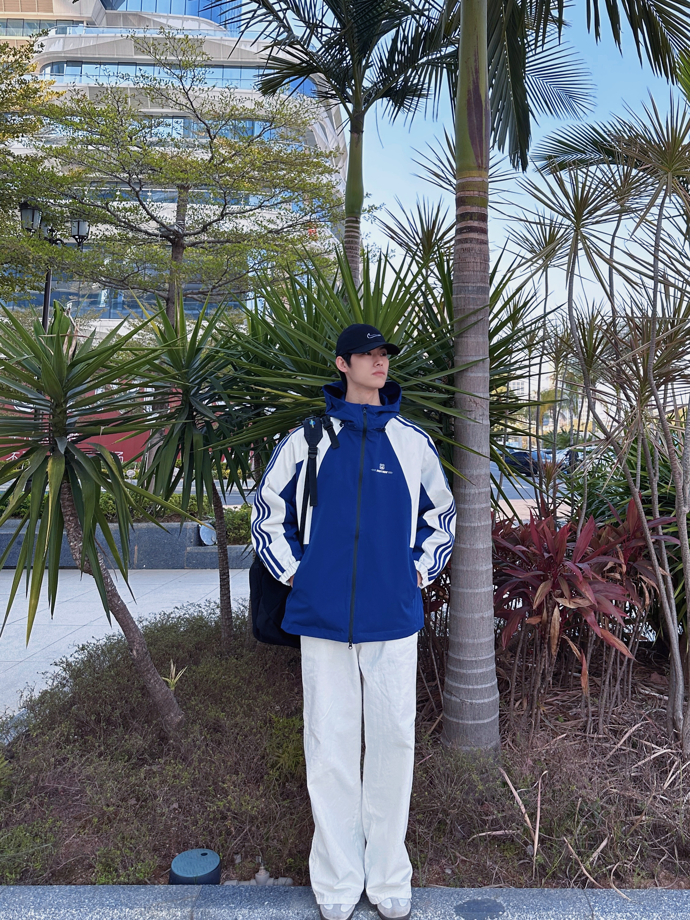 🍃分享春季户外穿搭! 再也不用里三层外三层的叠穿保暖咯 轻薄的户外风穿搭就很适合 春季防风防水的蓝白色冲锋衣 我真的爱了😍 高领十帽子的设计 ~拉链拉上真的很酷多 👖下装搭配白色裤子 蓝白配色自带清爽干净的少年感~ 春季徒步或出游穿再合适不过啦 ➖ 尺码参考:180cm | 65kgM穿XL码