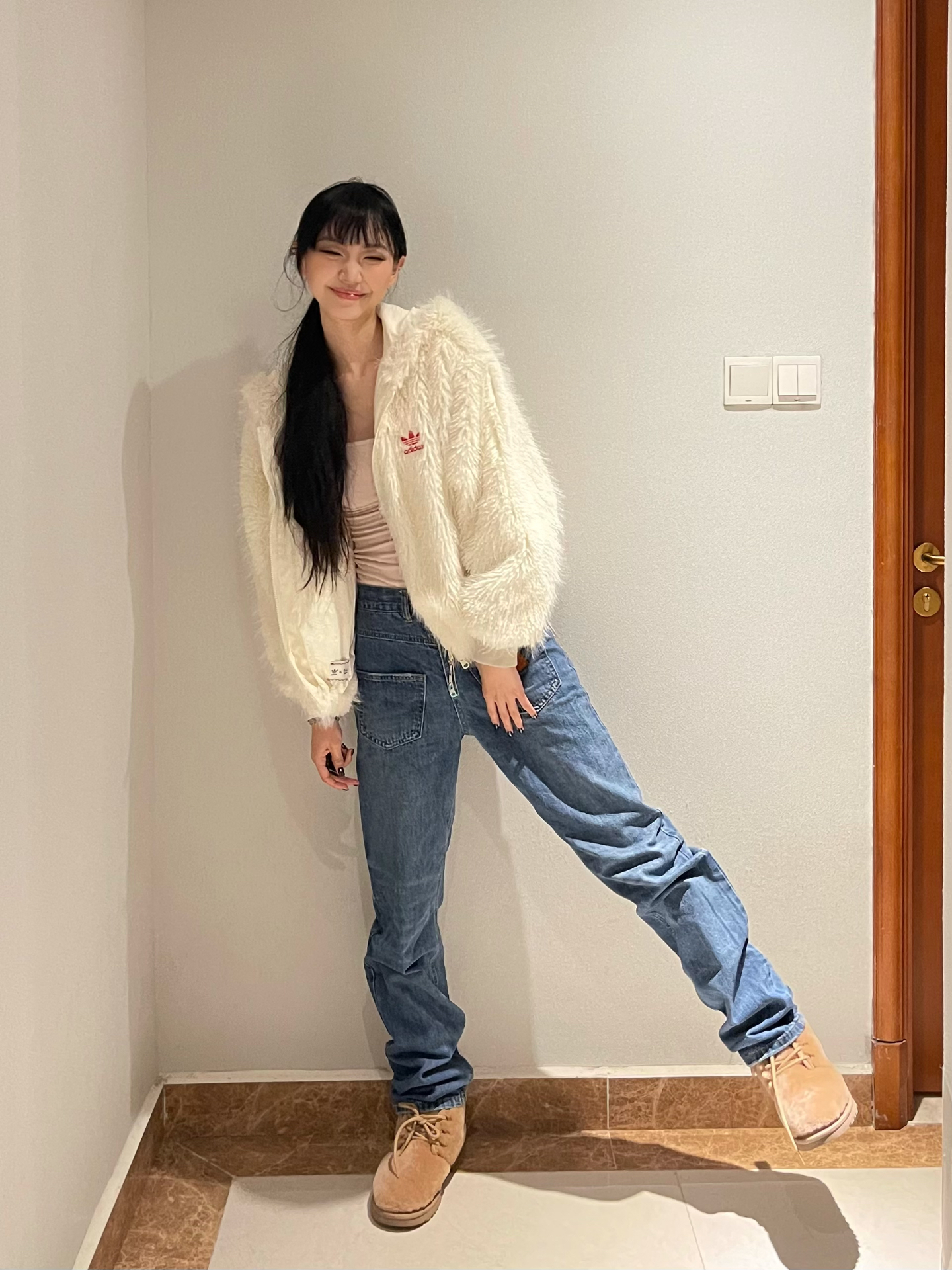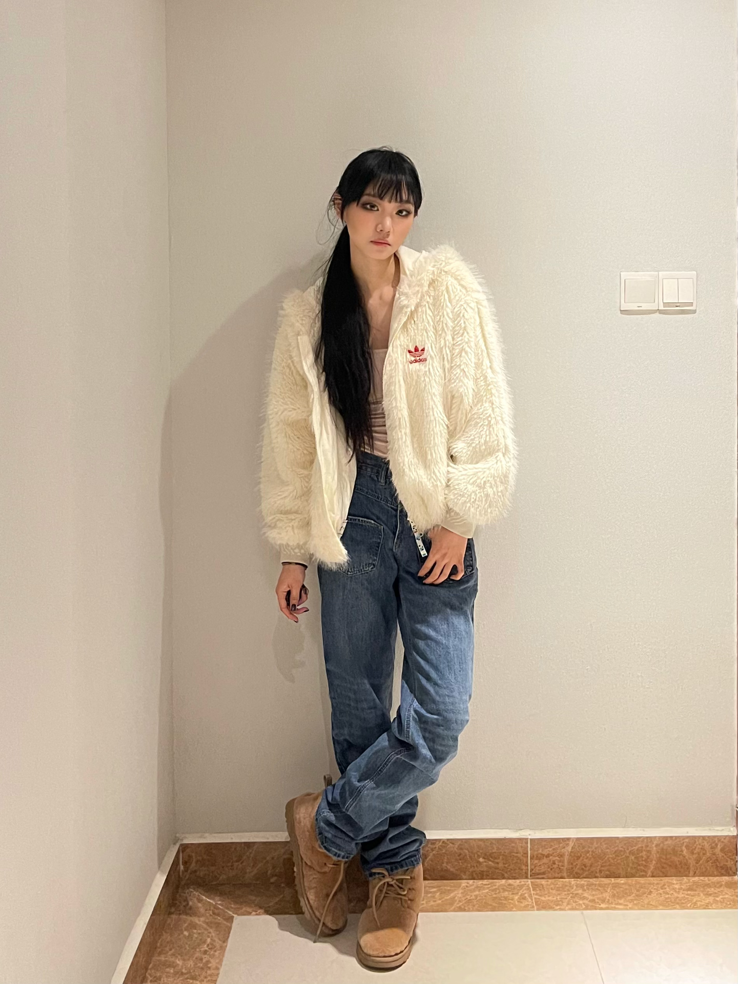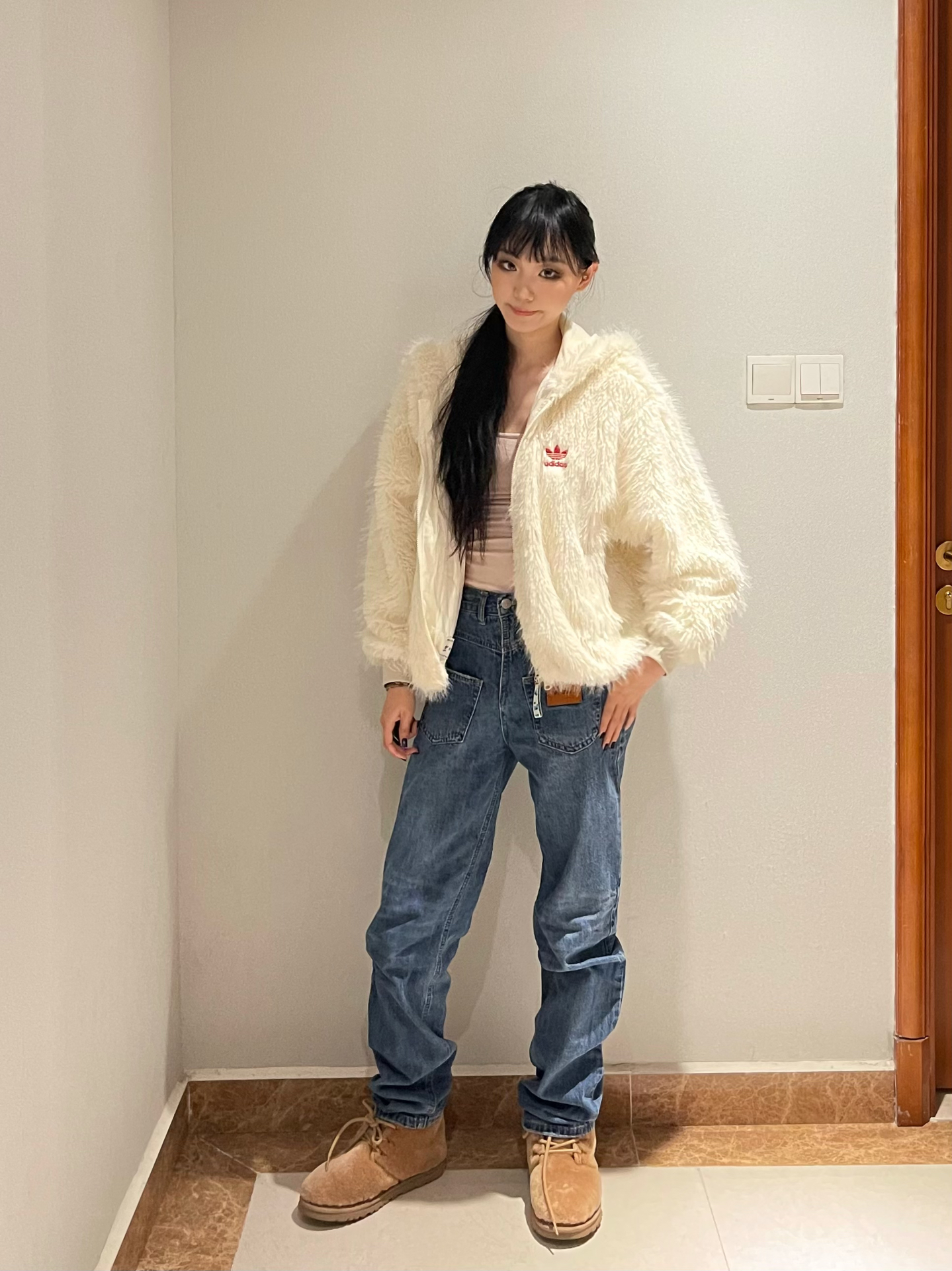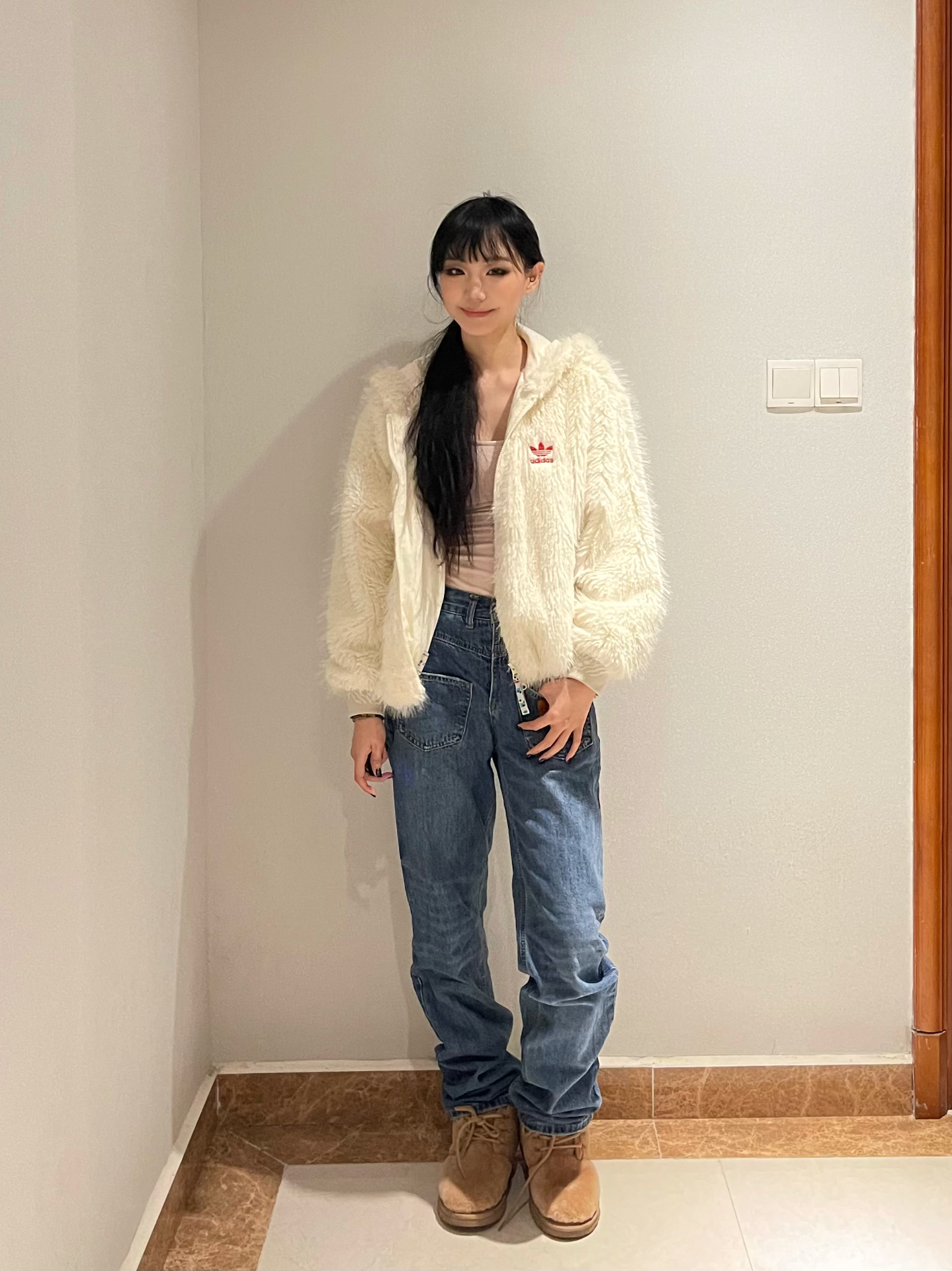👔:阿迪达斯白色毛毛外套 👟:ugg 非常实穿的一件外套 毛茸茸的特别暖和 图源网络侵删