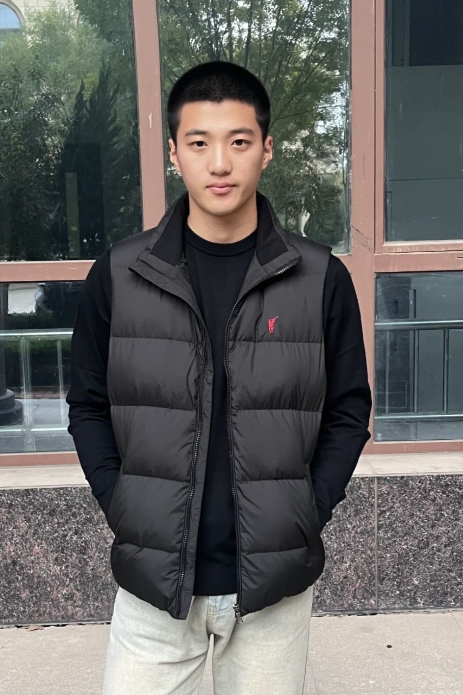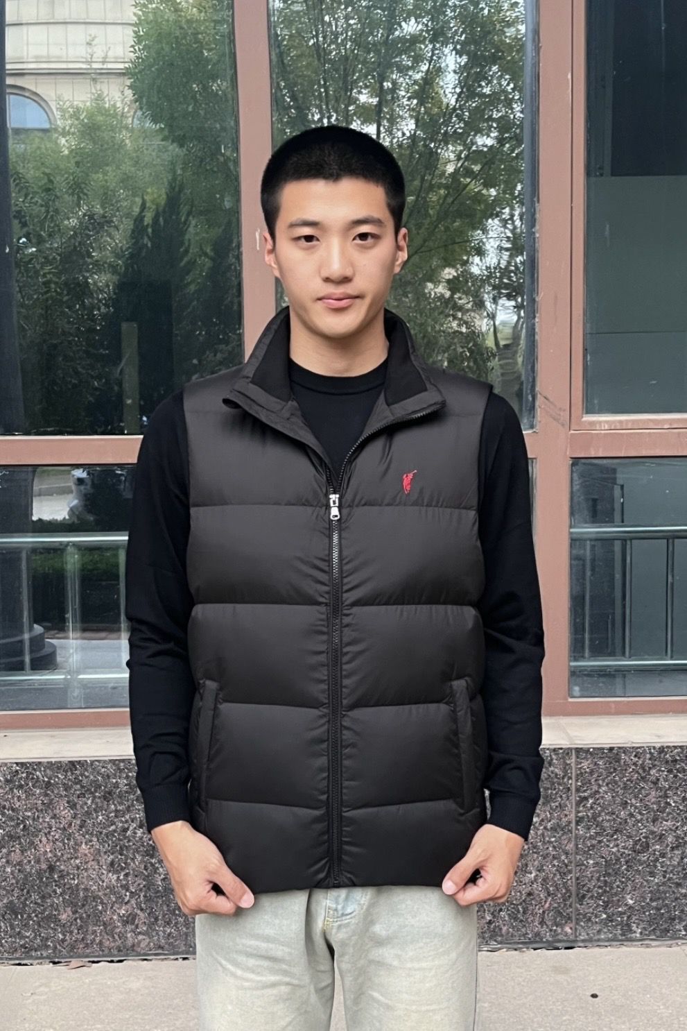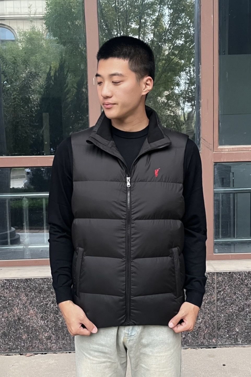 这个马甲是羽绒的 保暖性非常好 上身很舒服轻便! 版型很好!上身不显臃肿~ 标志是刺绣的工艺非常好看 简直就是春日出行的必备马甲~