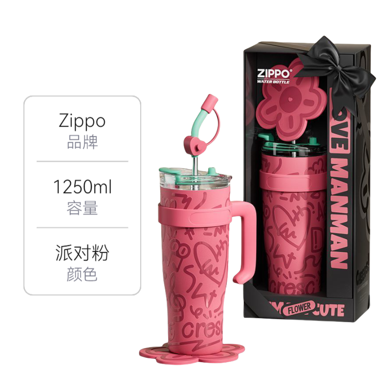 zippo你小汁太会设计了叭 粉色涂鸦花纹吼吼看耶 1250ml的敲大容量 ~ 大口喝水的感觉尊嘟好爽 出门带这一杯就够啦! 内胆是316不锈钢滴 不仅用着放心还嘎嘎保温 杯口直饮➕自带大吸管 本吸管脑袋狠狠爱住了! 图源网络,侵删