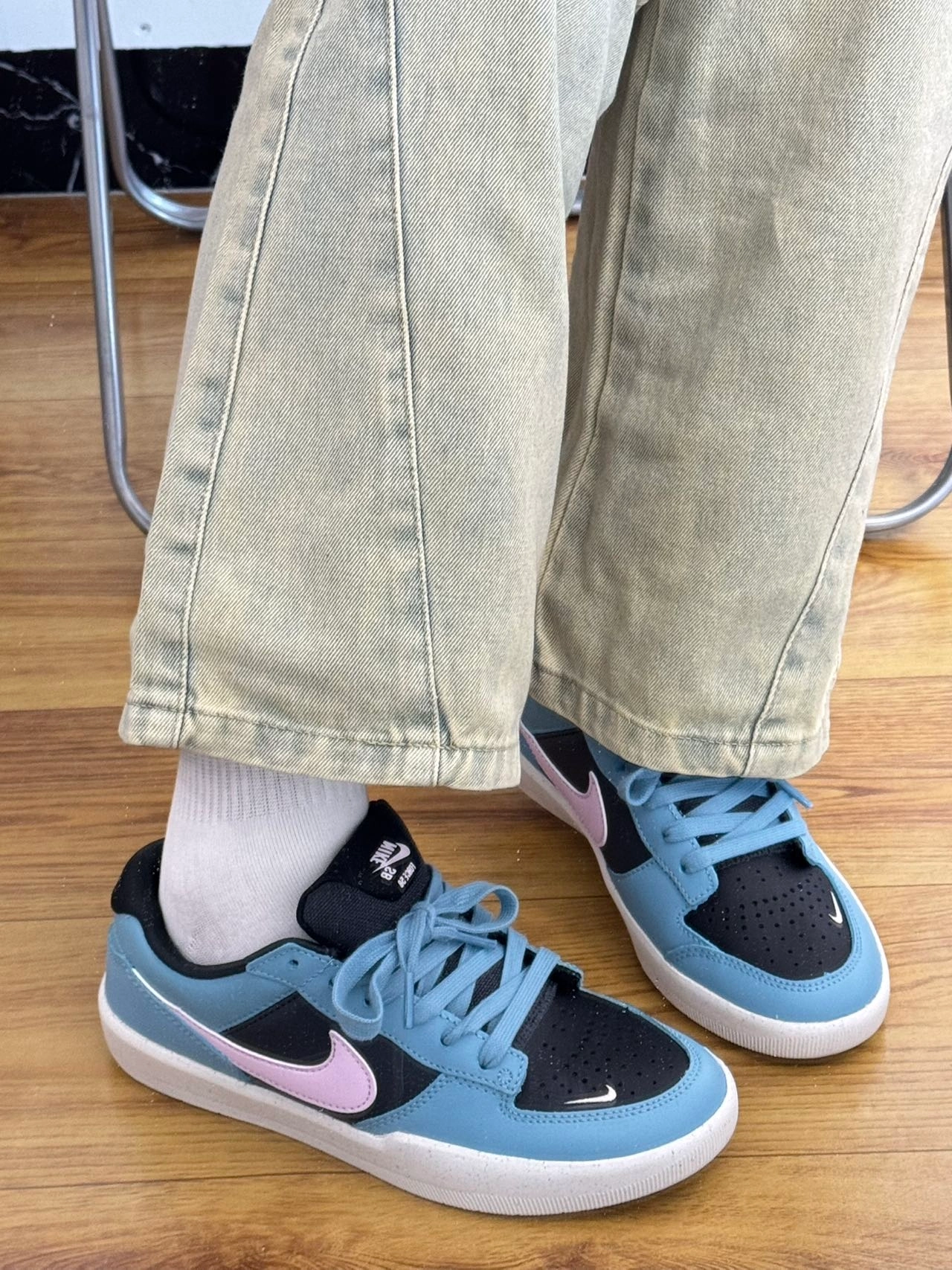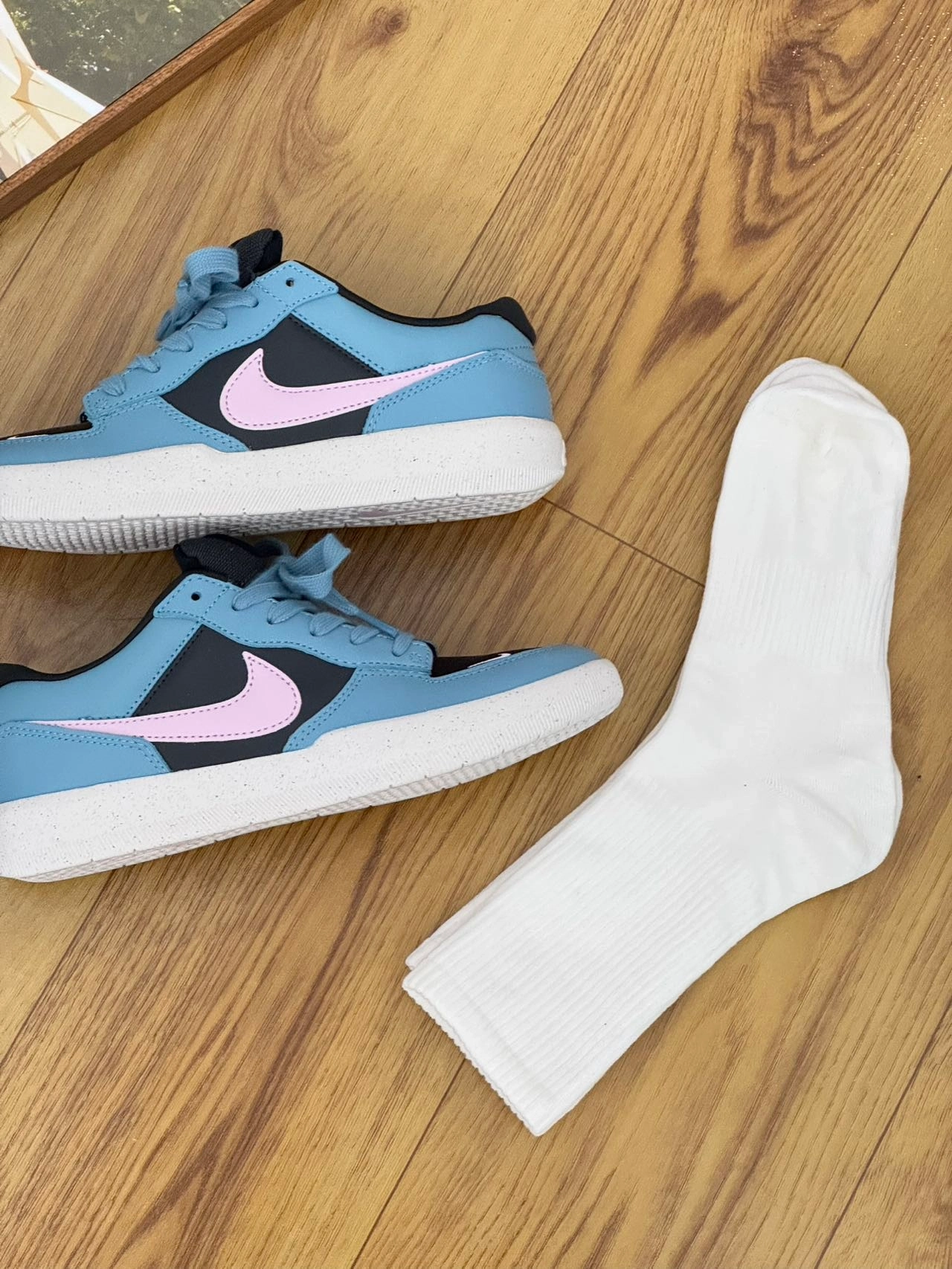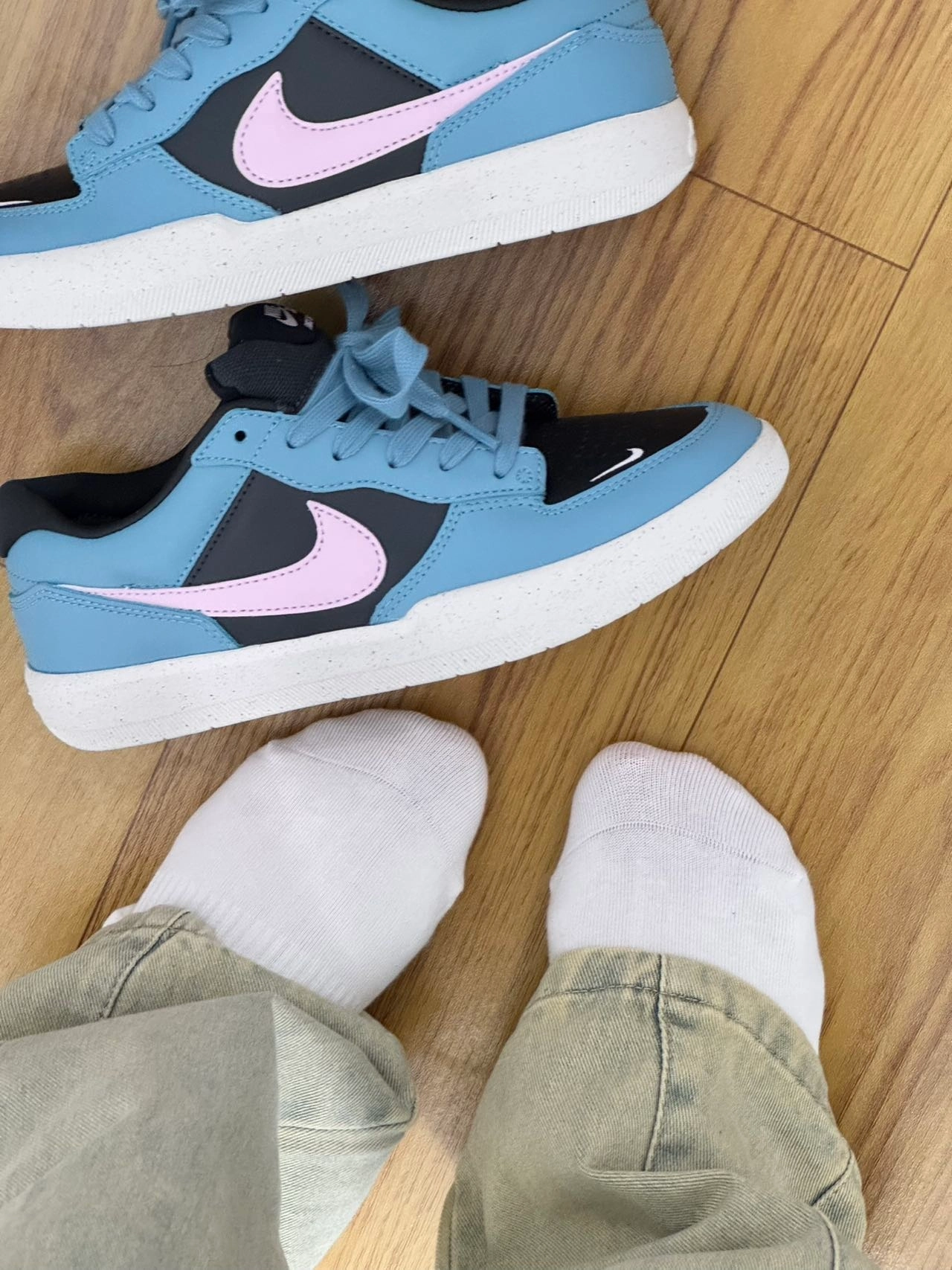 纯棉的上脚舒适又柔软~ 搭配板鞋很OK 很简约干净 春秋就喜欢穿这种特别一点的板鞋 脚感舒适 包裹性很强耶 Nike k蓝色