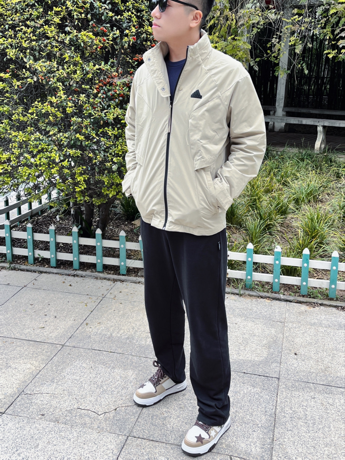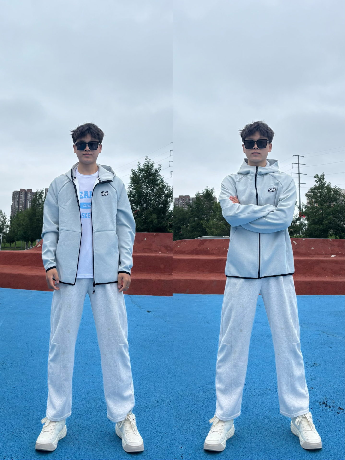 经典黑色,百搭又不挑人,宽松版型自在随性,行动无束缚。胸前爱心刺绣超吸睛,打破常规西装的单调,个性十足。内搭简约白 T,清爽干净;下身配西装裤硬朗帅气。春日出游、聚会,轻松成为人群中的型男。