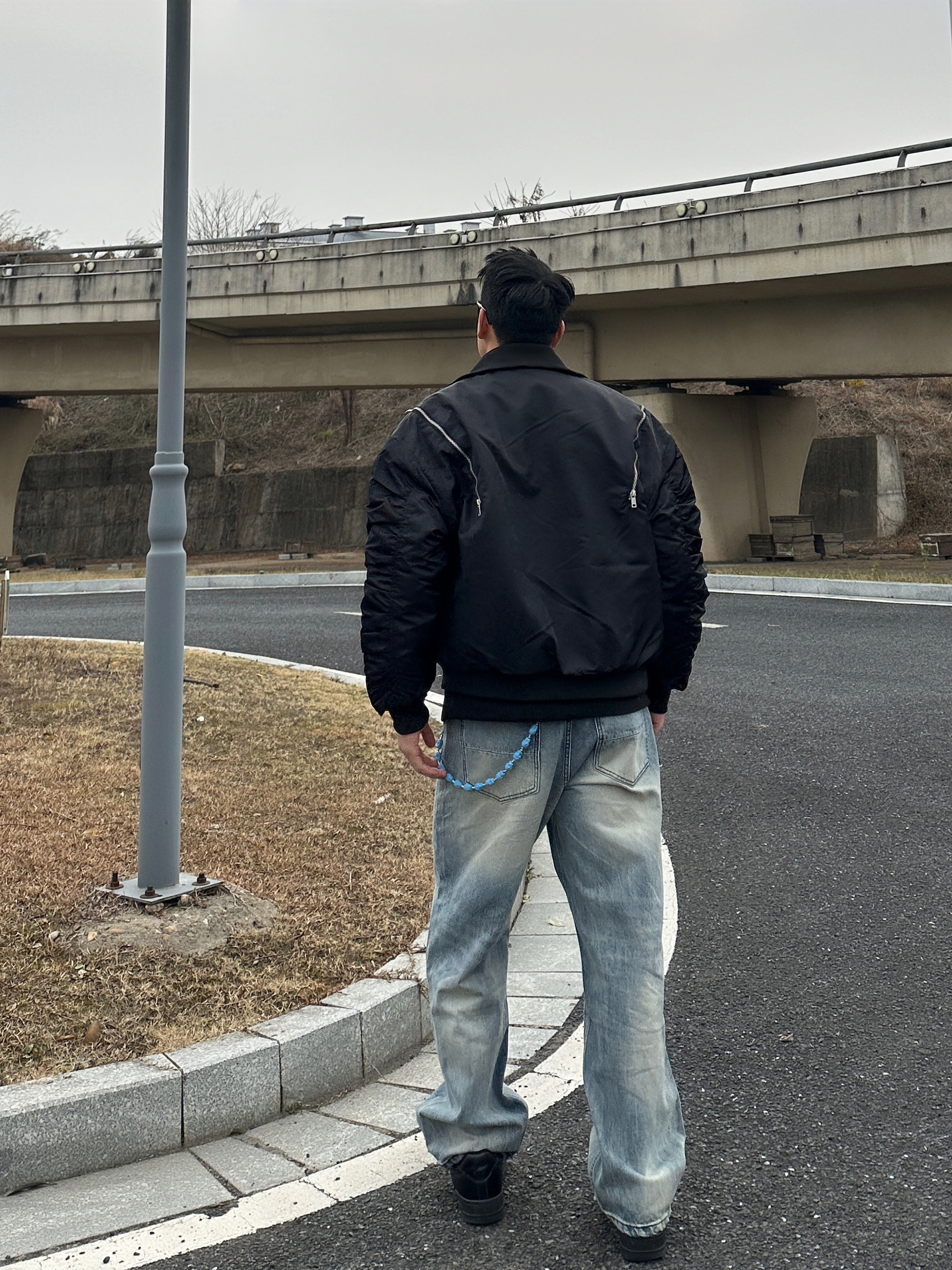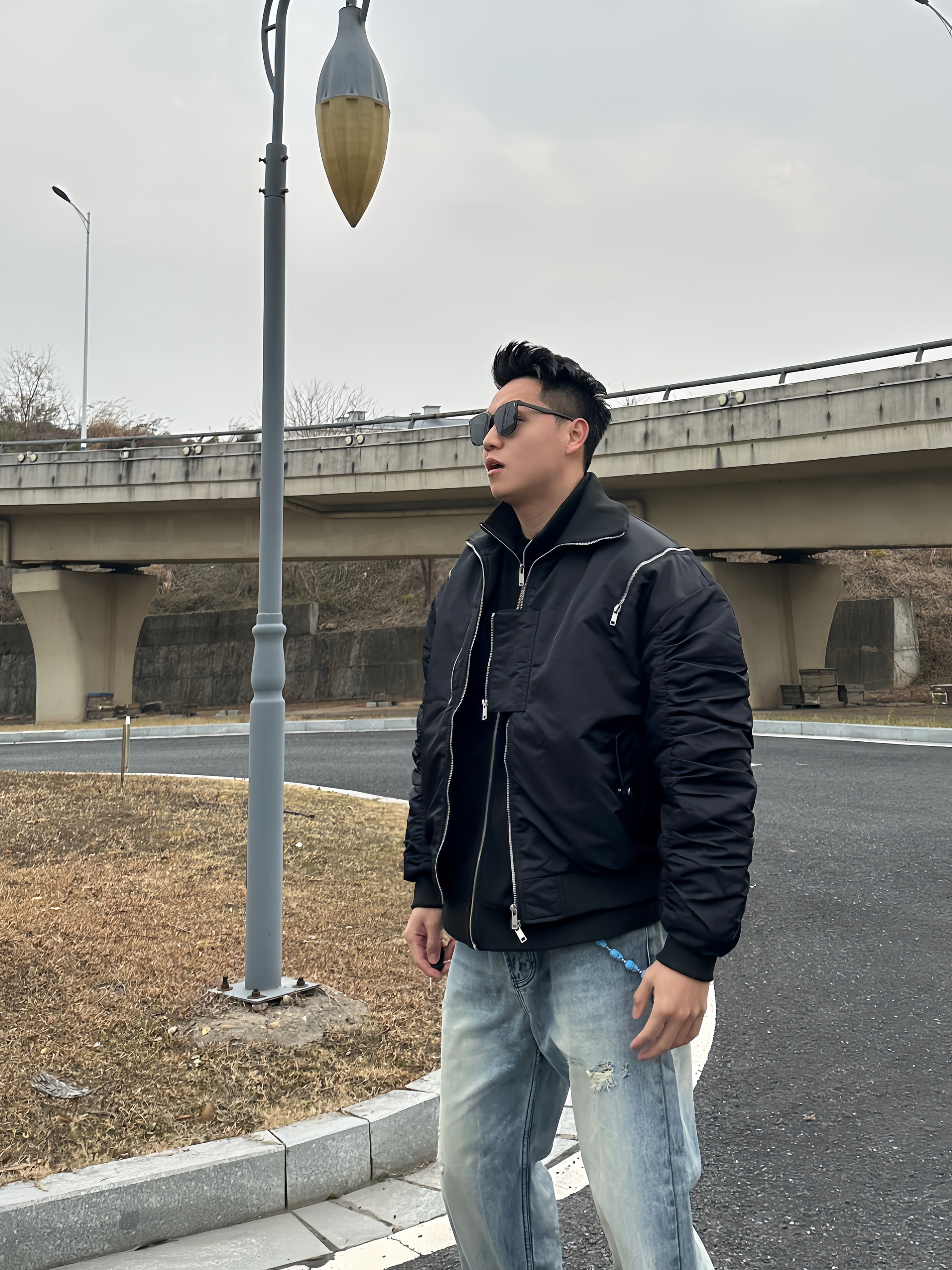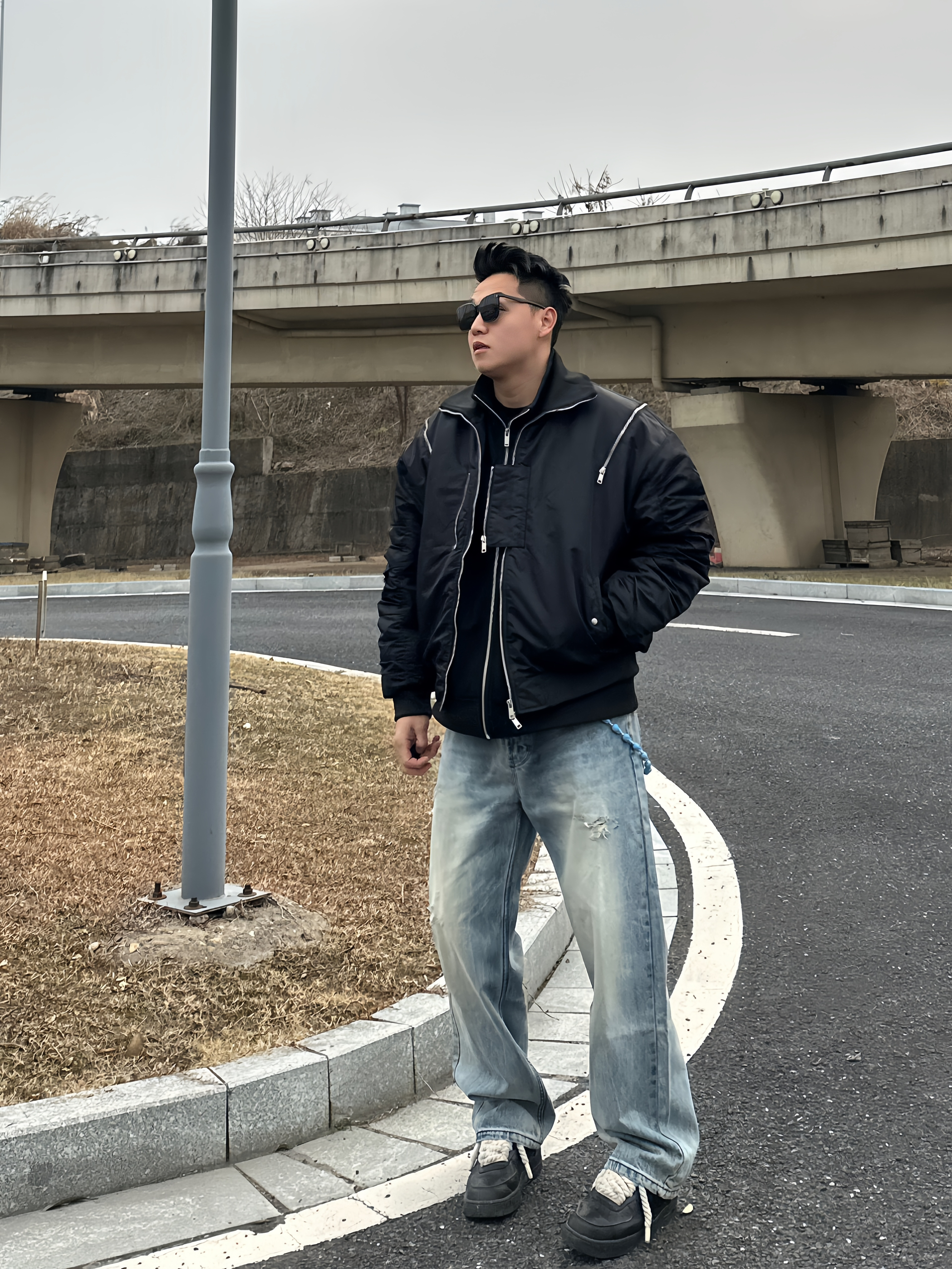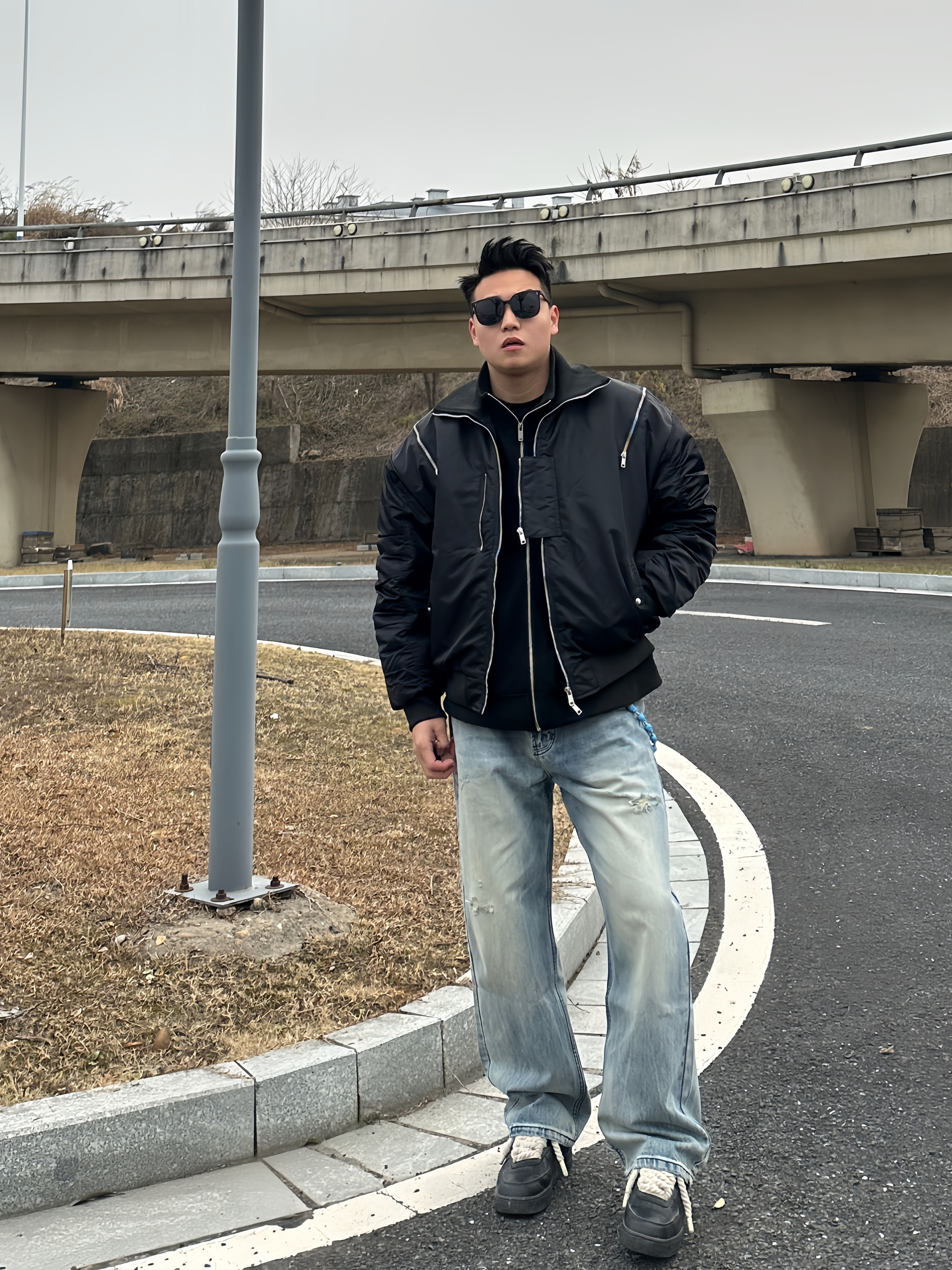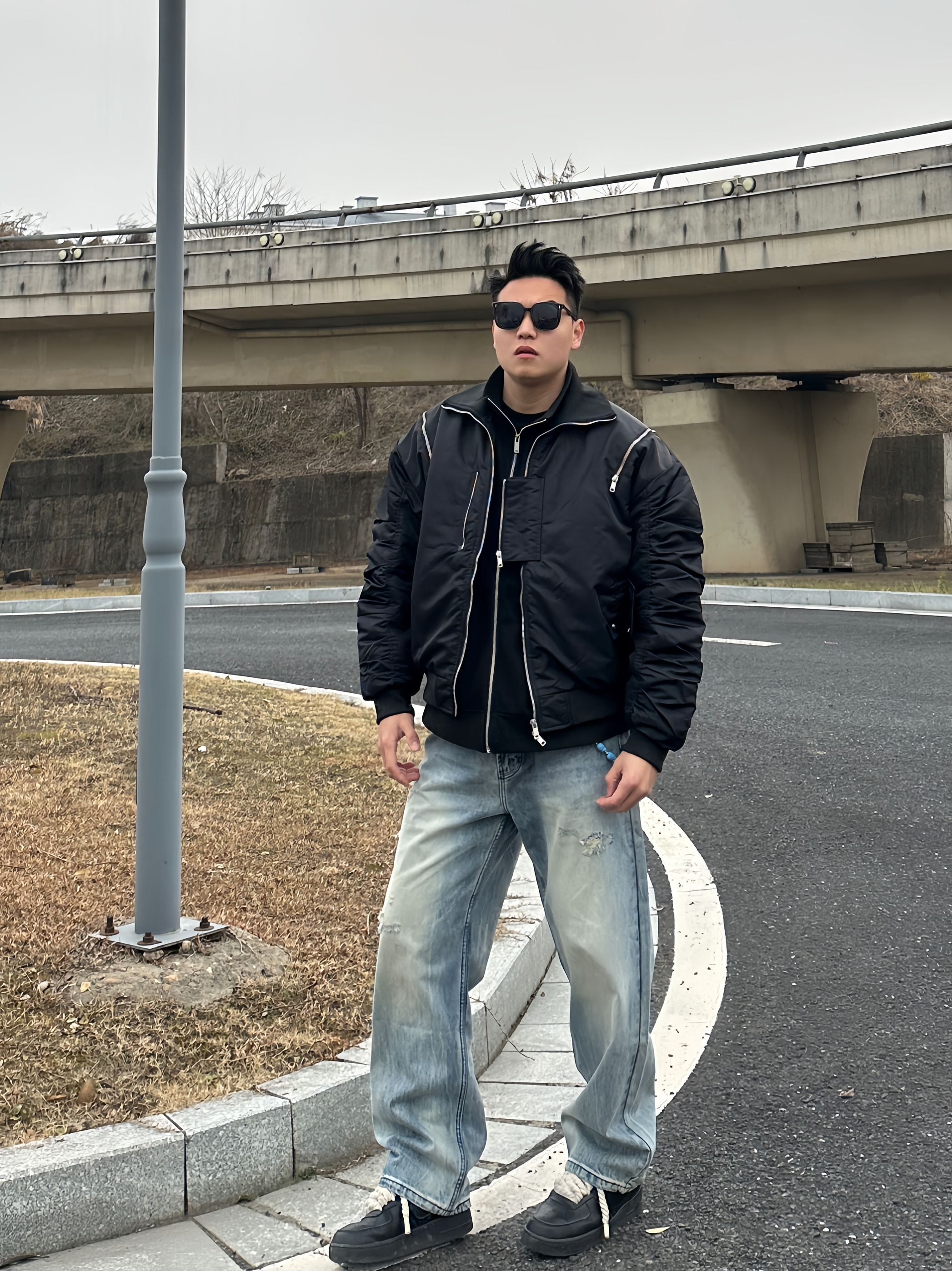 还在发愁怎么穿才够🆒帅? 试试这件bomber飞行员夹克 独特廓形,解构拉链细节超硬核。再叠穿一件夹克上身直接硬帅!!! 下身搭配一条破洞牛仔裤,随性破洞碰撞利落线条,硬汉气场全开,谁穿谁帅!