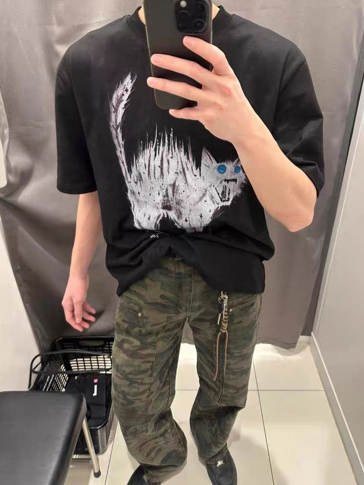 之前一直没尝试过嘻哈街头风 突然想到这么搭配其实也挺好看的 有个性又不失稳重 满足我校园生活和出门逛街的需求 Forever21美式拉链工装直筒迷彩牛仔长裤点亮你的生活 再搭配一件黑色短袖,就足够炸街啦 图源网络侵删