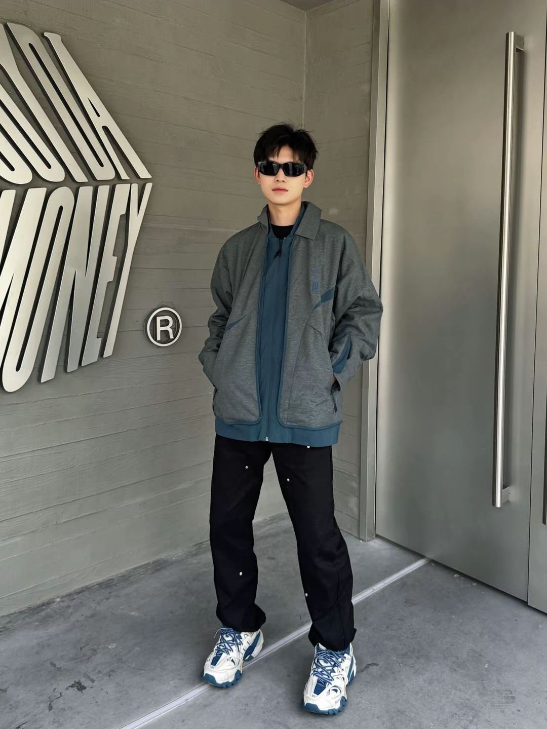 adidas 2024AW 运动梭织防风翻领夹克🍇 🍇最近舒服穿搭你get上了吗~正好入手了件拼接色夹克上身,蓝灰配色就很有质感。🍇身高172 体重50kg M码,裤子来一条黑色休闲裤。🍇鞋子搭配蓝色老爹鞋相呼应,🍇整体休闲运动风格就走起~图片来自于博主续澈不姓张