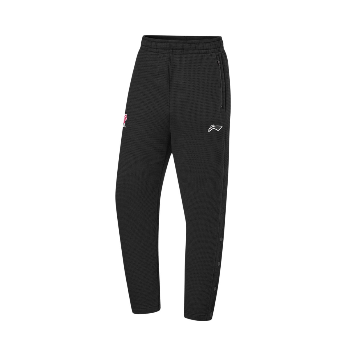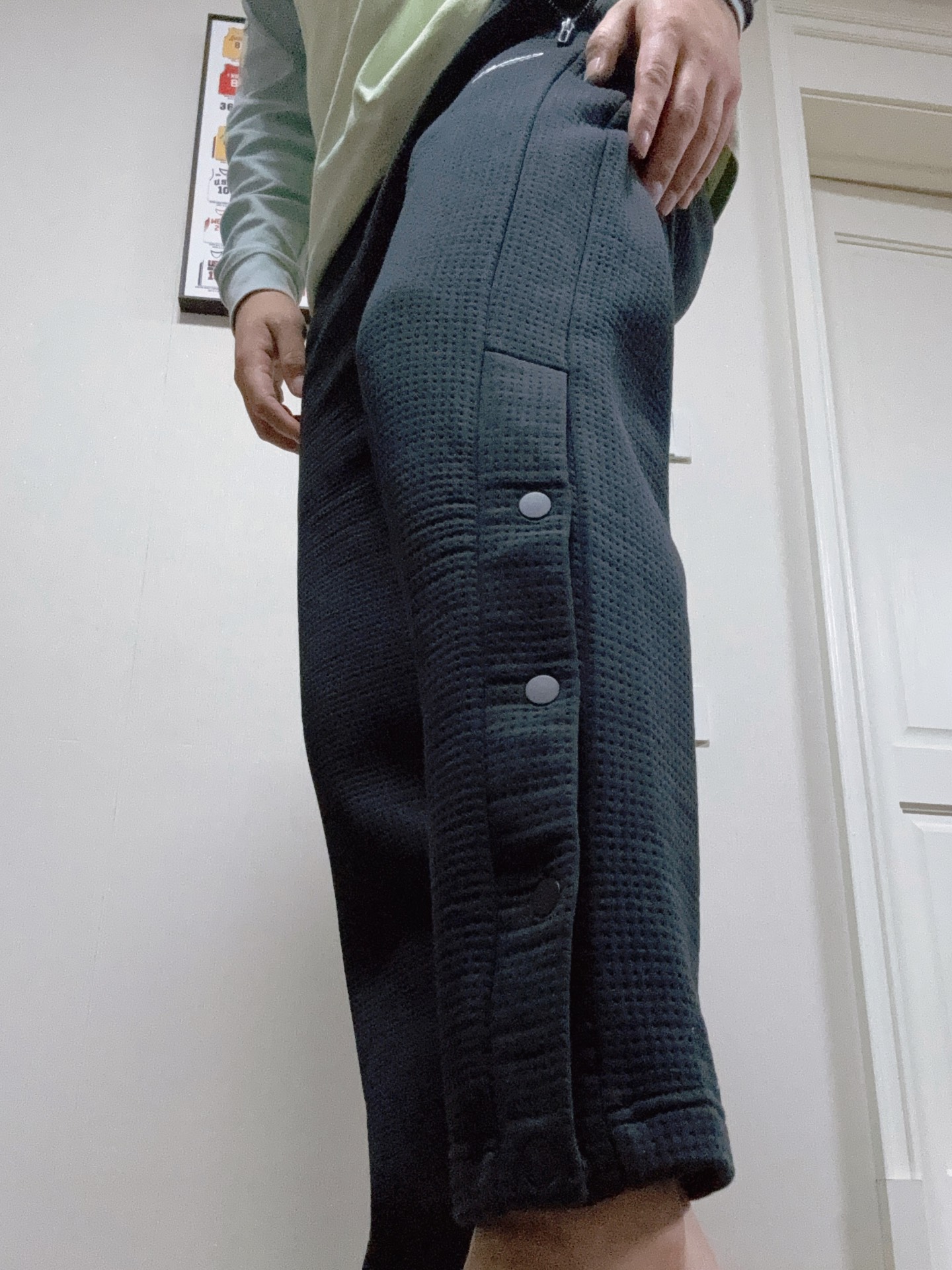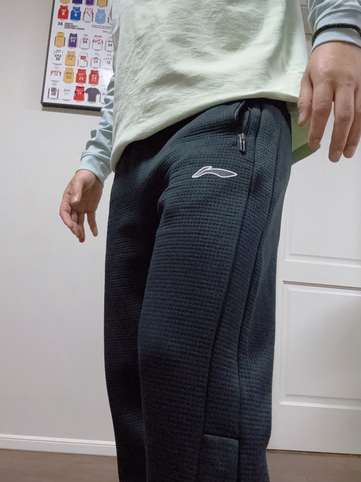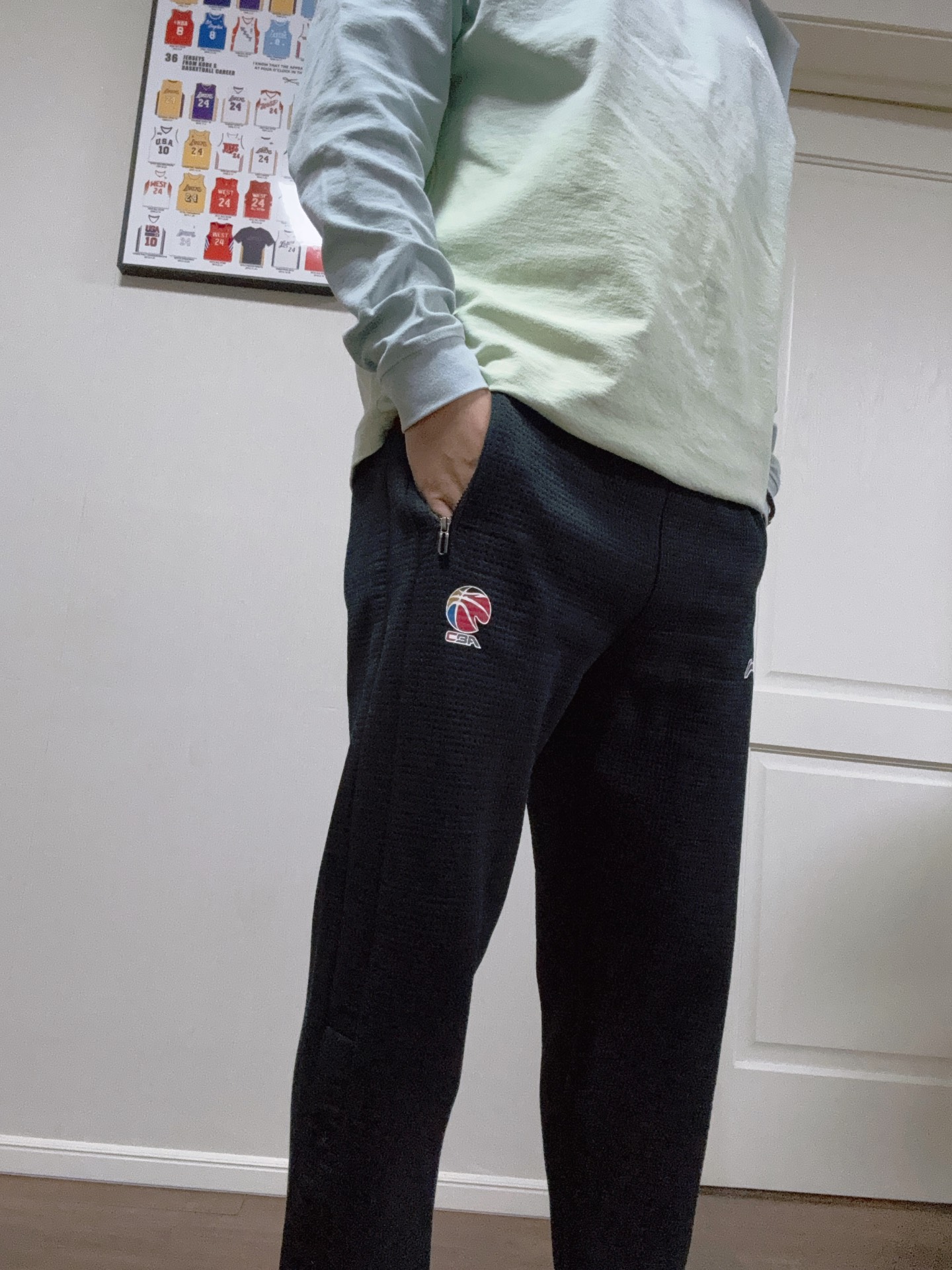 并不是一个纯黑色 而是一个比较偏石墨灰的颜色 裤子上有很多类似于孔洞的设计 材质很蓬松的单层 有一个李宁的LOGO 还有一个CBA的LOGO 两边腿下测有几个排裤的设计 但是并没有贯穿整个一排 就是下侧有几个排裤扣 还是挺特别的设计 样子是比较百搭的 出街运动皆可