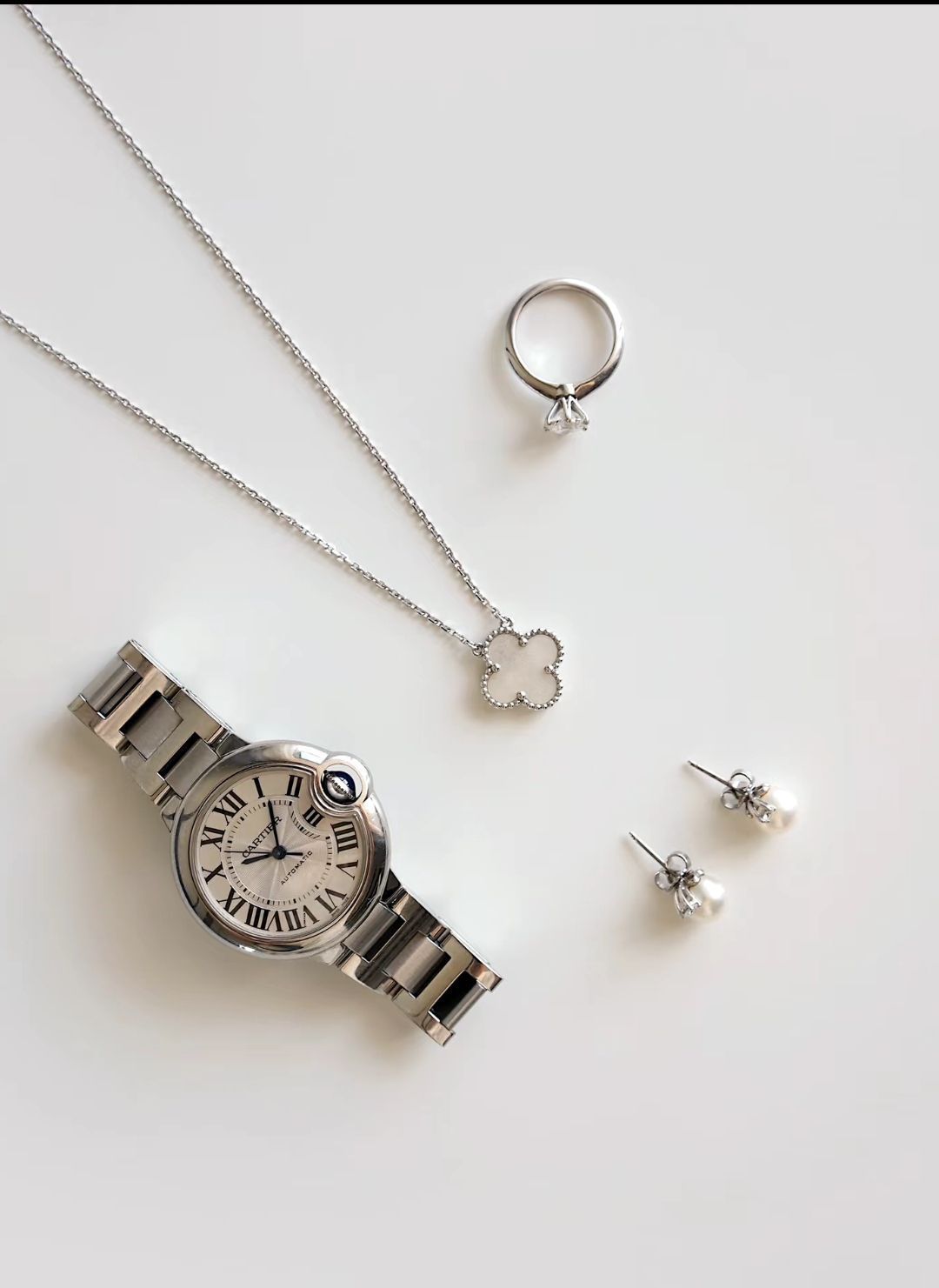 有点小钱的打工人|一周饰品搭配 新一周首饰搭配,日常不挑场合 经典腕表加上一点点精致的点缀 真的有意想不到的效果 . P1 ◽️Cartier蓝气球手表 基础款适合上班带,温婉精致 ◽️VCA白金项链 白贝母四叶草,干净精致 白金项链自带清冷氛围 ◽️Tiffany钻戒 搭配一套同色系首饰,舒适感十足 ◽️Tiffany珍珠耳钉 精致细腻,小小点缀日常优雅氛围 . P2 ◽️Jaeger-Leco...