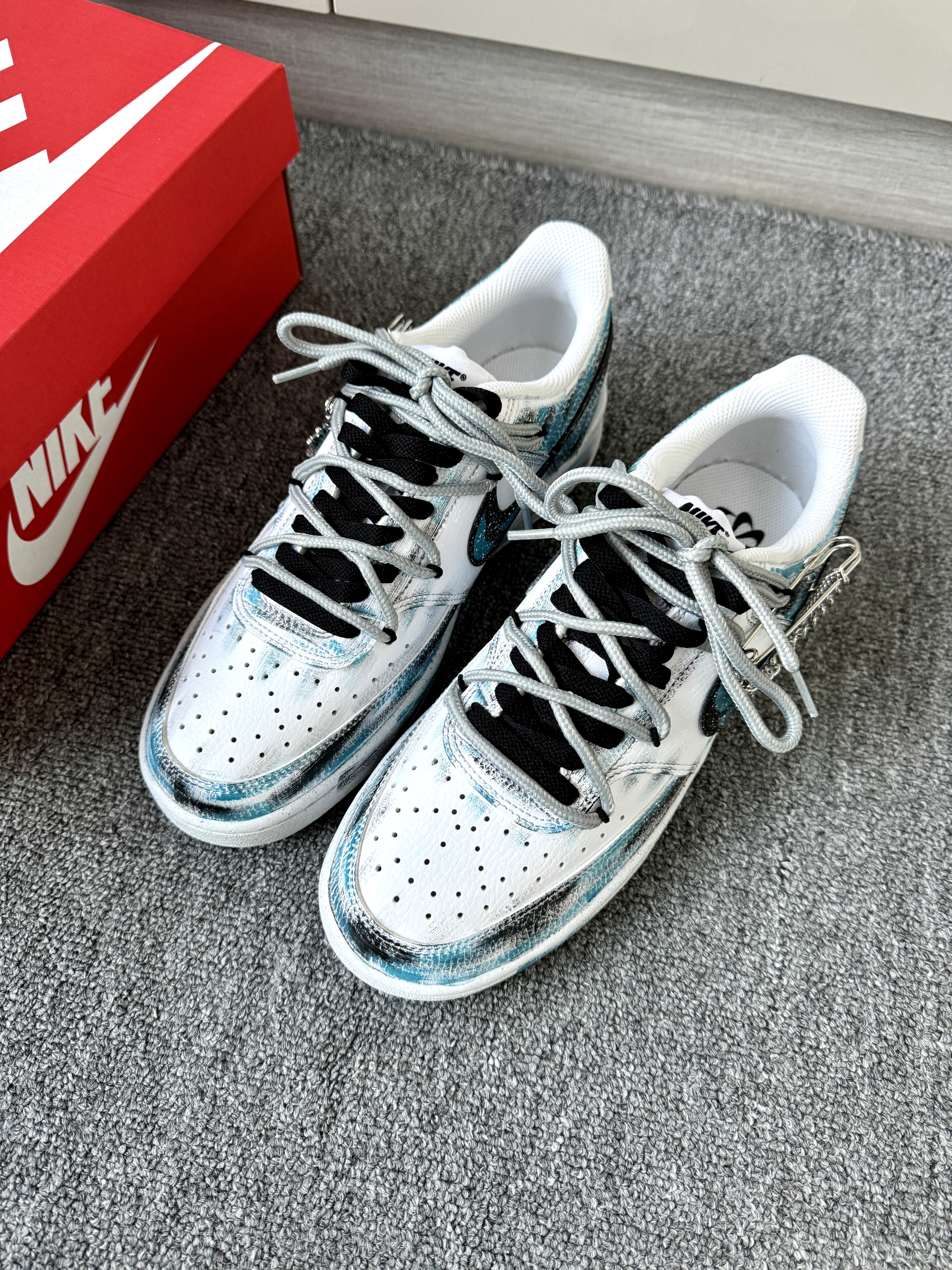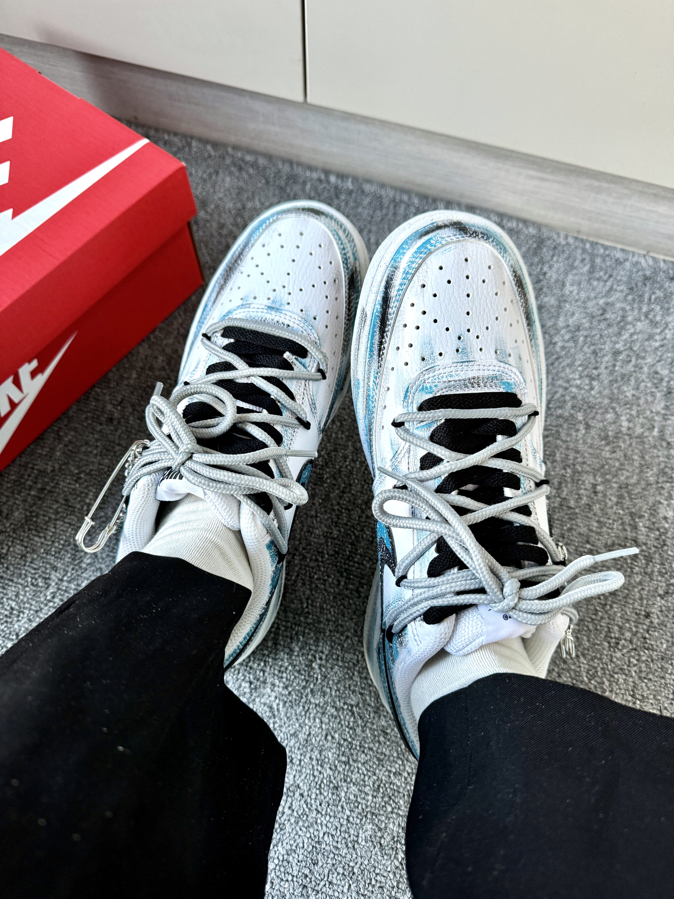 鞋子整体框架白蓝配色穿插着擦久黑感 看上去有一种幽灵风 而且还是双鞋带设计 增加了鞋子的层次感 鞋子侧身还带有别针🧷小挂件 看上潮酷哦 小板鞋穿起来脚感偏软 主要是穿起来鞋鞋hin轻便 日常搭配黑色休闲裤合作拖拉裤都不会错哦