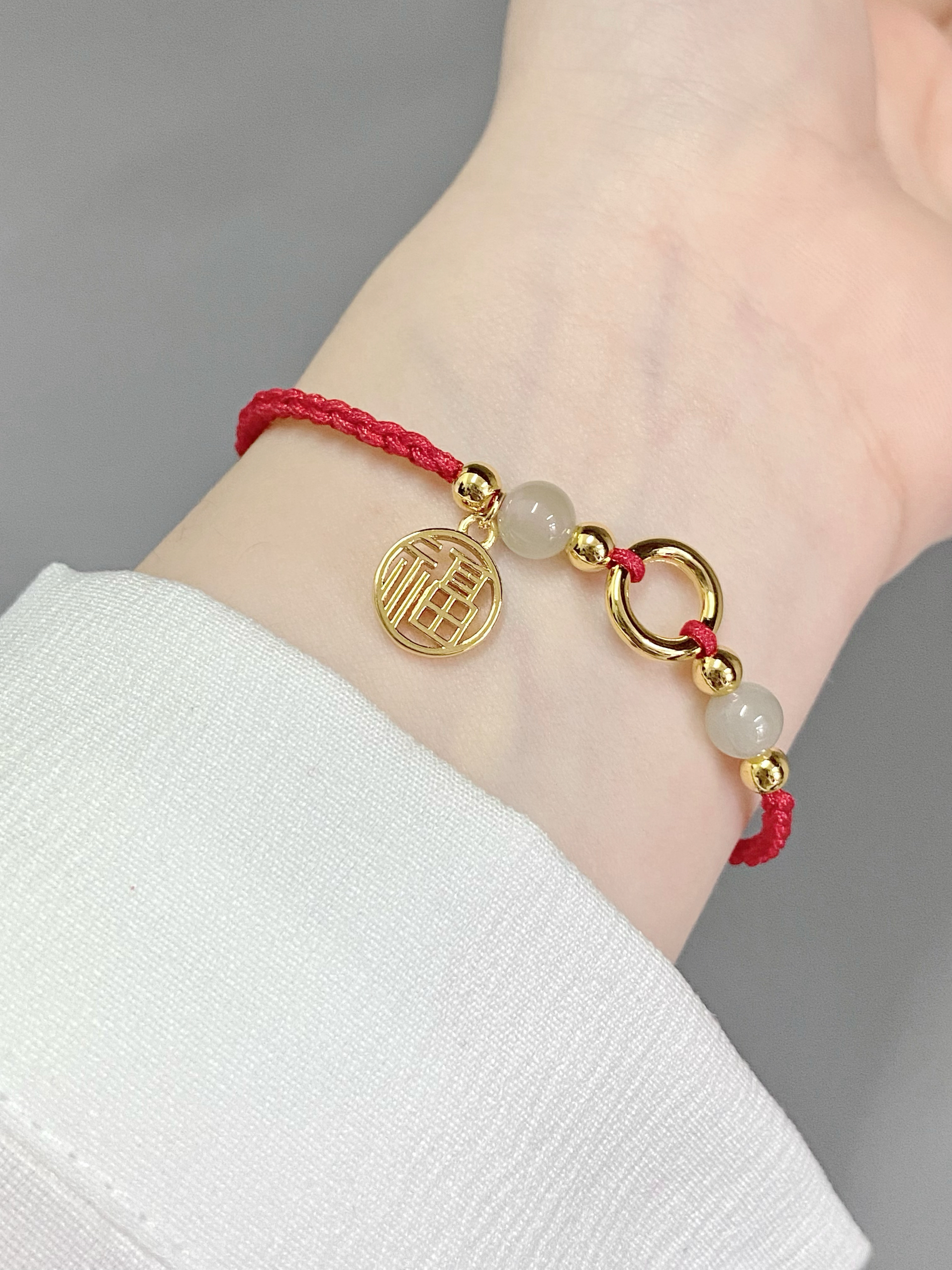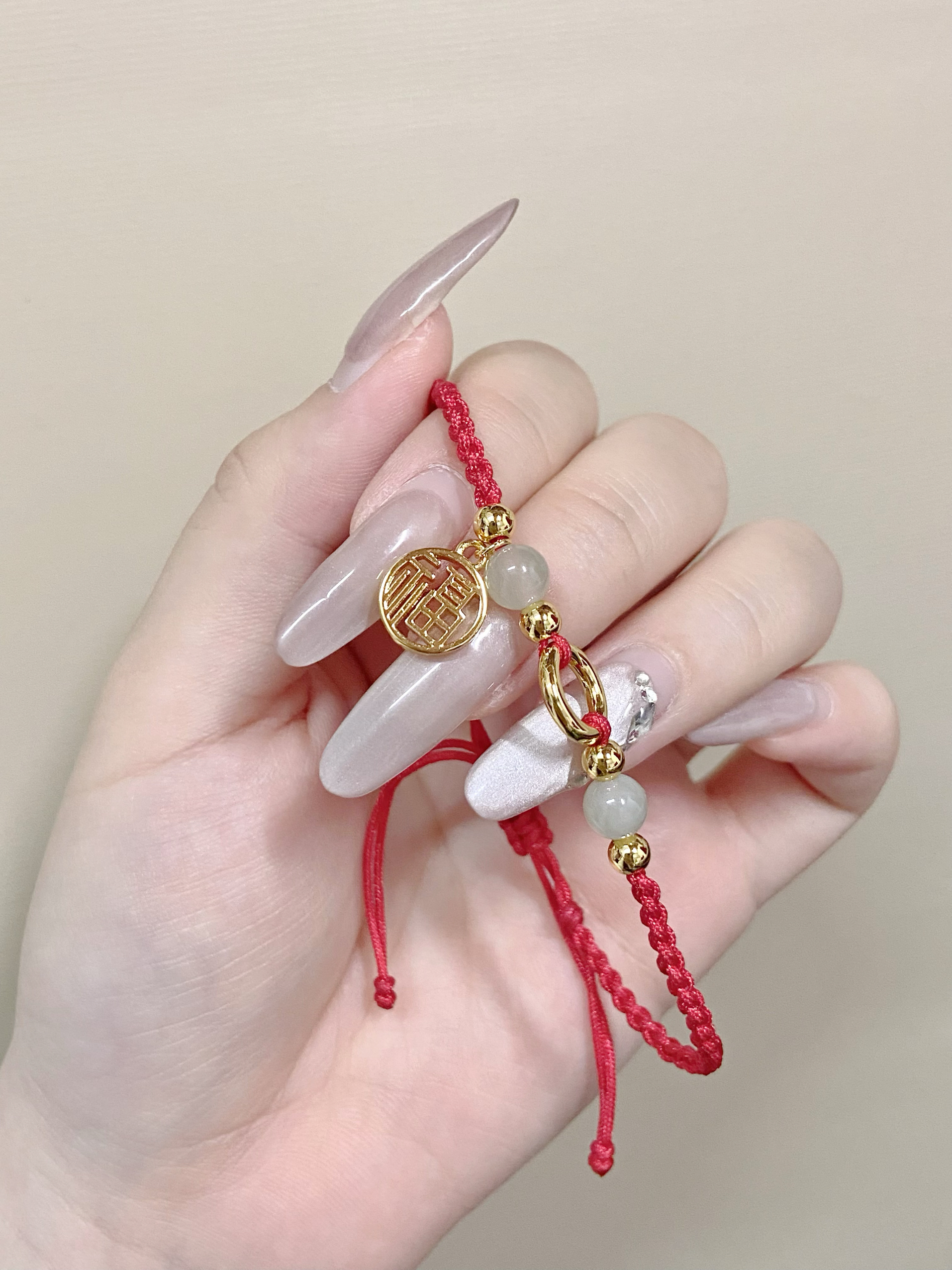 20岁也能拿下小克重黄金了! 红绳戴在手上太显白了 平安扣相接着小金珠 和田玉 小福牌 细节设计真的挺用心的 寓意平安如意 福气满满 这条选的好 已经被妈妈夸过好几次了