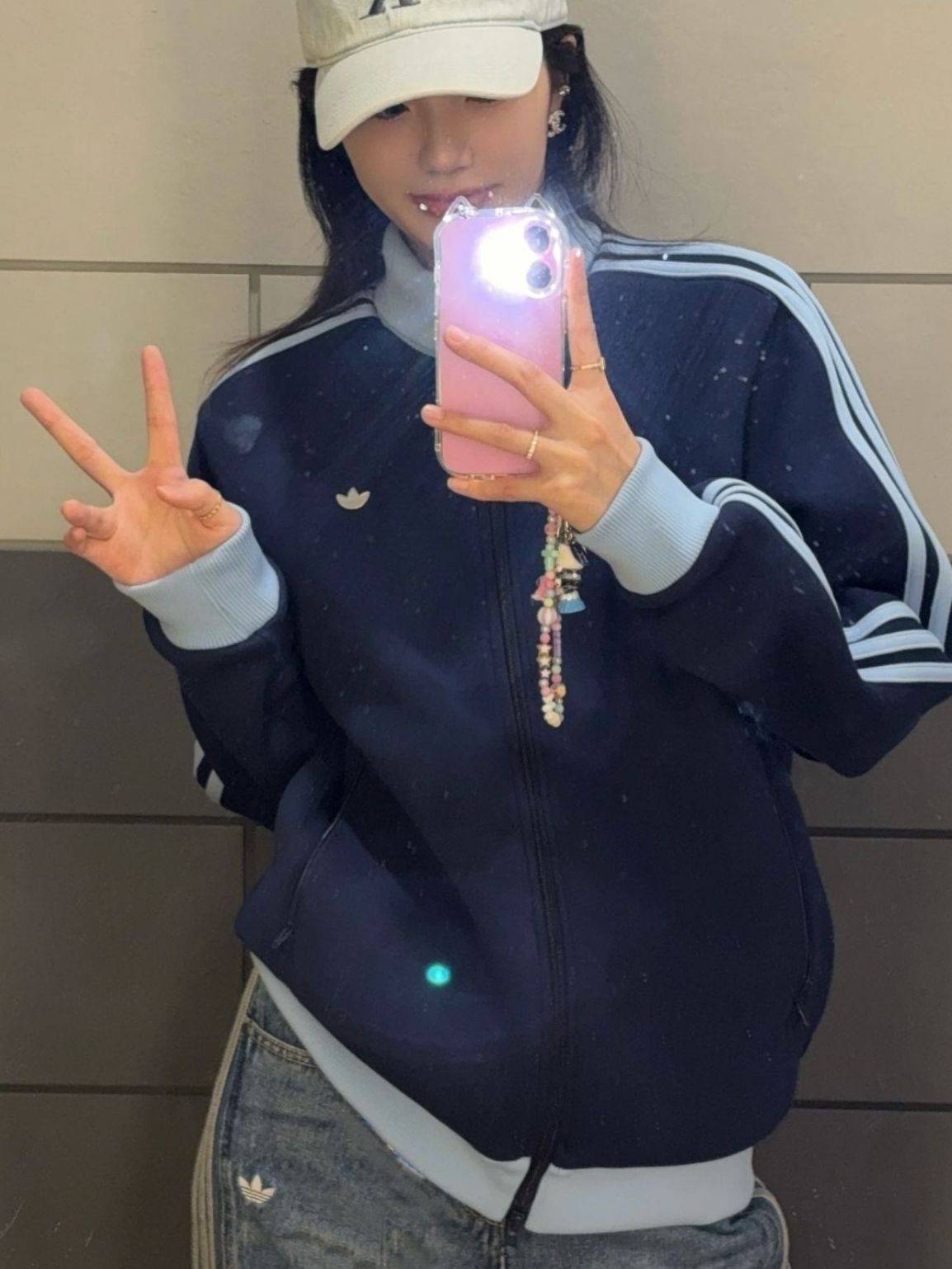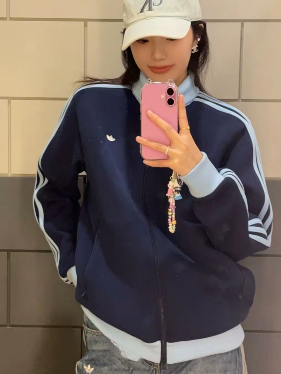 这件外套是Adidas Originals系列,太空棉的面料很舒服柔软 藏蓝色高级又修身,左侧胸前刺绣设计三叶草 logo极简又高级。 藏蓝天和蓝色的撞色设计,不仅时尚还复古,搭配牛仔裤完美 图源网络侵删