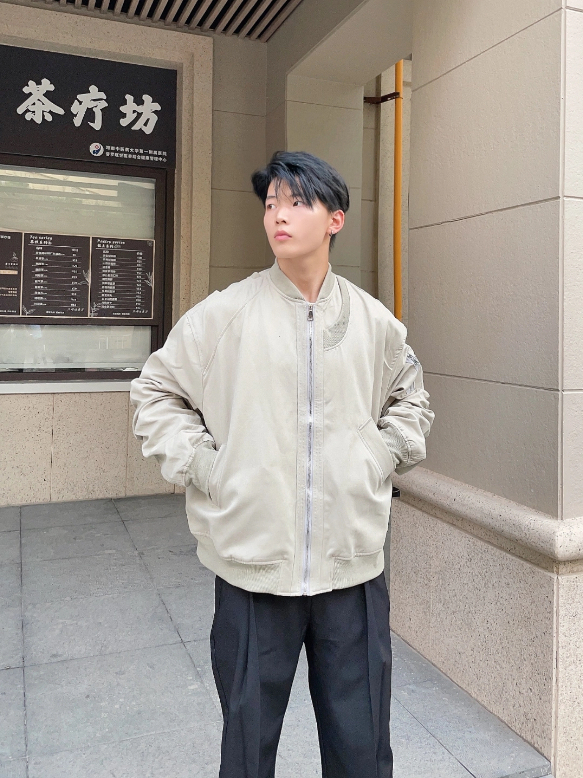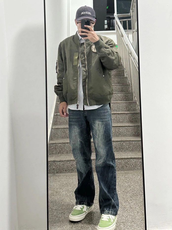 军绿色🍀飞行夹克真的显白又好看! 经典的版型完全不挑人~ 里面随便叠穿一件衬衫或者卫衣都很好看 裤子可以选择宽松百搭的水洗蓝直筒牛仔裤👖 上身很显瘦! 一套简简单单的穿搭 青春有活力✌🏻️ 就很适合开春男朋友日常去穿 (图源网络侵删)