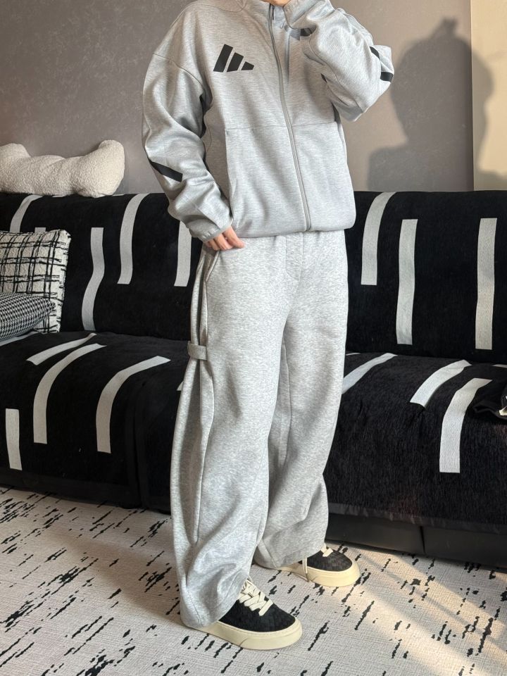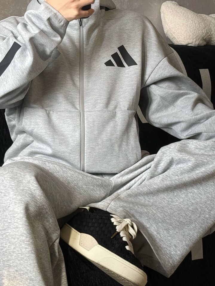 上衣选择一件浅灰色的连帽开衫卫衣 不得不说 灰色卫衣是真的百搭呀👍 也很适合春天穿 克重足 穿在身上也有型🤟 再冷一点可以当内搭 外面再套一个外套 裤子同样选择灰色的运动裤 直筒宽松的版型 裤腿两侧的小设计也很好看✌️! (图源网络侵删)