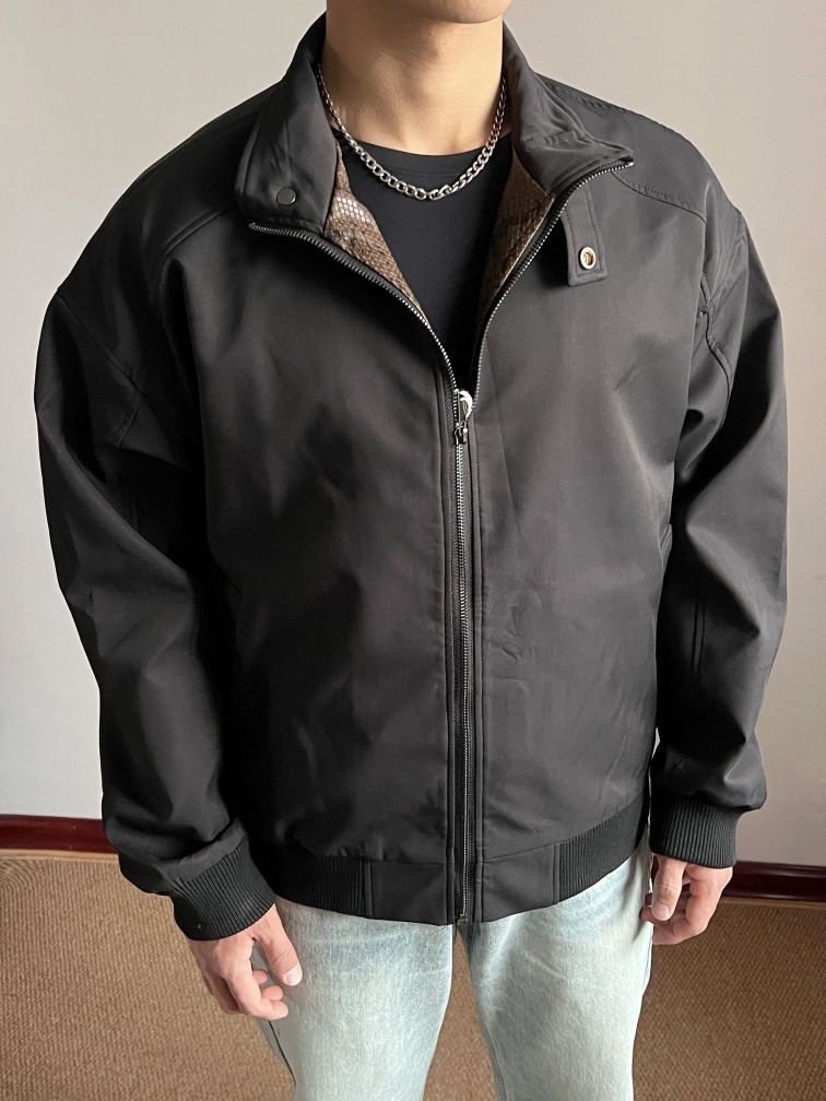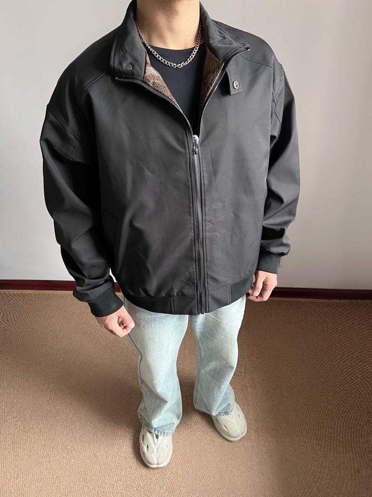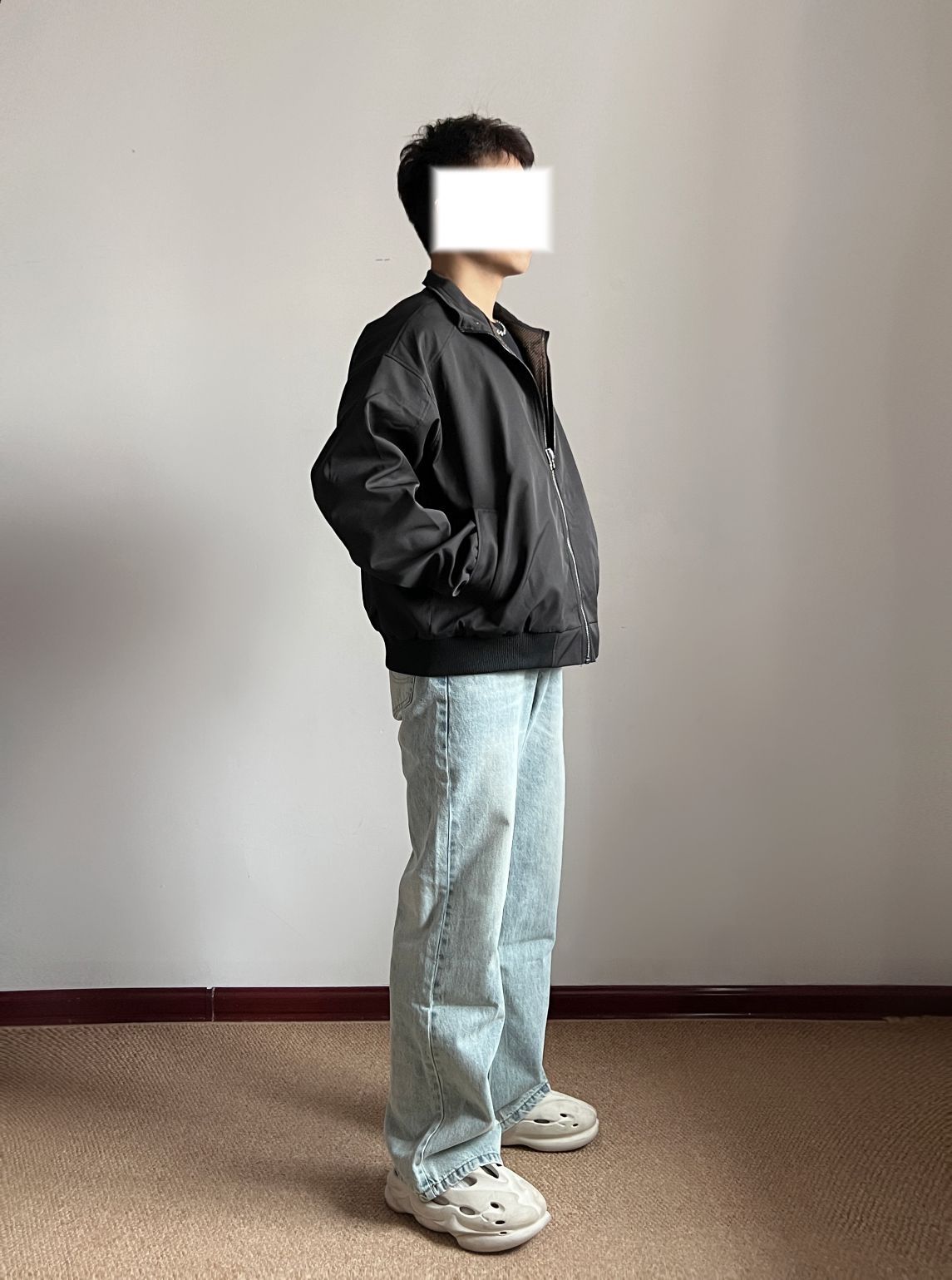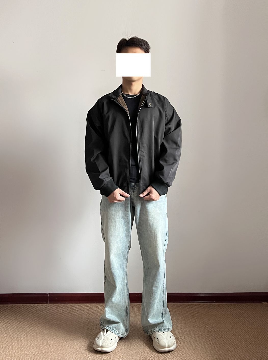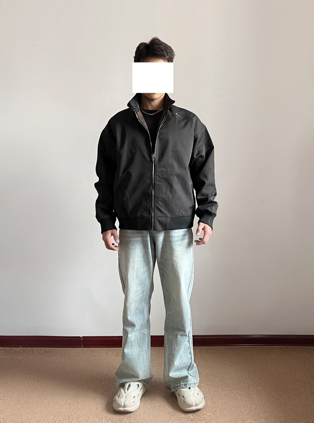 👔:立领美式夹克外套 👖: 冰蓝色微喇牛仔裤 👟:EQLZ休闲拖鞋