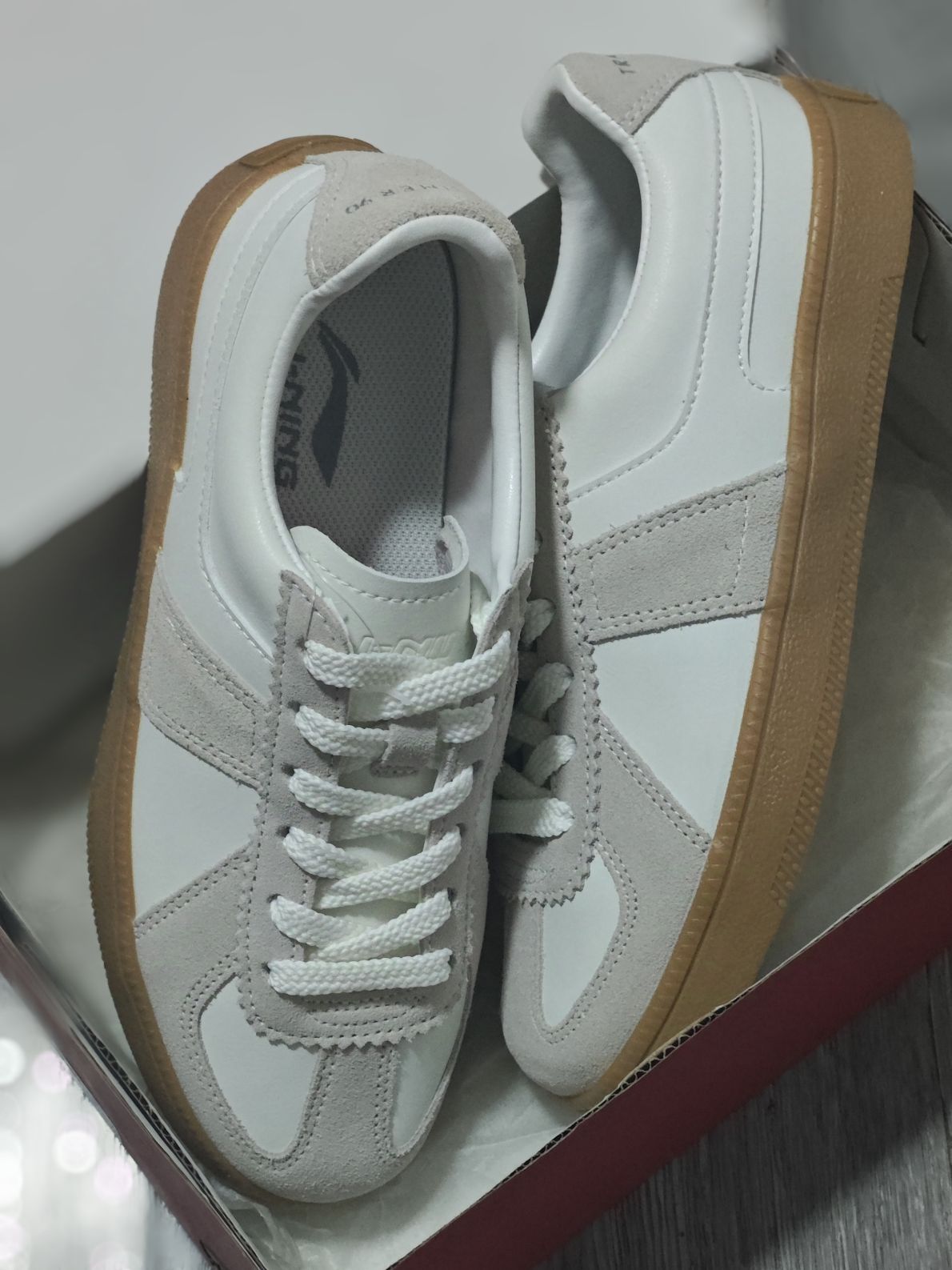 🤩这应该是李宁卖的最好的一款德训鞋了,第一眼看到就很惊艳这个复古的质感😳 📷鞋面是由灰色的麂皮和米白色的光面皮革,再加上一个棕色的生胶大底,属实是吧复古感拿捏了。 🥳虽然跟只有两厘米,但是鞋垫真的很软,上脚很百搭,脚感也很好。日常通勤压马路不要太舒服❗ 现在平台上价格只要1xx,这个价格❗这个质感❗性价比真的太高了❗