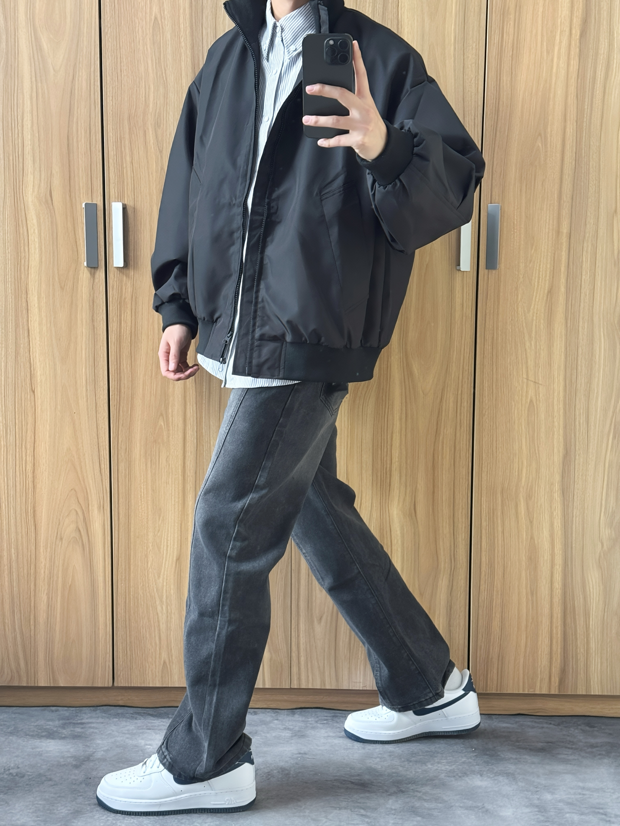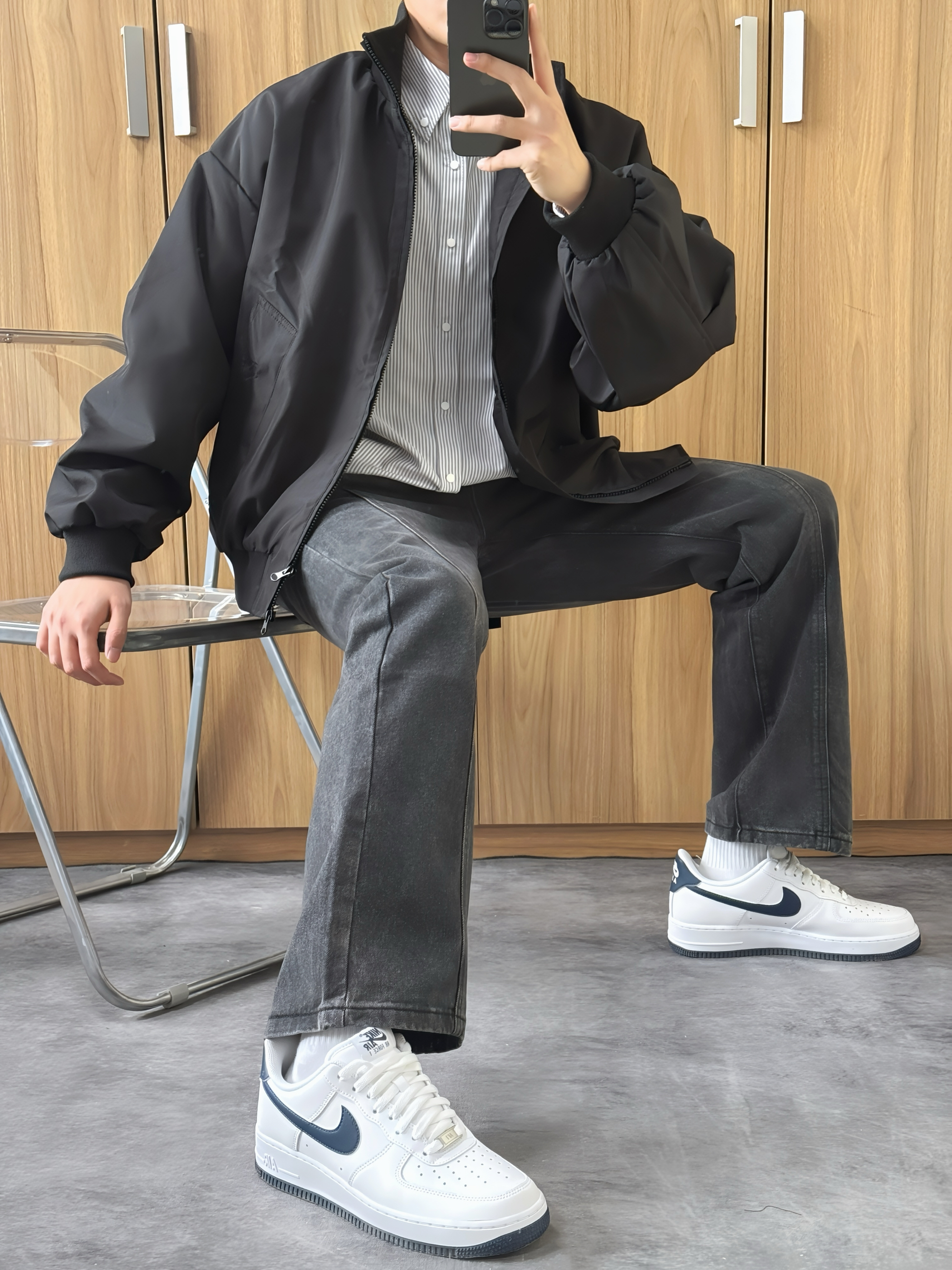 今日份出街穿搭look 条纹衬衫➕廓形短款外套 春天就是穿外套的季节 再搭配一条黑色牛仔裤 白蓝色板鞋与衬衫相呼应 这一身休闲又有街头感 包帅的