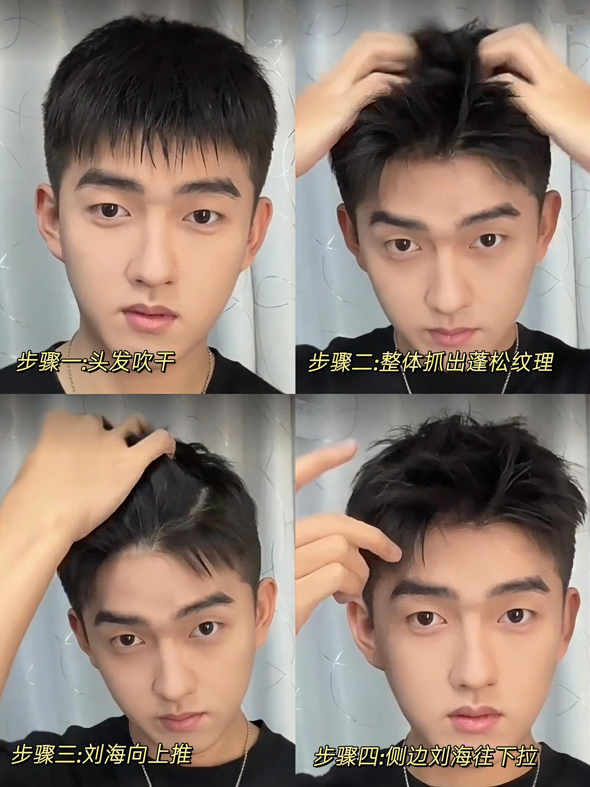 出门之前特意照了个镜子,发现今天这发型抓得是真不错 就拿我今天抓的三七侧背为例子吧,简单跟大家说一下抓发流程 建议把头发吹半干就好,方便后续造型 整体抓出蓬松的纹理 前面刘海由发根向上推 侧边刘海捏一撮向下拉 最后调整一下细节就好了定型喷雾