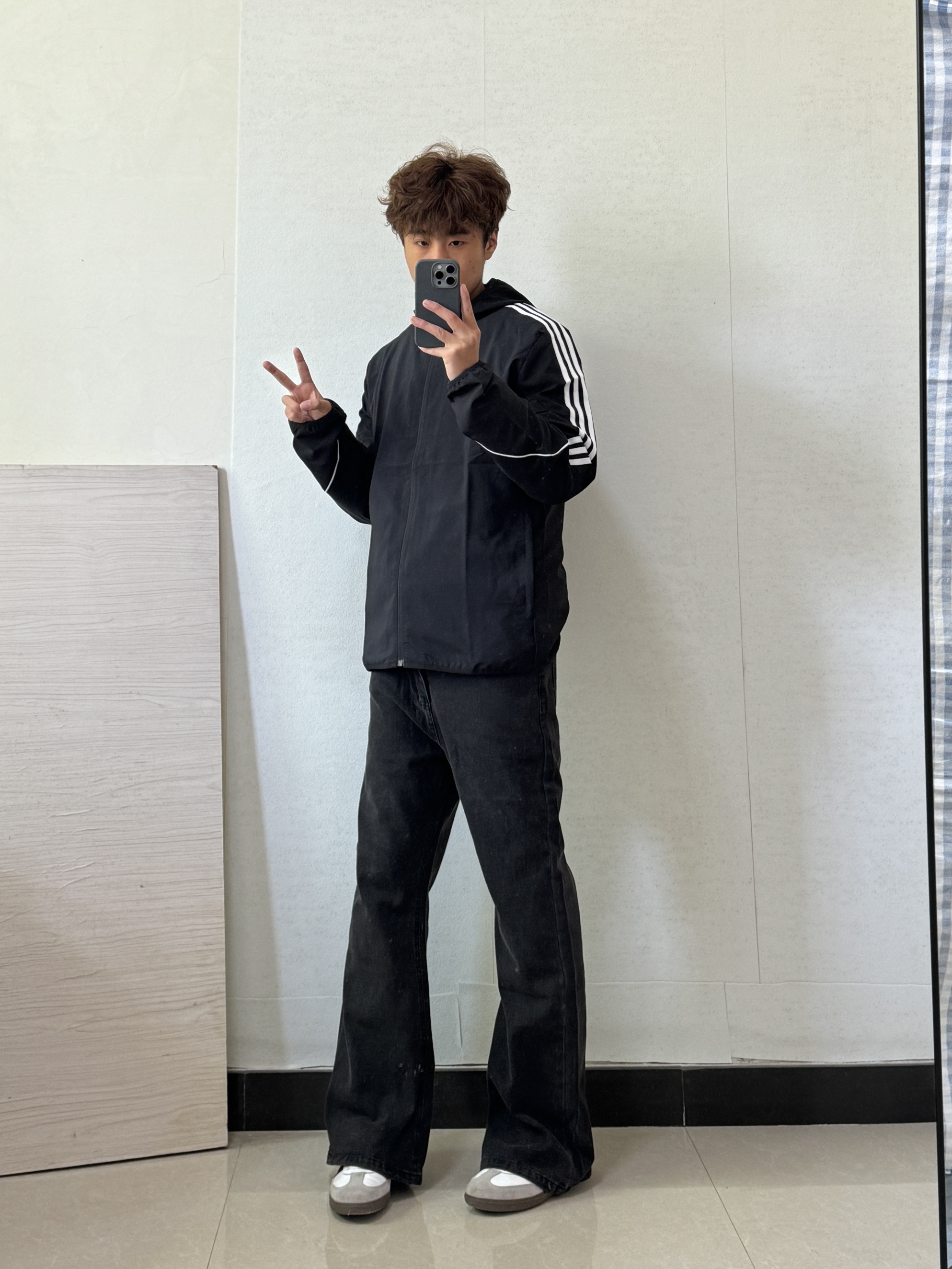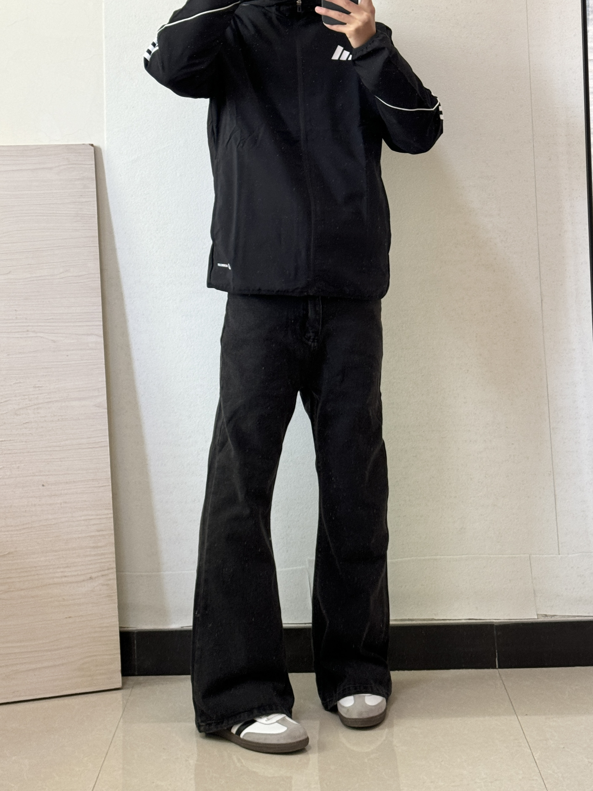 这样搭一身帅的 阿迪外套配阿迪德训再加微喇裤修饰腿型 早春这样搭帅帅的 我是180,110斤外套穿的L码