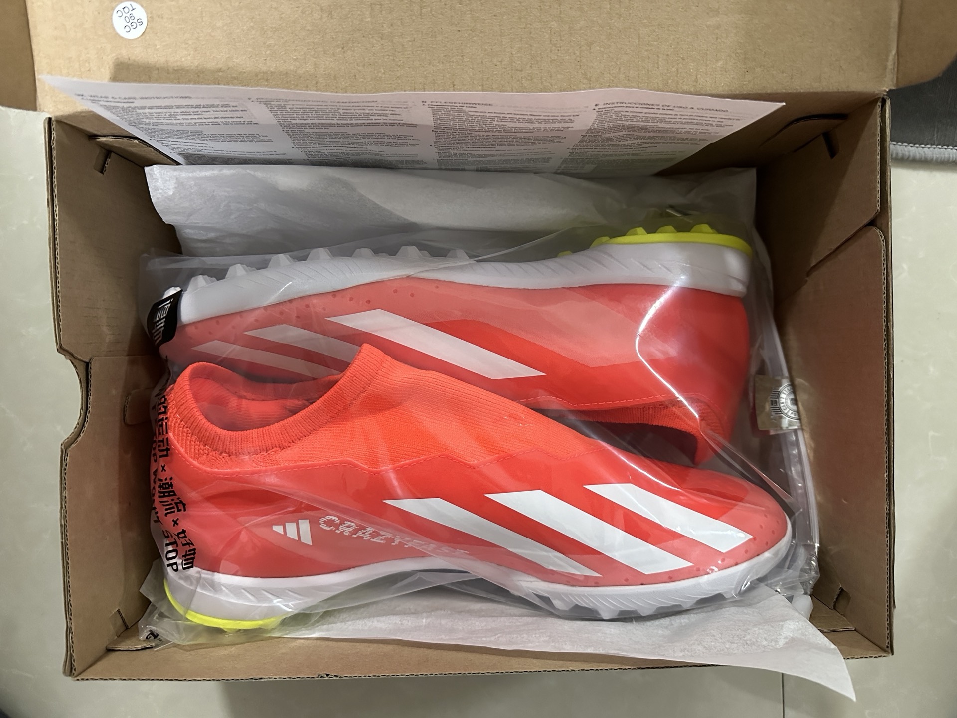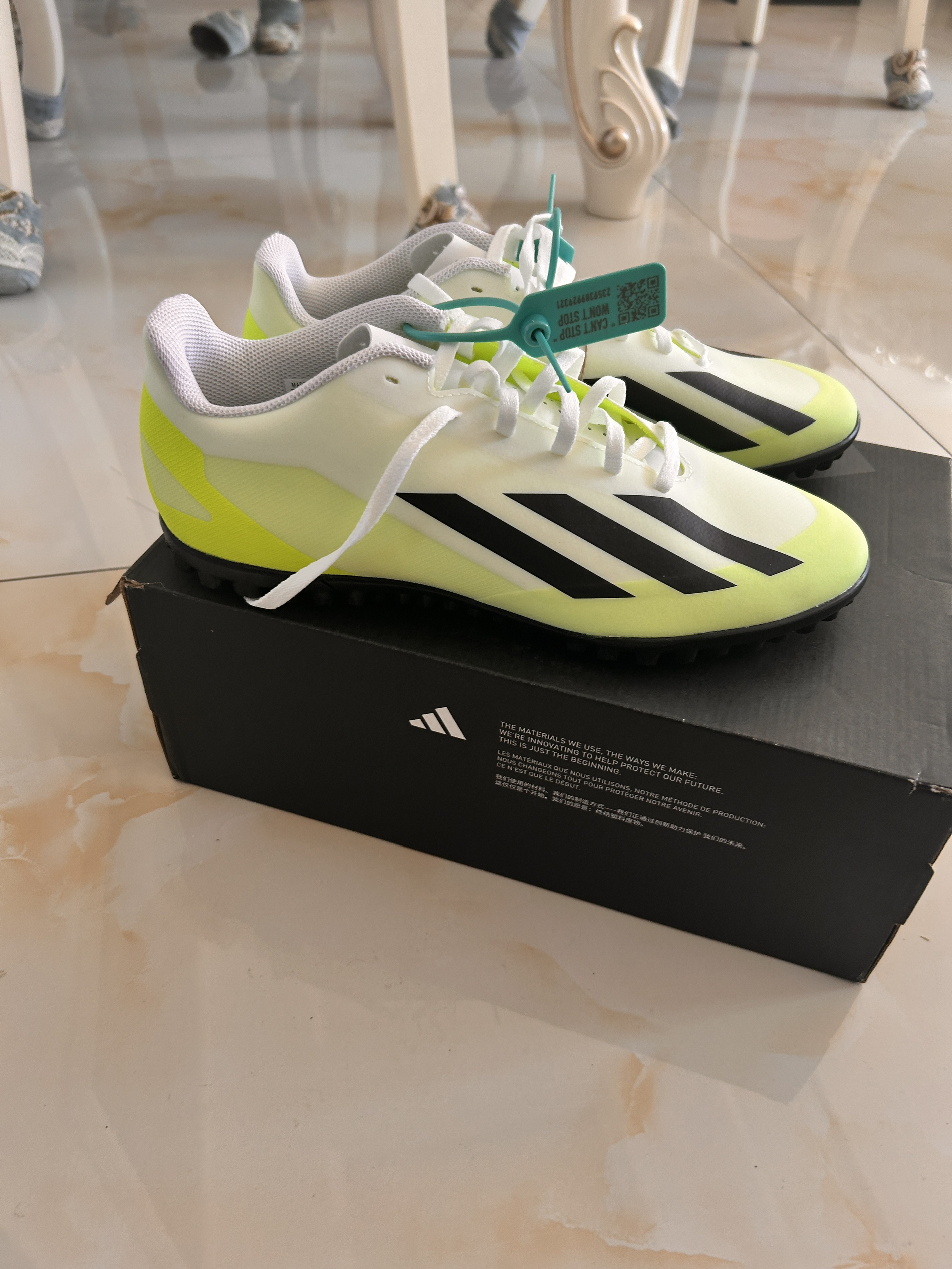 颜值:首发配色是比较清新和夏天的,个人觉得穿白袜上脚会不错。 鞋面:鞋面整体触感像塑料膜,非常的薄,轻量化做的不错,摩擦力中,主打还是一个轻薄。 Size:刺客穿42的脚穿这个鞋42码偏大,穿41.5合脚。对宽脚者的宽容型会好于前几代X系列,包裹感很强。 购买推荐:本次crazyfast.1系列带来了FG,AG,中国AG和TF四种大底,建议大家根据实际场地在AG和TF中做选择